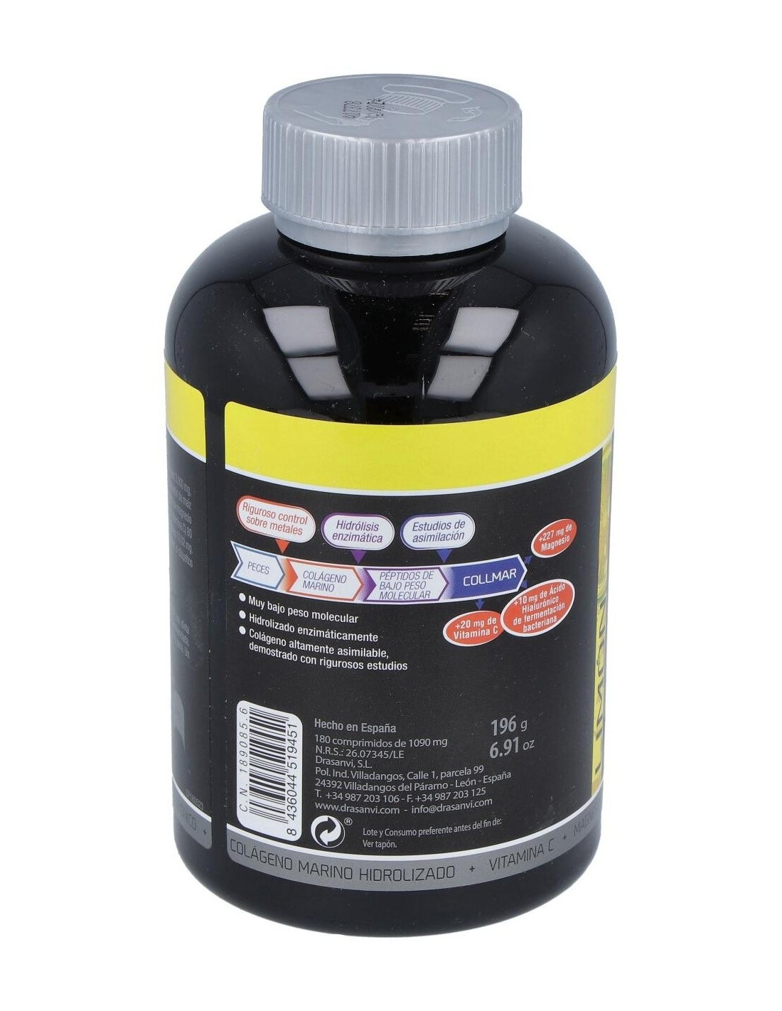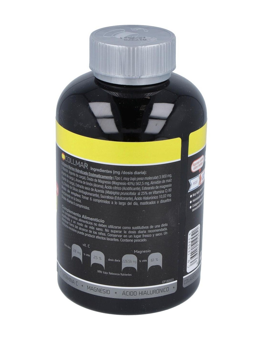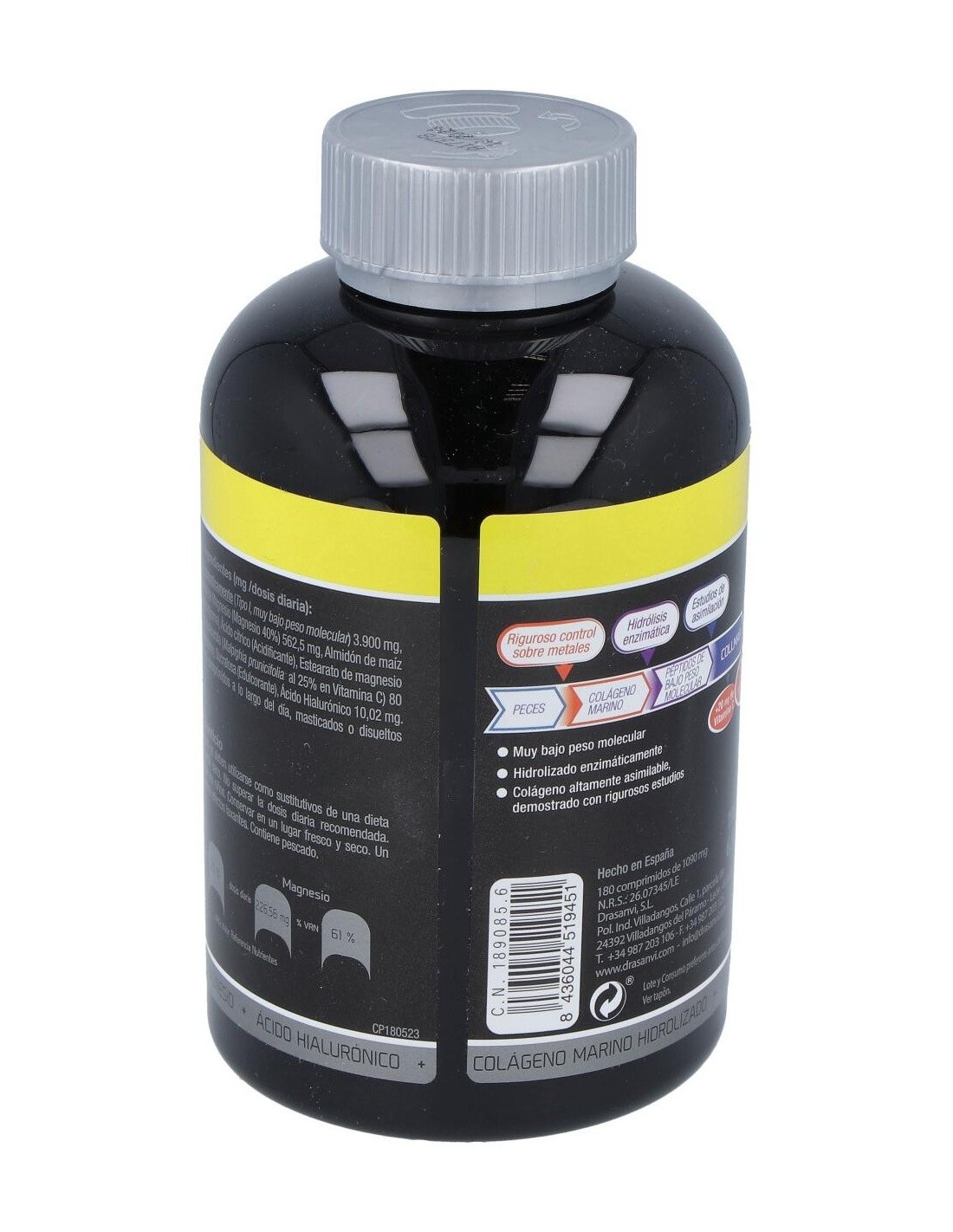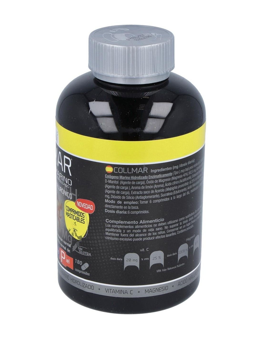 Con Colágeno Marino Hidrolizado enzimáticamente, Ácido hialurónico, Magnesio y Vitamina C, que contribuye a la formación normal de Colágeno para el funcionamiento normal de cartílago, huesos y piel.