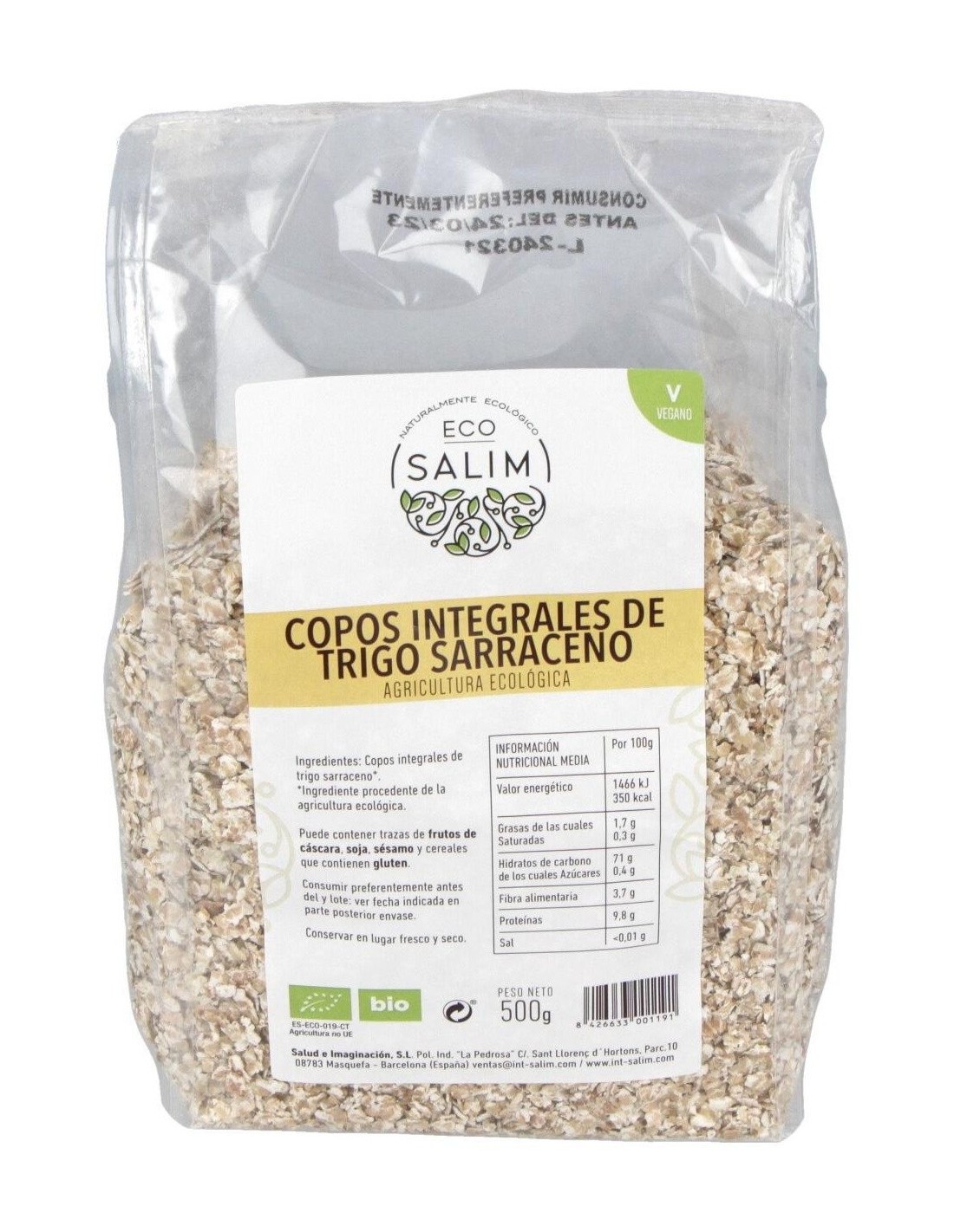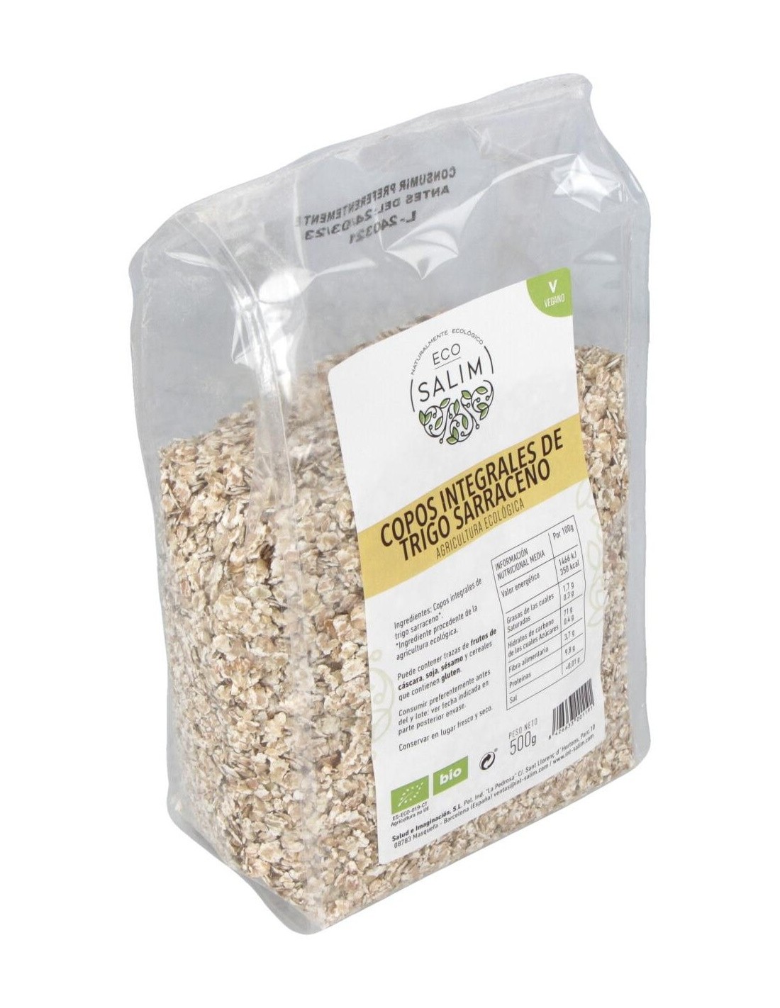 Copos integrales de trigo sarraceno de Int-Salim (empresa de alimentación saludable). Este producto sirve para elaborar diversas recetas de comida según la preferencia del usuario: galletas, tartas, crepes, etc. Múltiples beneficios se le atribuyen al trigo sarraceno. Por ejemplo, se trata de un alimento rico en proteínas. Tiene a su favor vitaminas (como la E, B1, B2, etc.) y minerales (potasio, fósforo, calcio, etc.). Algo también particular del trigo sarraceno es que se trata de un alimento rico en fibra, lo cual ayuda a personas que se encuentren en pérdida de peso por su efecto saciante. Es apto para personas veganas. Puede contener trazas de frutos de cáscara, soja y sésamo, así como de cereales que contengan gluten; de tal modo, tener precaución por las personas alérgicas a estos componentes.