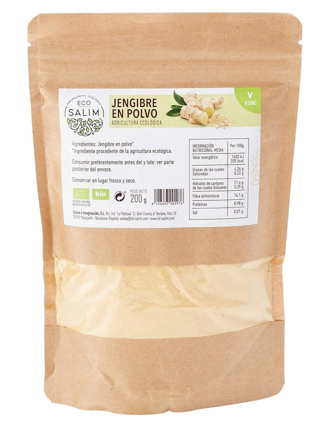 ECO SALIMJengibre en polvo ecológico presentado en un envase de 200g. Puede agregarse a postres, galletas, guisos, salsas, panes, etc.