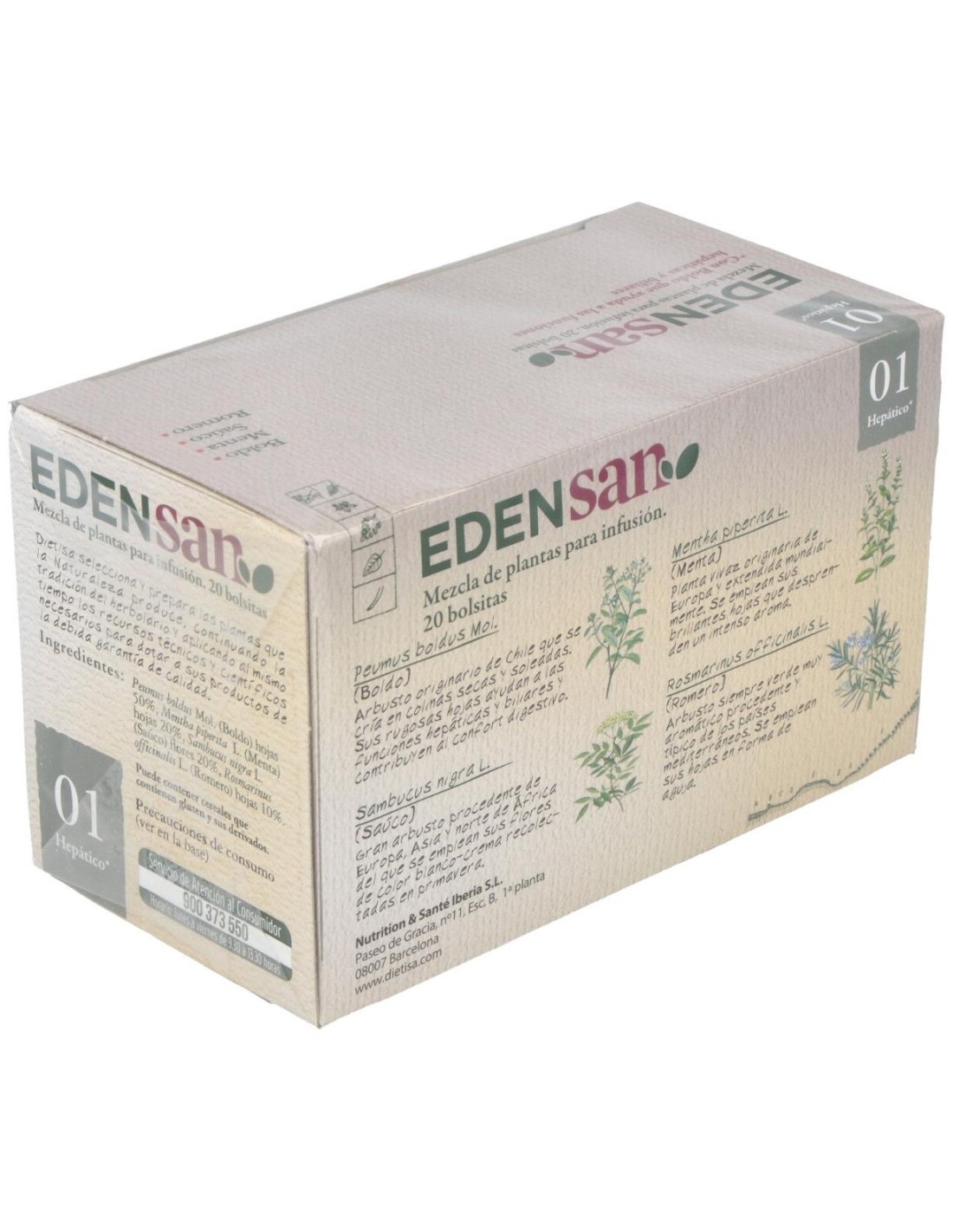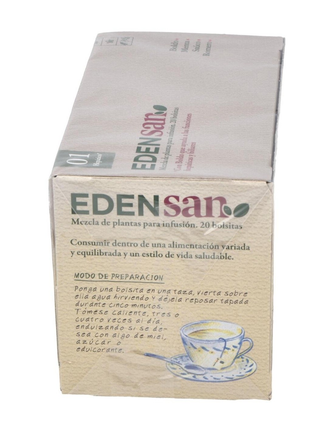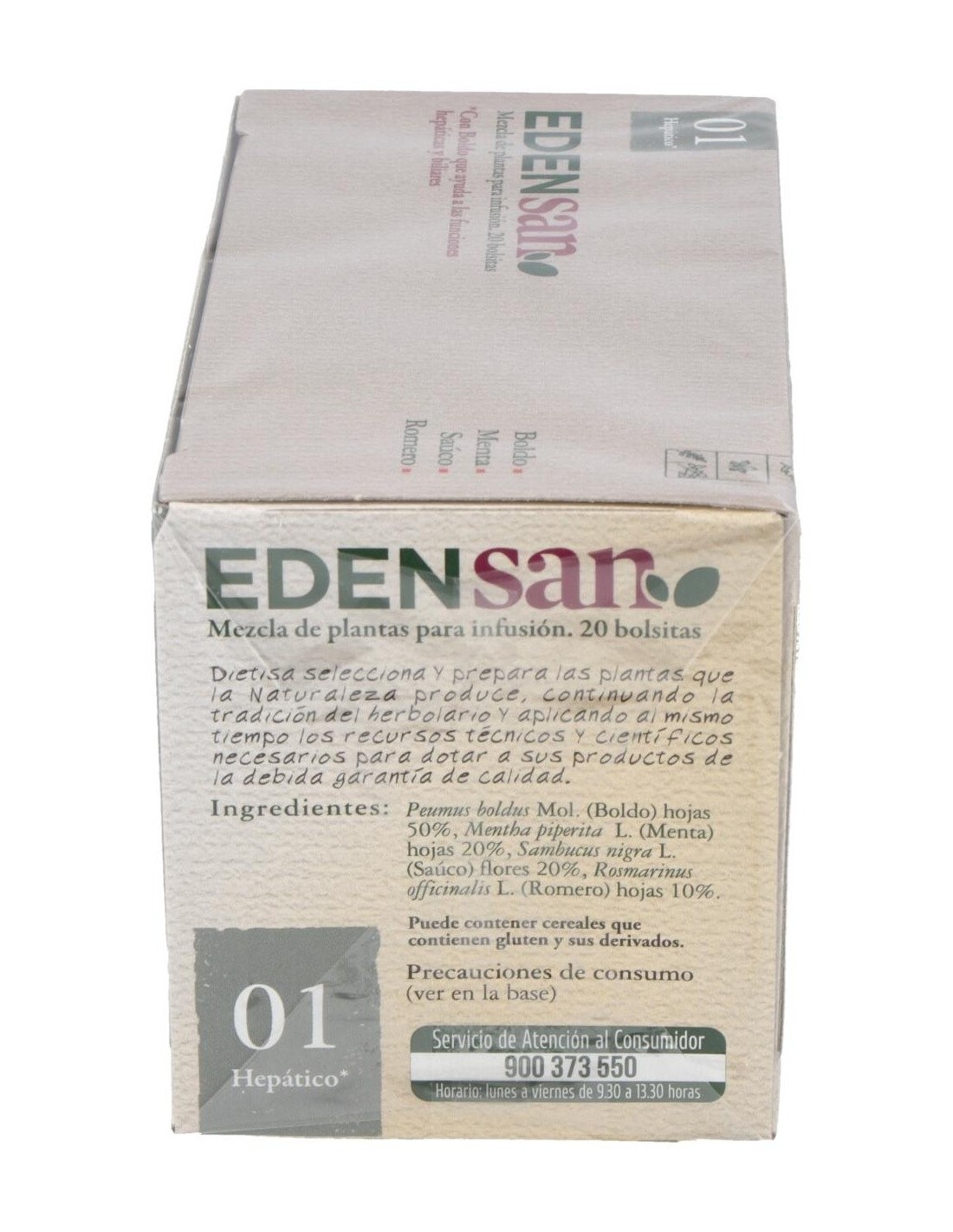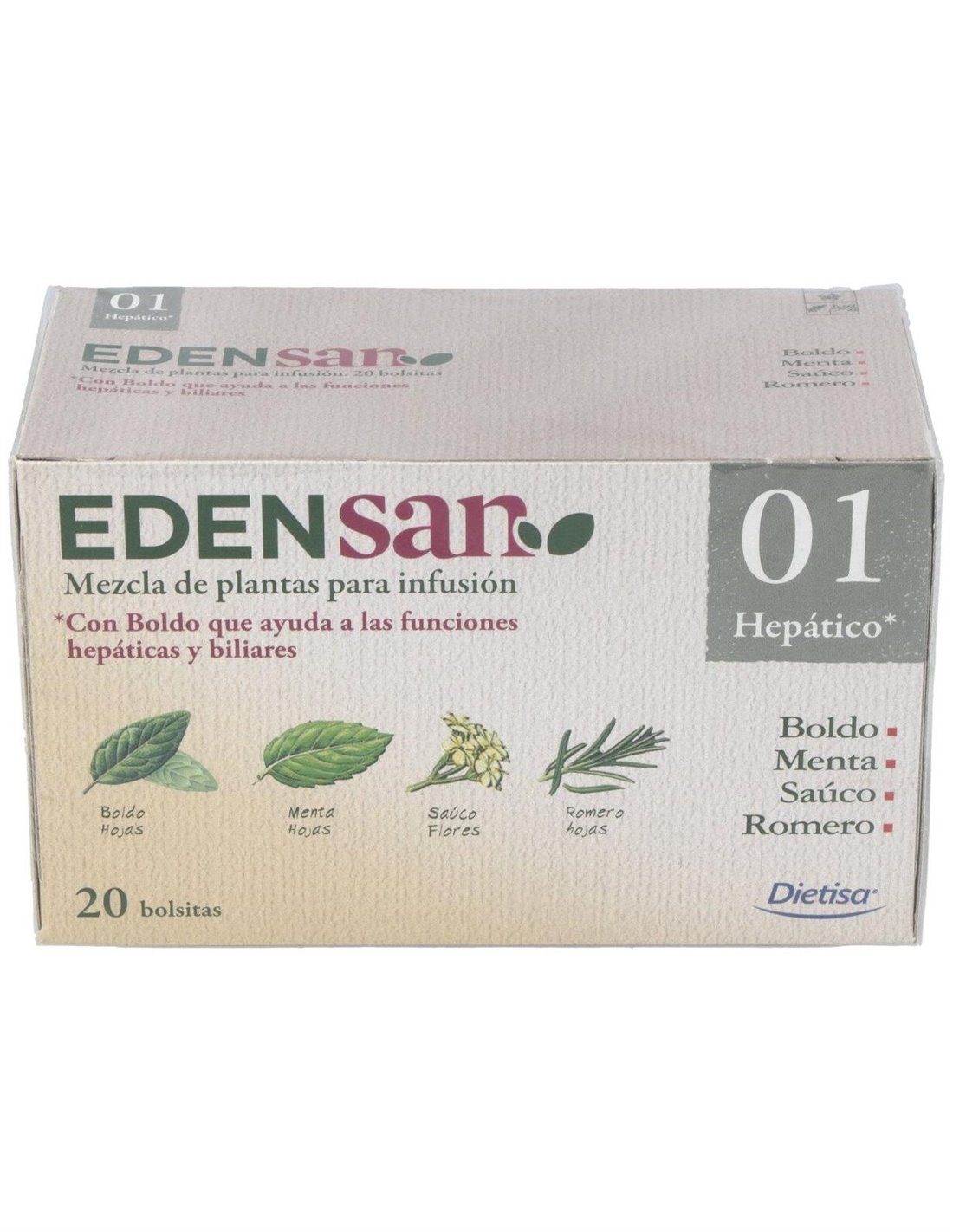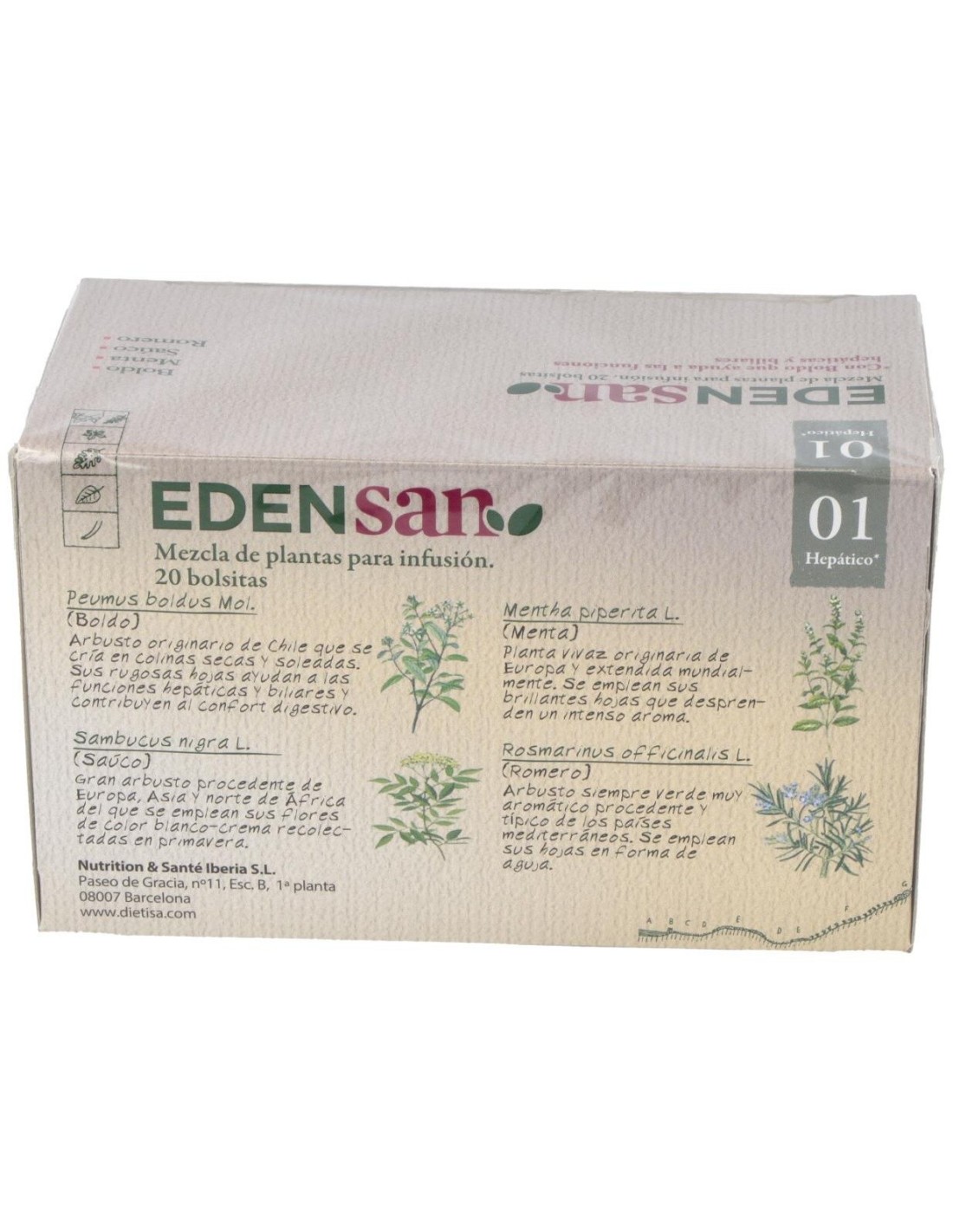 EDENSAN®Edensan 01 Filtros Infusiones 20Uds es una infusión a base de una mezcla de plantas naturales que favorece las funciones hepáticas y biliares del organismo.Este producto contiene boldo, un ingrediente natural que tienen propiedades beneficiosas para la salud del hígado y la vesícula biliar: efecto diurético y efecto estimulante de la secreción de bilis, componente necesario para que las digestiones se produzcan adecuadamente.