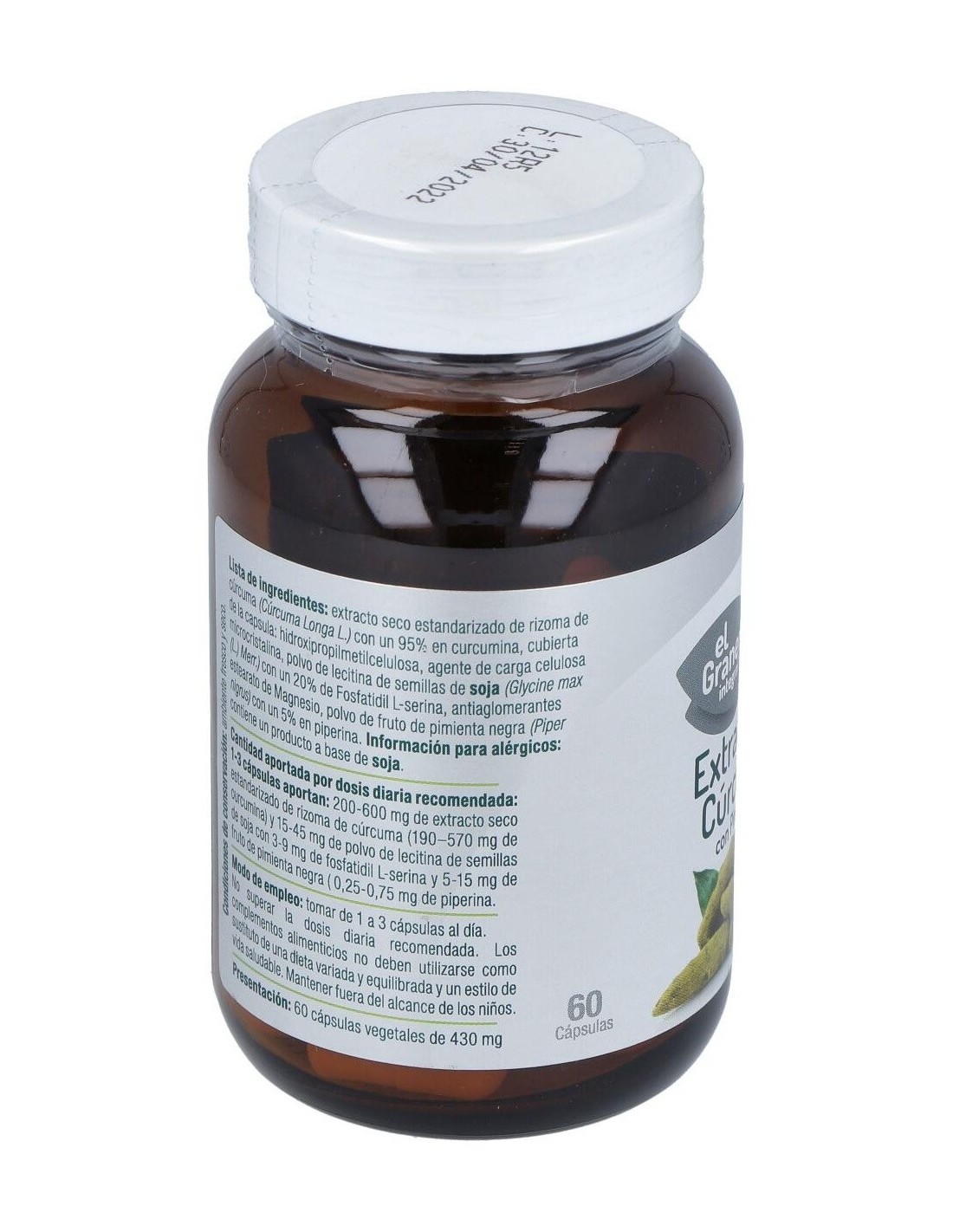 Ingredientes:Extracto seco estandarizado de rizoma de cúrcuma (Cúrcuma Longa L.) con un 95% en curcumina, cubierta de la capsula: hidroxipropilmetilcelulosa, agente de carga celulosa microcristalina, polvo de lecitina de semillas de soja (Glycine max (L.) Merr.) con un 20% de Fosfatidil L-serina, antiaglomerantes estearato de Magnesio, polvo de fruto de pimienta negra (Piper nigrus) con un 5% en piperina. Modo de empleo:Tomar 2 cápsulas al día. Presentación:Envase de 60 perlas.Recomendaciones y advertencias:Apto para veganos.