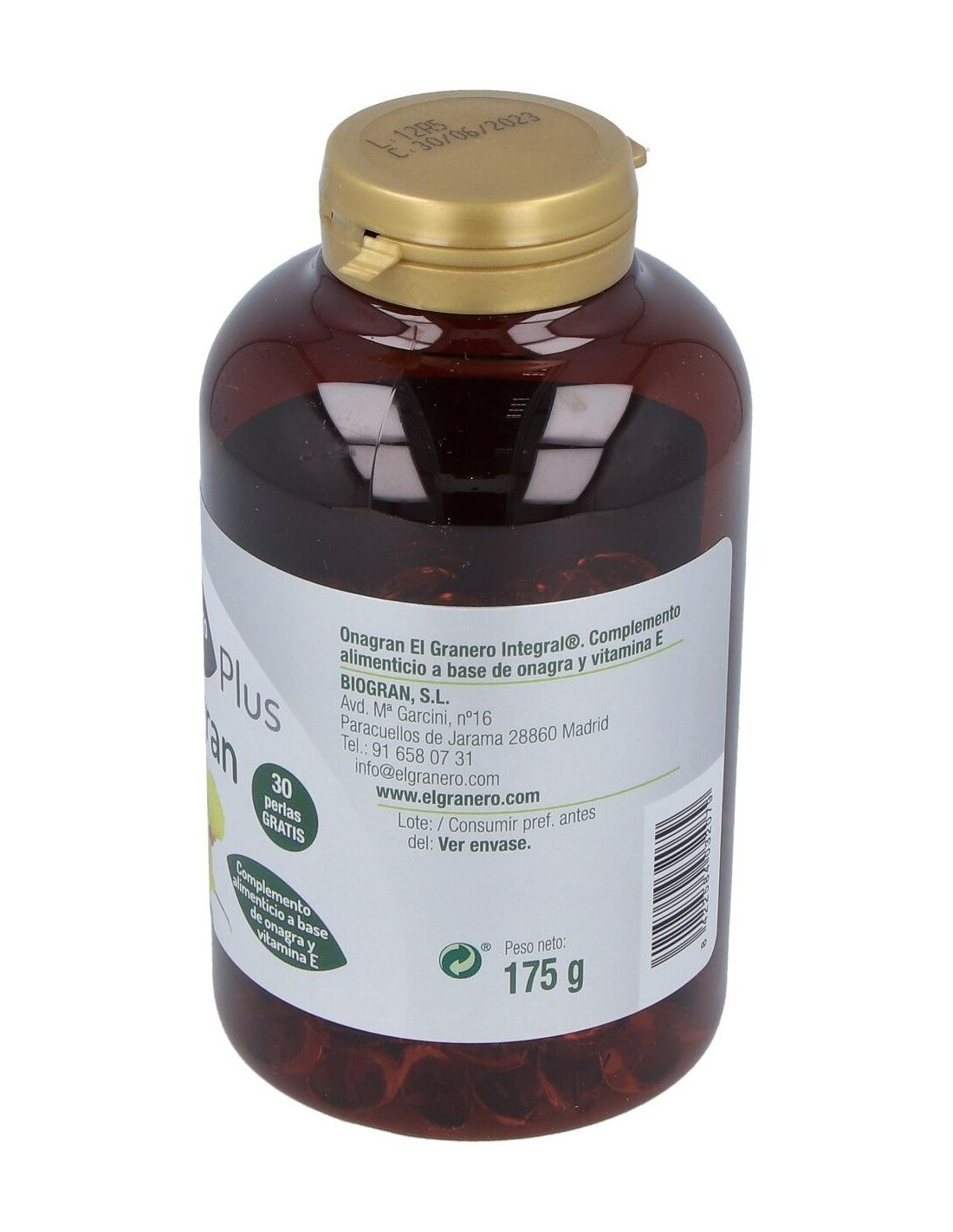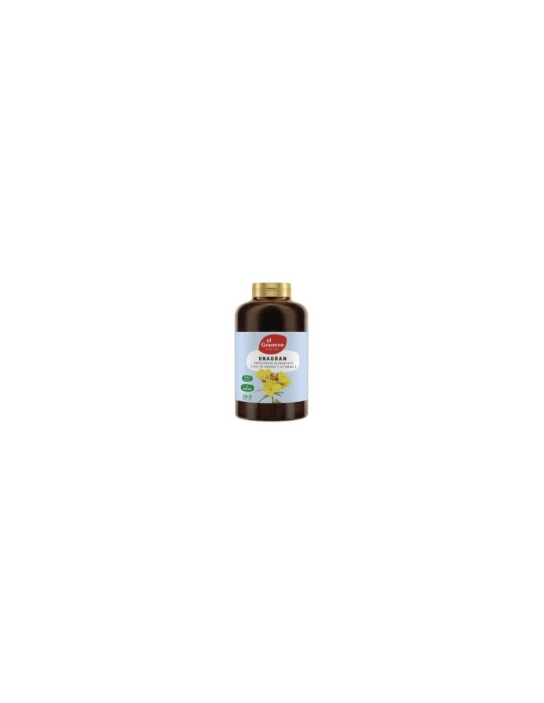 Onagran Plus de Granero Integral es un suplemento alimenticio que integra ácidos grasos esenciales, es decir, que el cuerpo humano no es capaz de producir de manera natural. Este producto contiene onagra, una semilla que ayuda a aliviar los síntomas asociados al síndrome premenstrual, tanto a nivel físico como a nivel mental. Además, es una fuente natural de ácidos grasos omega 6 y también tiene numerosos efectos beneficiosos para la piel. Este producto es apto para todo tipo de personas, y es especialmente recomendable para ser usado por mujeres durante la menstruación, ya que tiene propiedades analgésicas que controlan los dolores producidos por la regla. Este suplemento no tiene ninguna contraindicación. No obstante, los complementos alimenticios no deben utilizarse como sustituto de una dieta variada y equilibrada y un estilo de vida saludable.