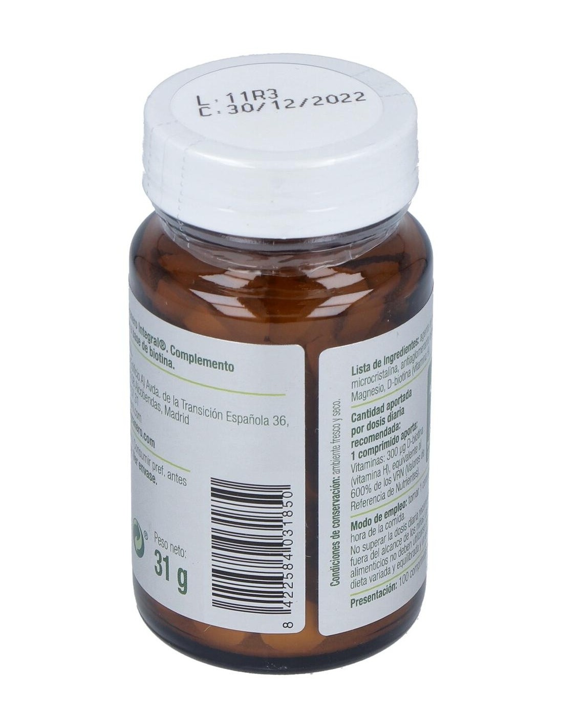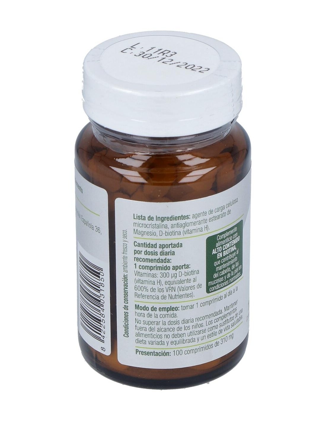 Composición por comprimido:300 mcg de biotina. Modo de empleo:Tomar 1 comprimido al día a la hora de la comida. Presentación:Bote de 100 comprimidos.