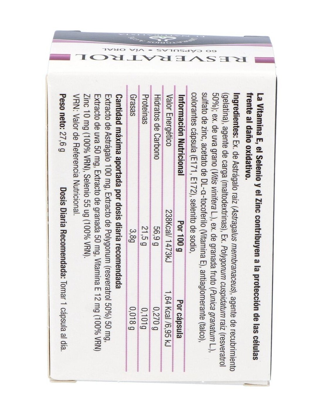 EXTRACTO DE POLYGONUM CUSPIDATUM, PLANTA CON ALTO CONTENIDO EN RESVERATROL (25 MG), ASTRÁGALO RAÍZ, EXTRACTO DE UVA GRANO, EXTRACTO DE GRANADA FRUTO, ZINC, SELENIO Y VITAMINA E.