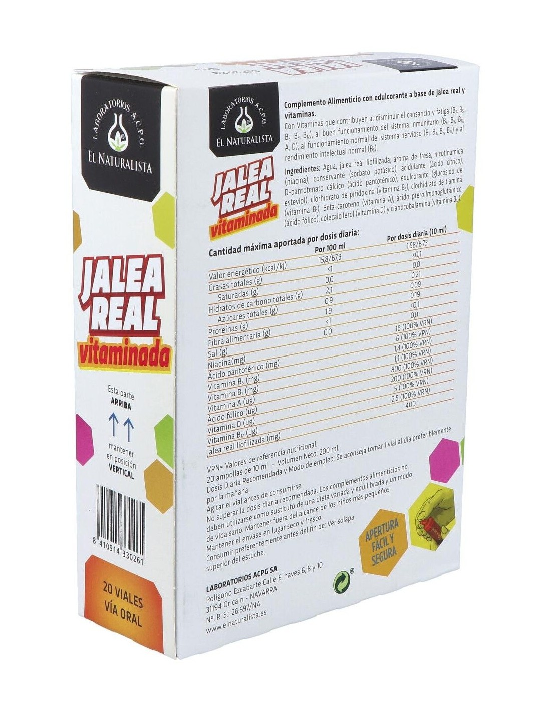 Complemento alimenticio compuesto por Jalea Real liofilizada y 8 Vitaminas: B1, B3, B5, B6, B9, B12, A y D. Puede ser consumido por diabéticos debido a su bajo contenido en azúcares totales (0,09 g/vial).