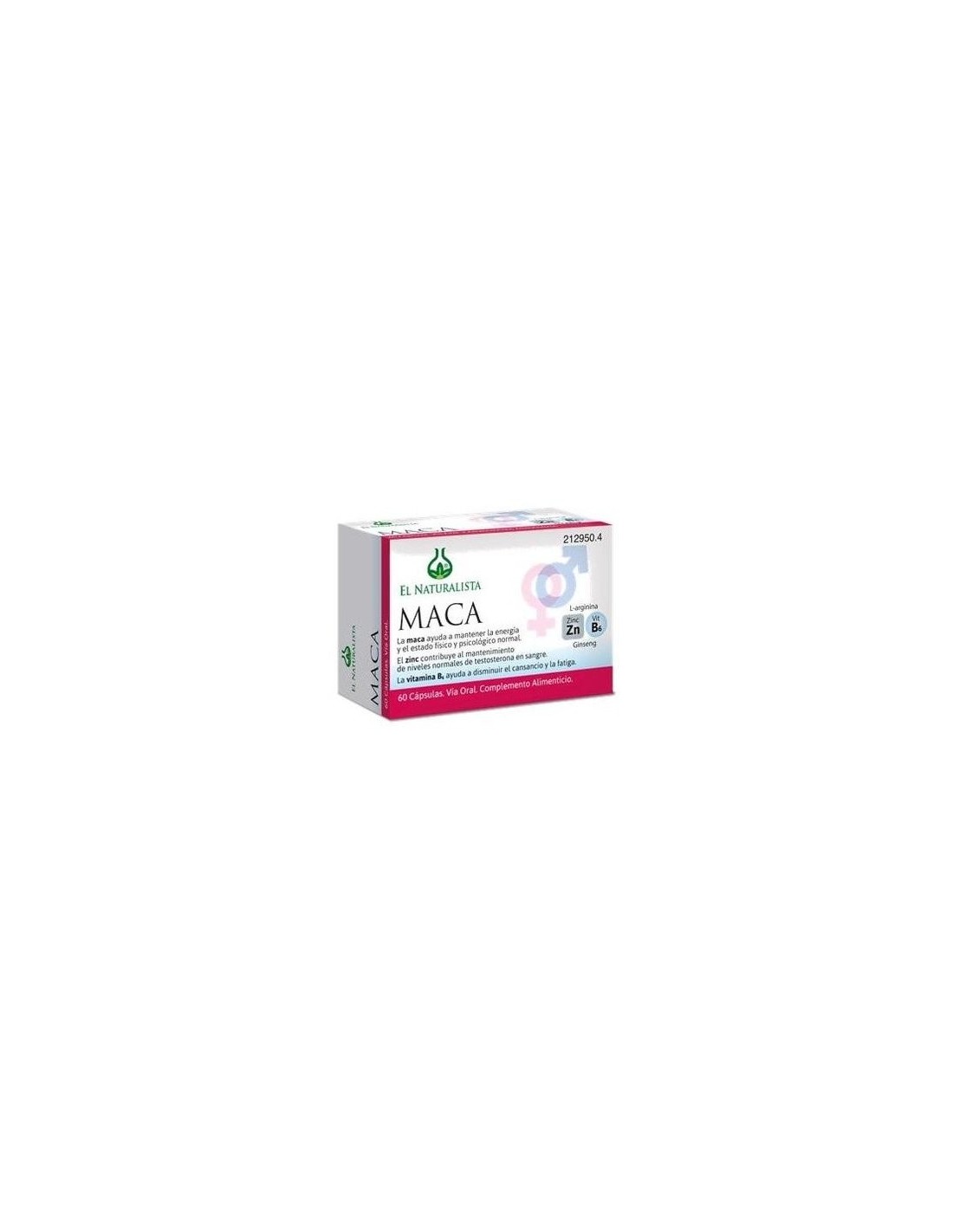 EL NATURALISTAMACA El Naturalista es un producto a base de plantas, aminoácidos, vitaminas y minerales orientado a la energía y la vitalidad de las relaciones en la mujer y el hombre: la Maca ayuda a mantener la energía y apoya el estado físico y psicológico normal. El zinc contribuye a al mantenimiento de niveles normales de testosterona. La vitamina B6 ayuda a reducir el cansancio y la fatiga.