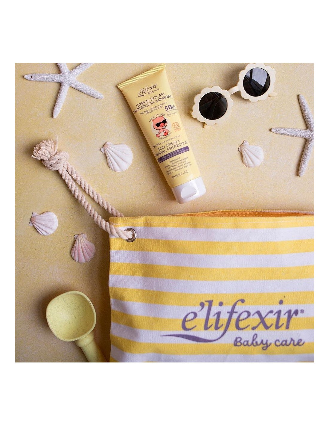 ELIFEXIRCrema solar protectora con SPF50 y filtros minerales para la protección completa del bebé frente al sol. Uso apto desde el nacimiento.