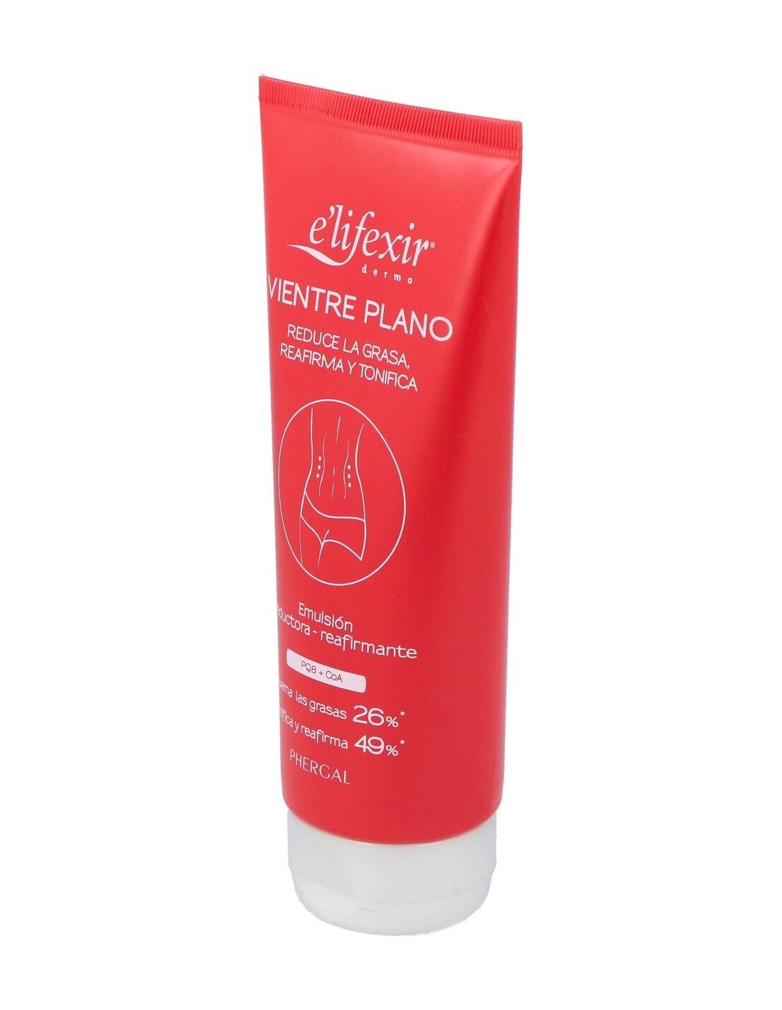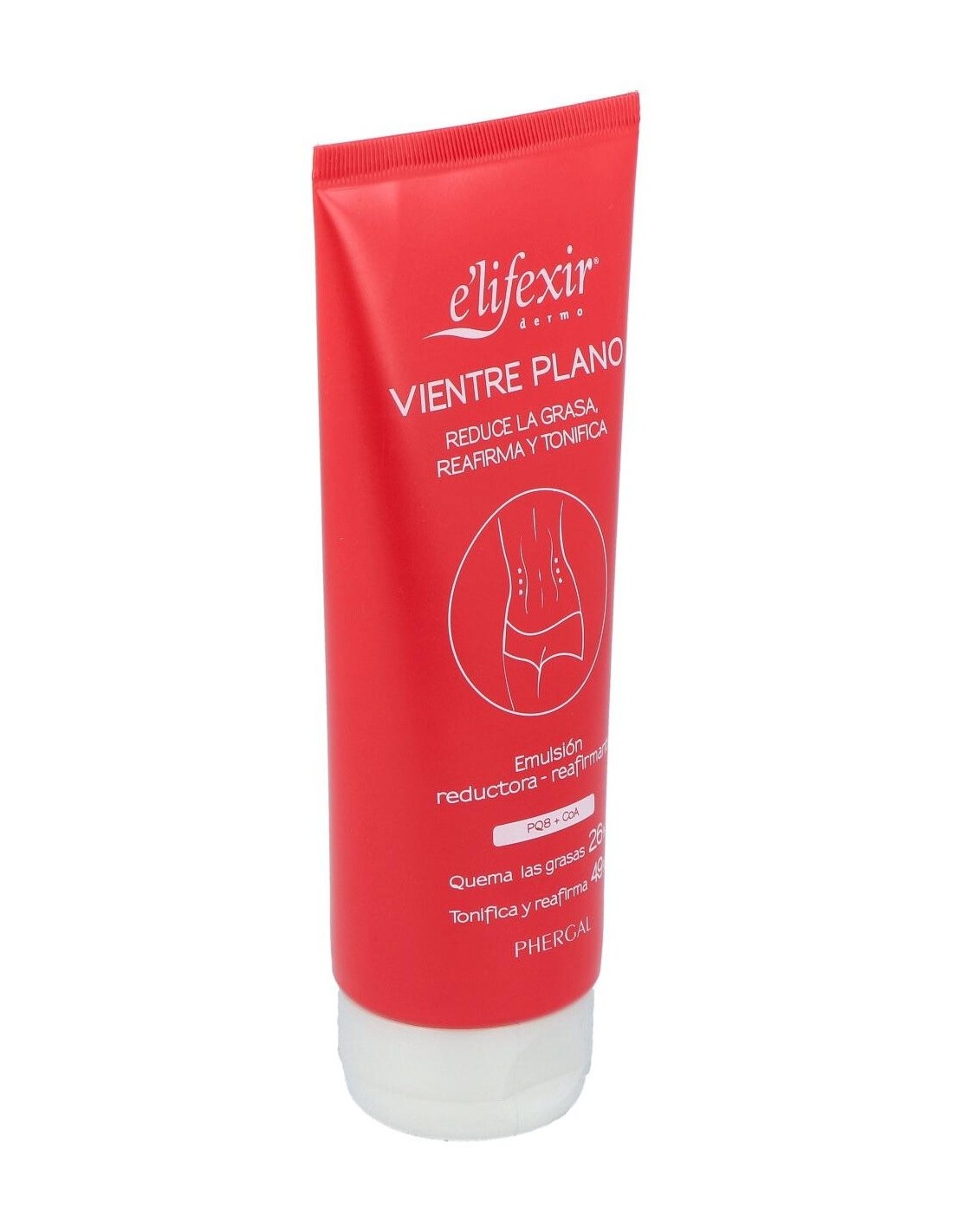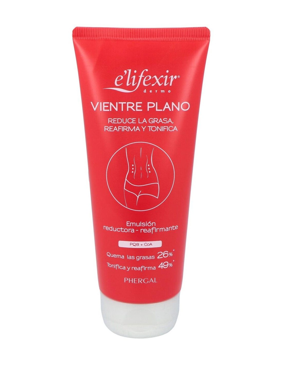 La crema reductora Vientre Plano de E'lifexir®, elaborada por Laboratorios Phergal, es una potente emulsión que reduce y tonifica la zona del vientre. Sus resultados se deben a la combinación de sus activos PQ8 y CoA.