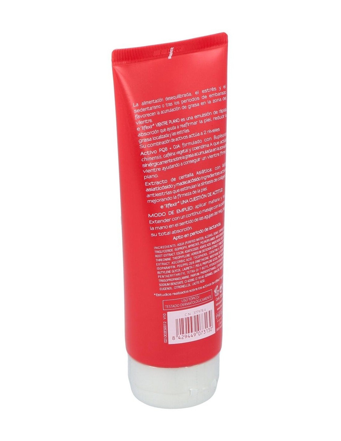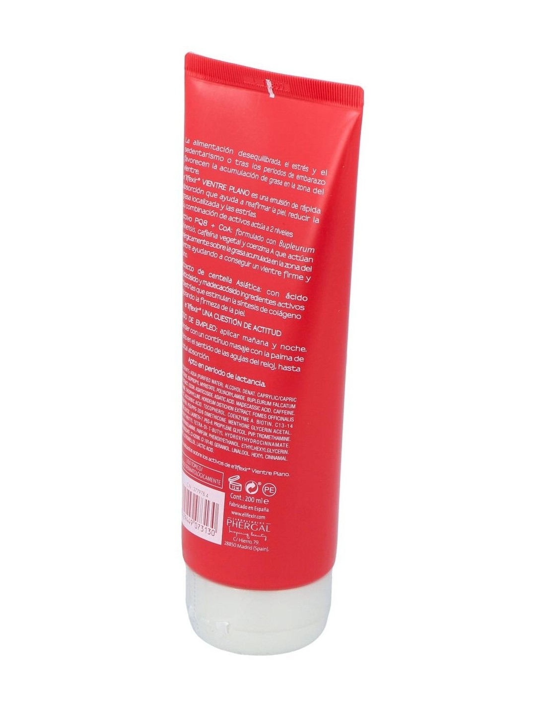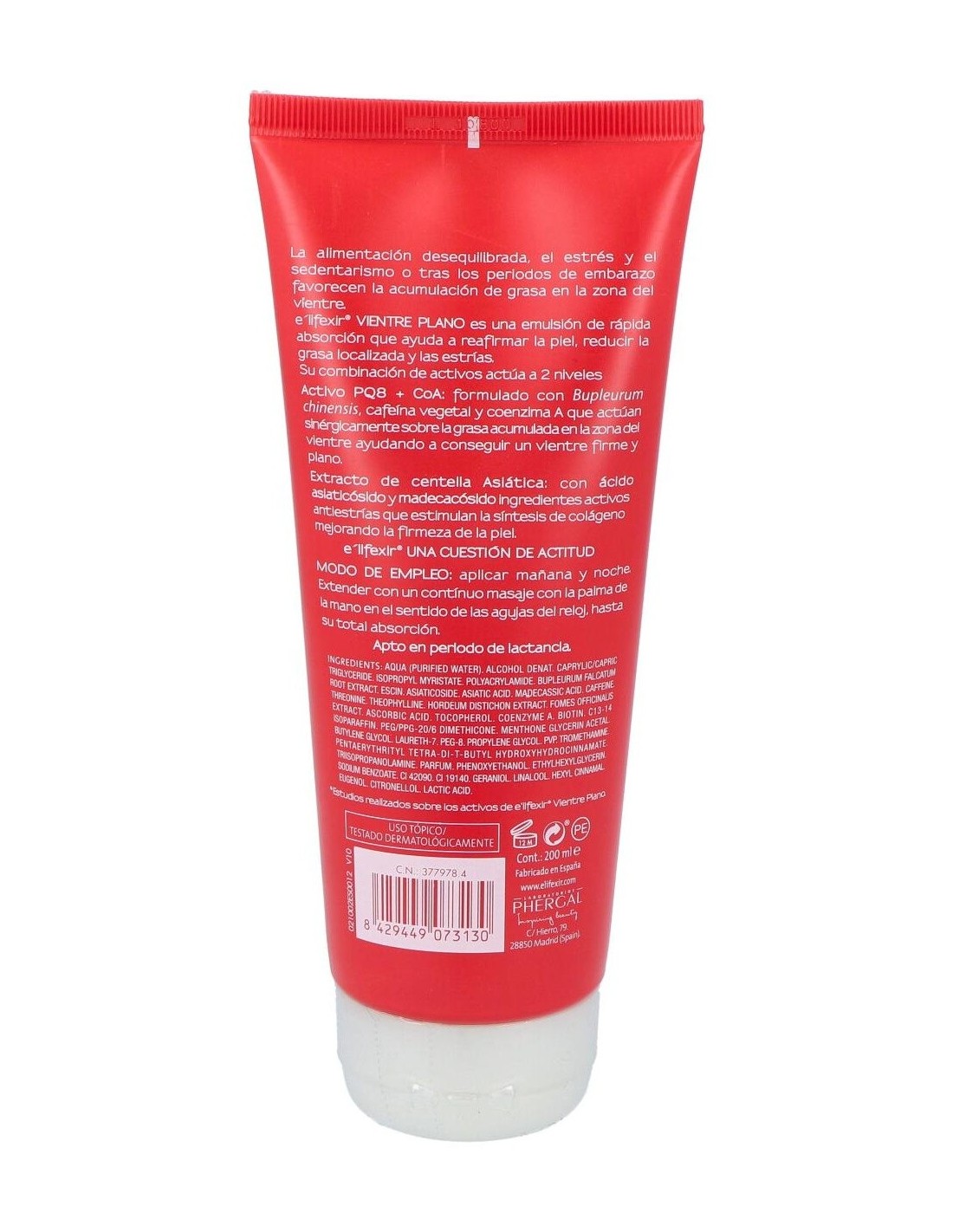 La crema reductora Vientre Plano de E'lifexir®, elaborada por Laboratorios Phergal, es una potente emulsión que reduce y tonifica la zona del vientre. Sus resultados se deben a la combinación de sus activos PQ8 y CoA.
