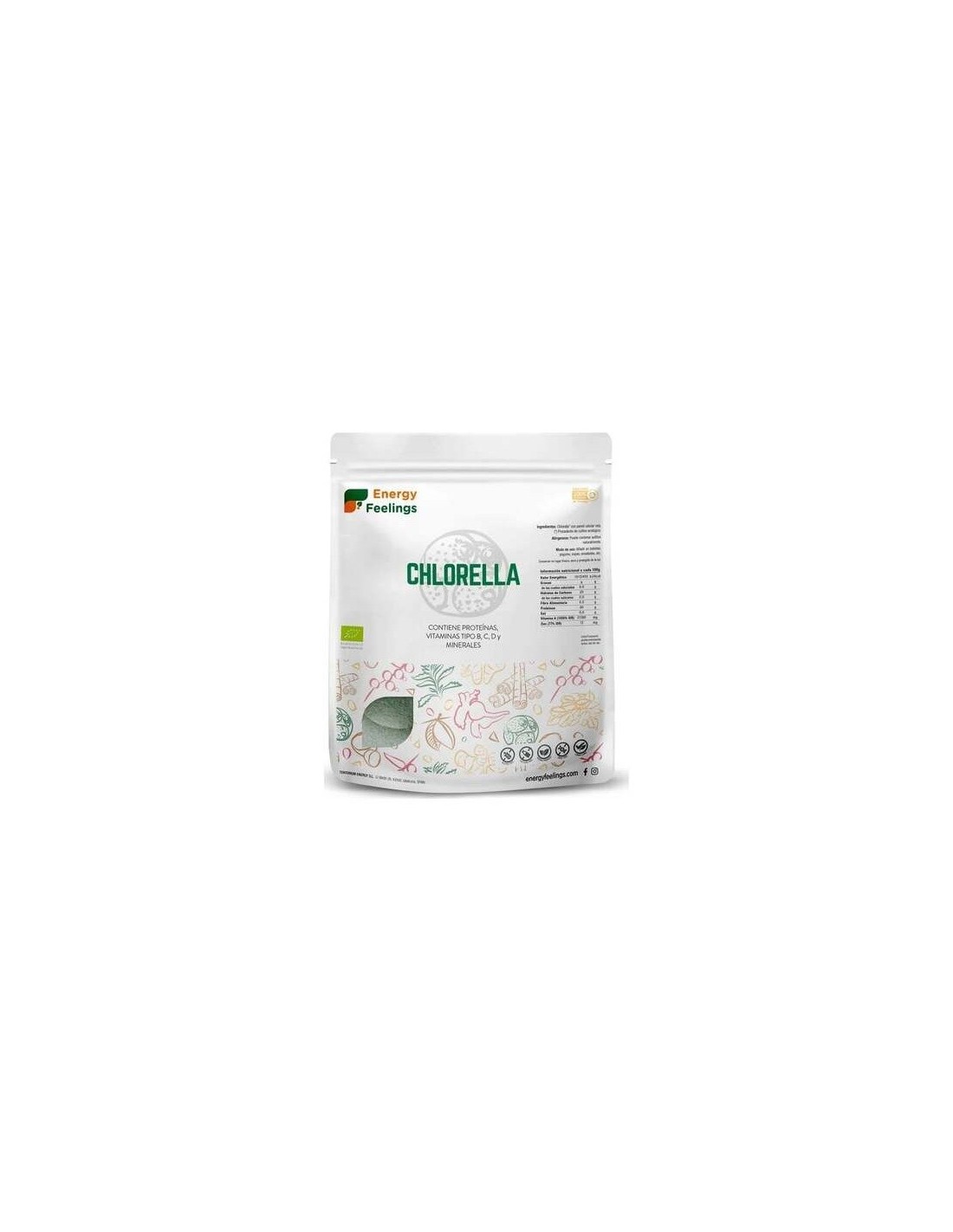ENERGY FEELINGSLa Chlorella Energy Feelings es de pared celular rota (una vez recolectada, la dura pared celular de ésta debe romperse para facilitar la digestibilidad del alga) Una vez rota la pared celular, las algas unicelulares son pulverizadas. Porducto vegano, sin gluten.
