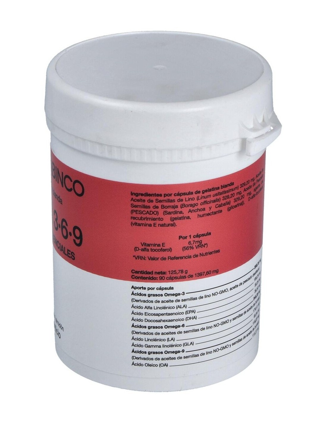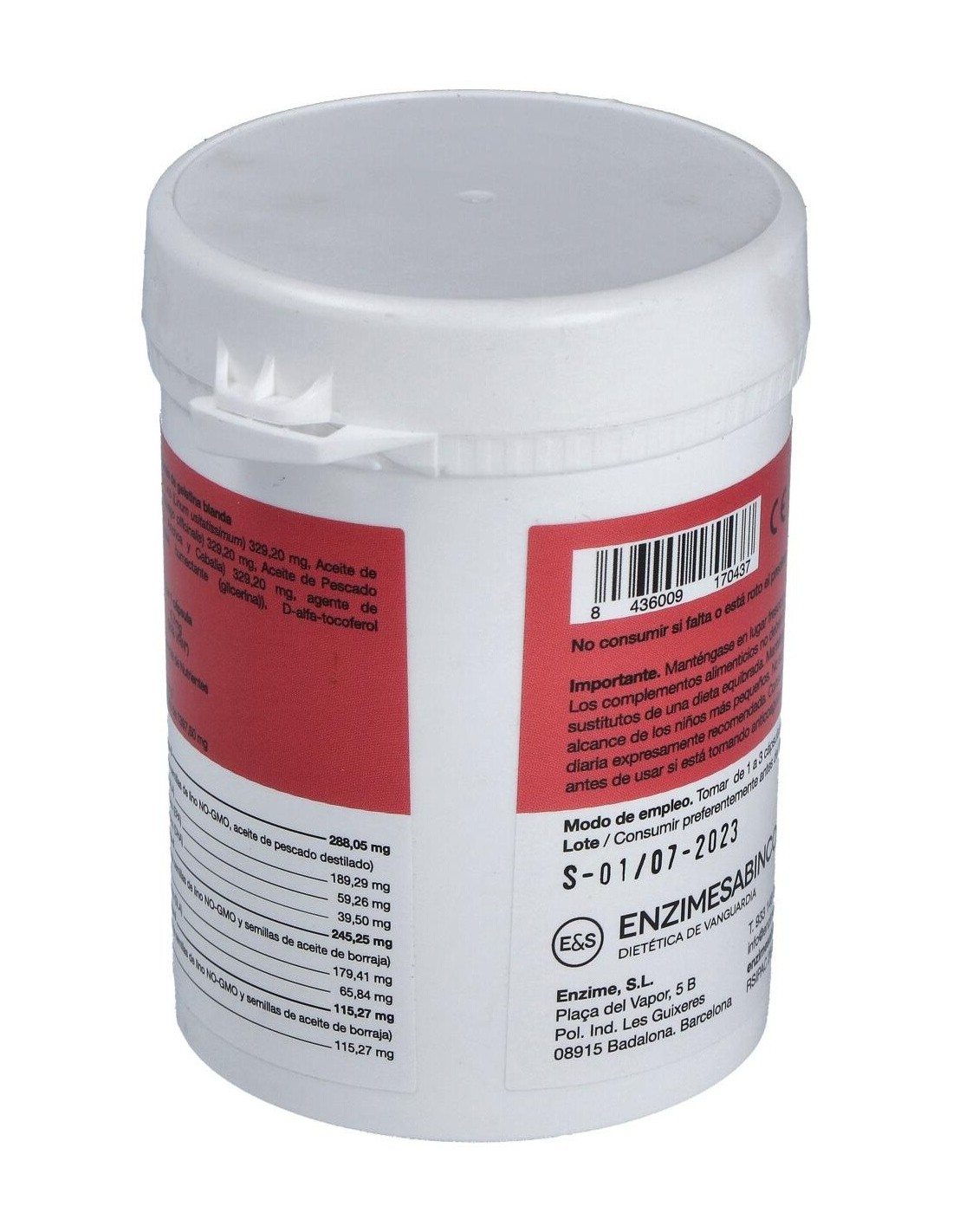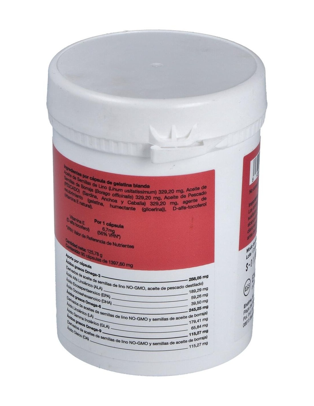 Complemento alimenticio en forma de cápsulas, elaborado a base de aceites de semillas de lino y borraja, y aceite de hígado de sardina, anchoa y caballa, que aportan una proporción adecuada de ácidos grasos omega 3, 6 y 9 al organismo.