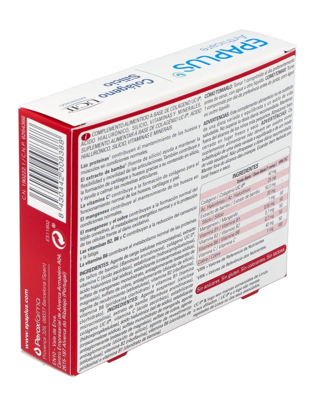 Colágeno UC-II, Ácido Hialurónico, Silicio, Vitamina C, Vitamina B1, B2 y B6, Manganeso, Cobre.