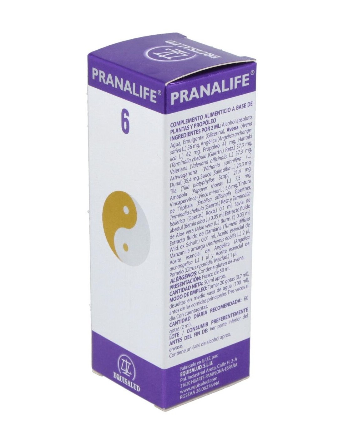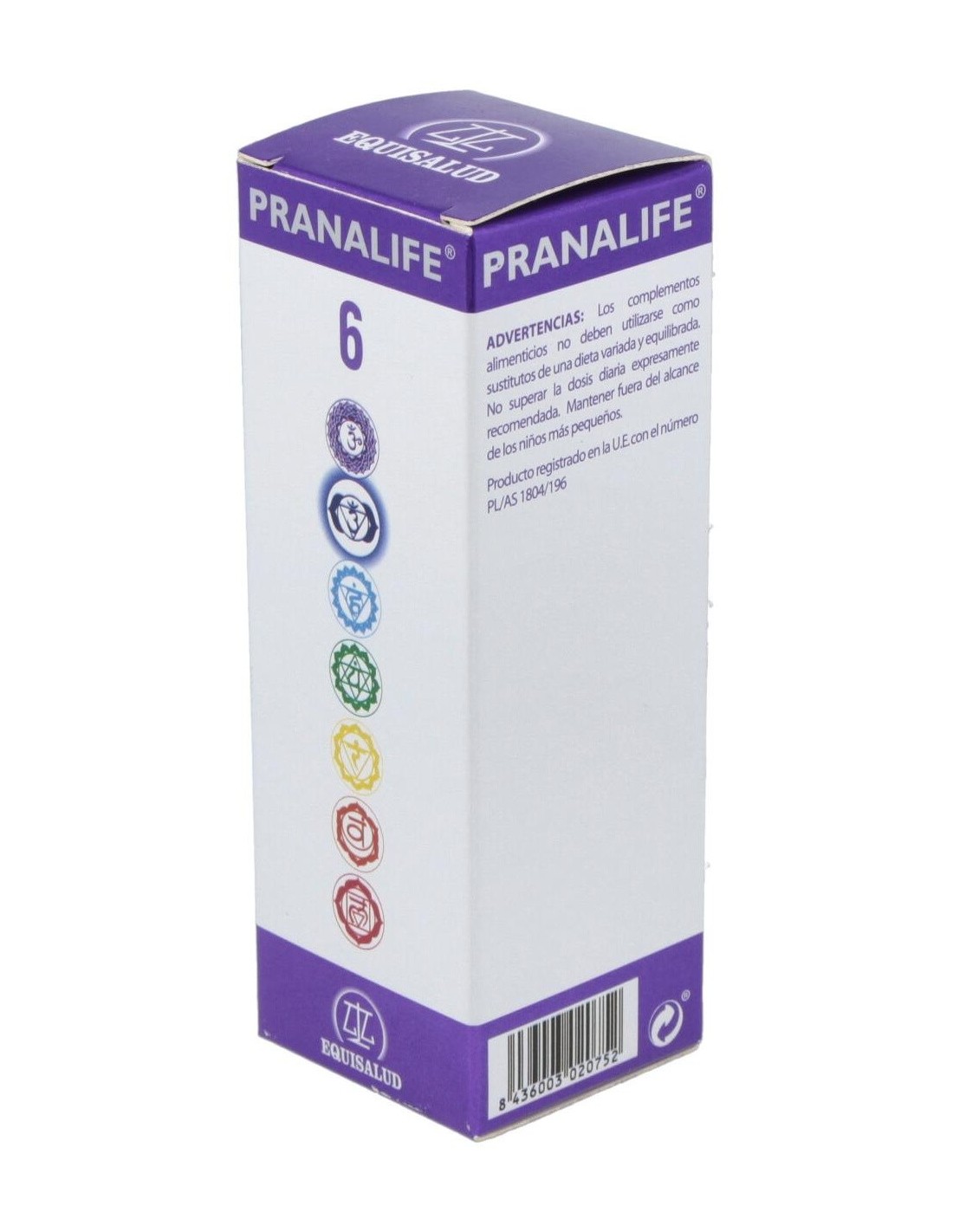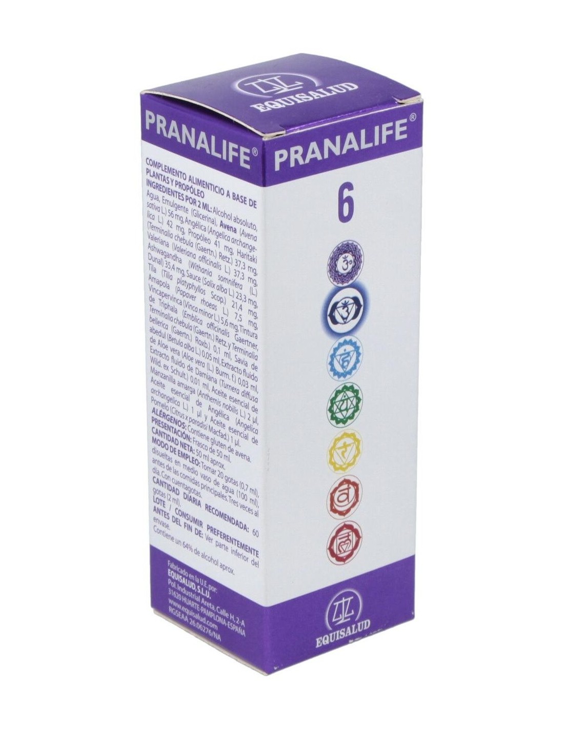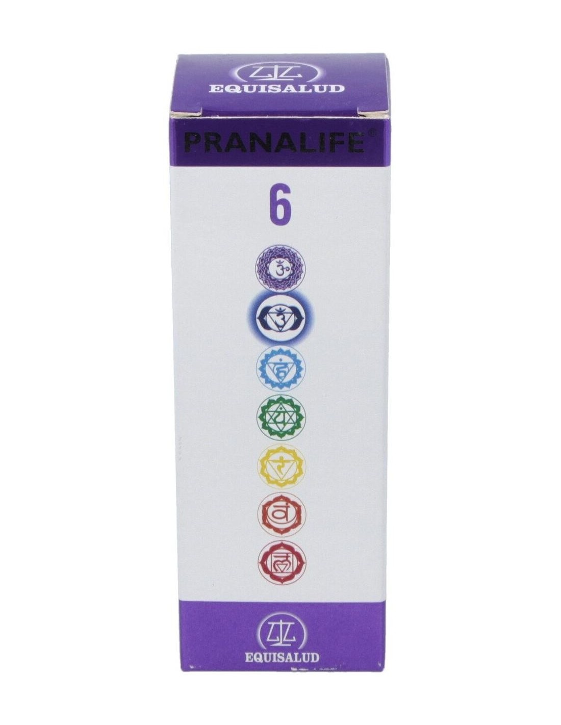 Pranalife 6 estimula el equilibrio del sistema límbico y el hipotálamo, así como la armonización del sistema nervioso vegetativo, del sistema hormonal global y el sistema de respuesta conductual. Contribuye al desarrollo de la intuición. El sexto centro energétíco, (nombre sánscrito Ajna) es el centro hipotálamo-hipófisis. El armonizador Pranalife 6 favorece la intuición y la capacidad de integrar armónicamente distintos niveles de conciencia. Su nota clave es la intuición. Contribuye al desarrollo de una visión total que da sentido a las partes en un conjunto significativo. Facilita la armonización global del sistema endocrino y favorece el equilibrio emocional superior. Estimula la atención y la concentración. Contribuye a la alineación o armonización de la personalidad. Composición: