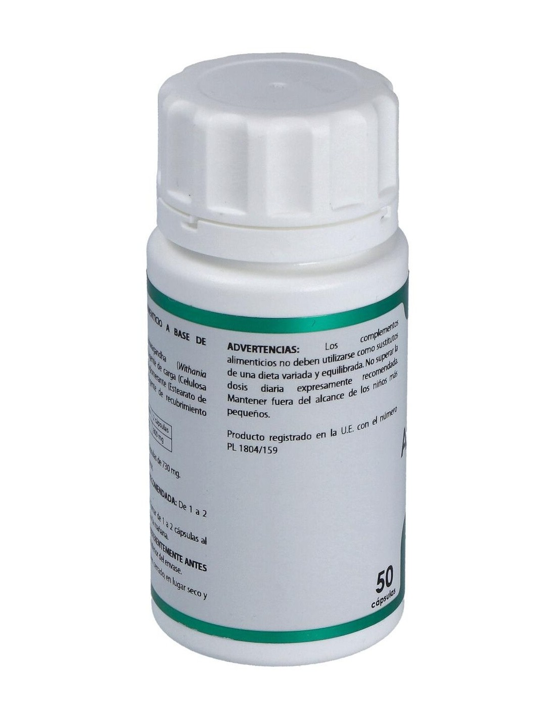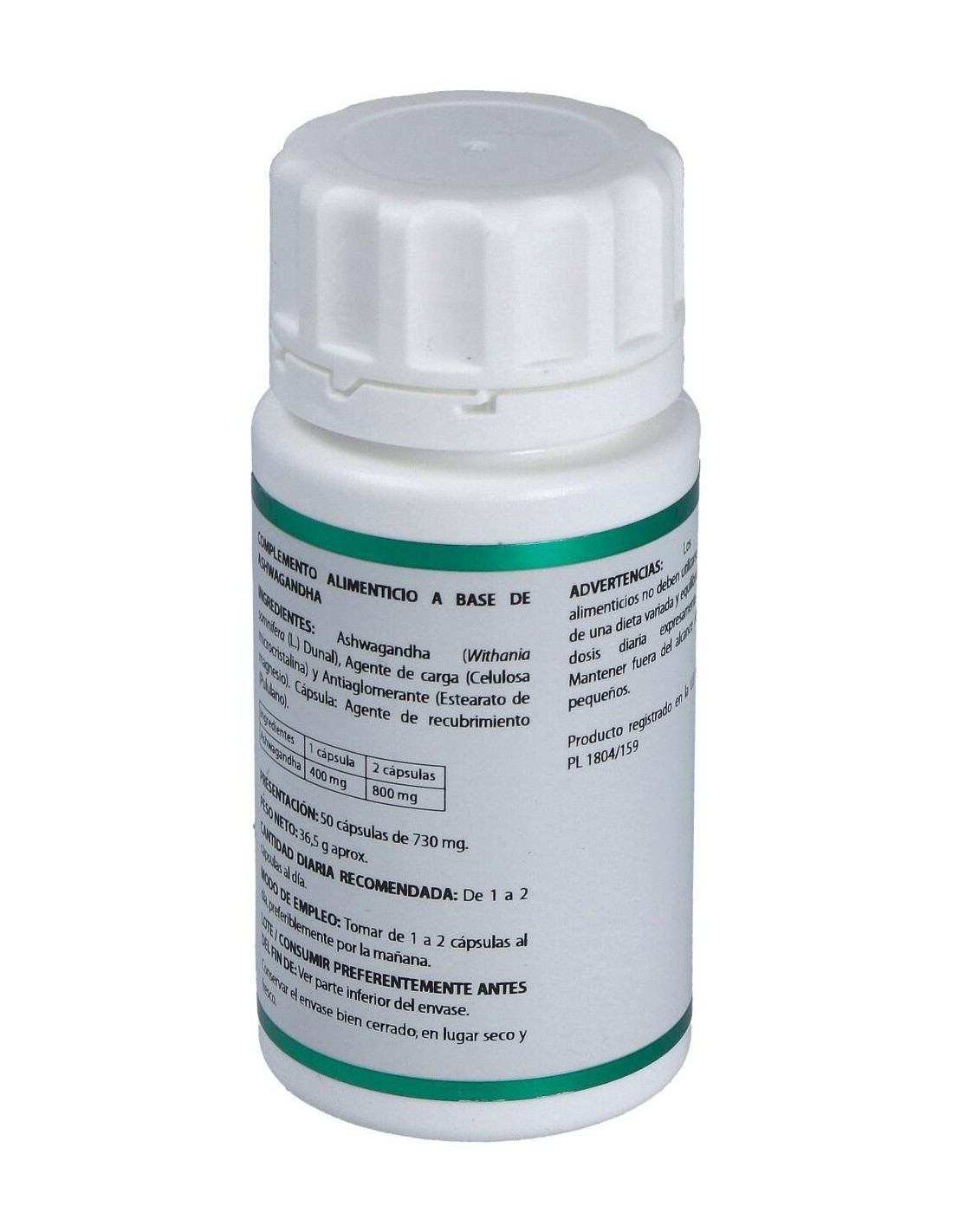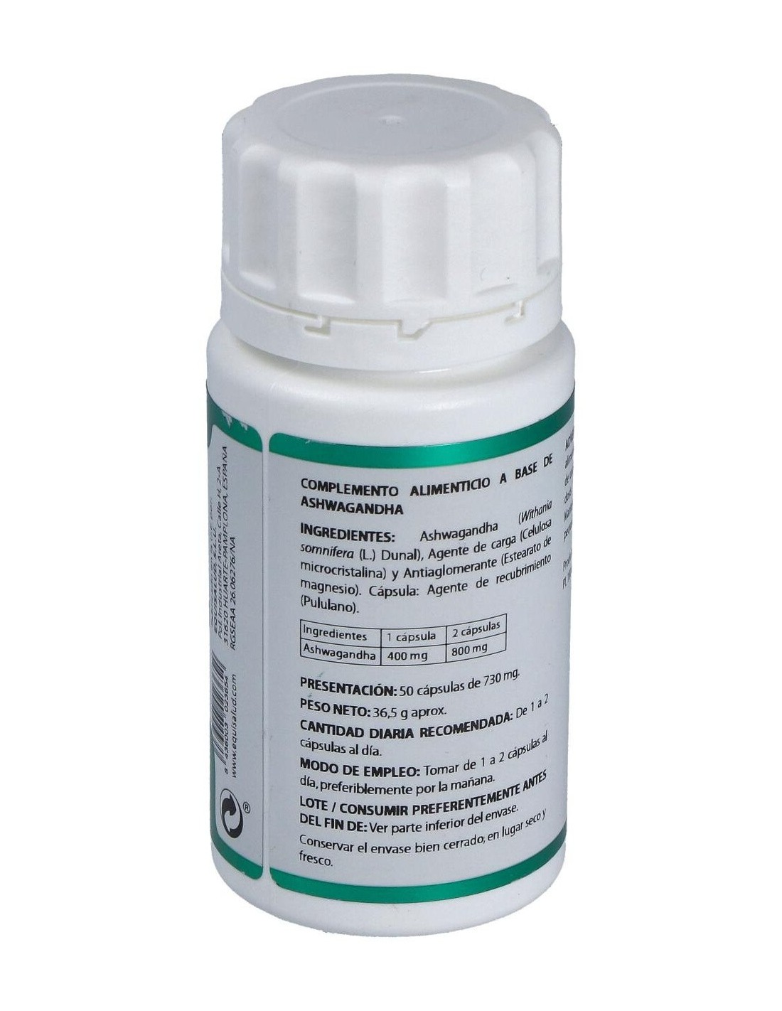 Ingredientes por cápsula:Ashwagandha extracto seco (Whitania somnifera, raíz, =1,5% whitanólidos), 400 mg; celulosa microcristalina (E-460) 205 mg y estearato de magnesio (E-572) 6 mg.Modo de empleo:Tomar de 1 a 2 cápsulas al día, preferentemente por la mañana.Presentación:Bote de 50 cápsulas.