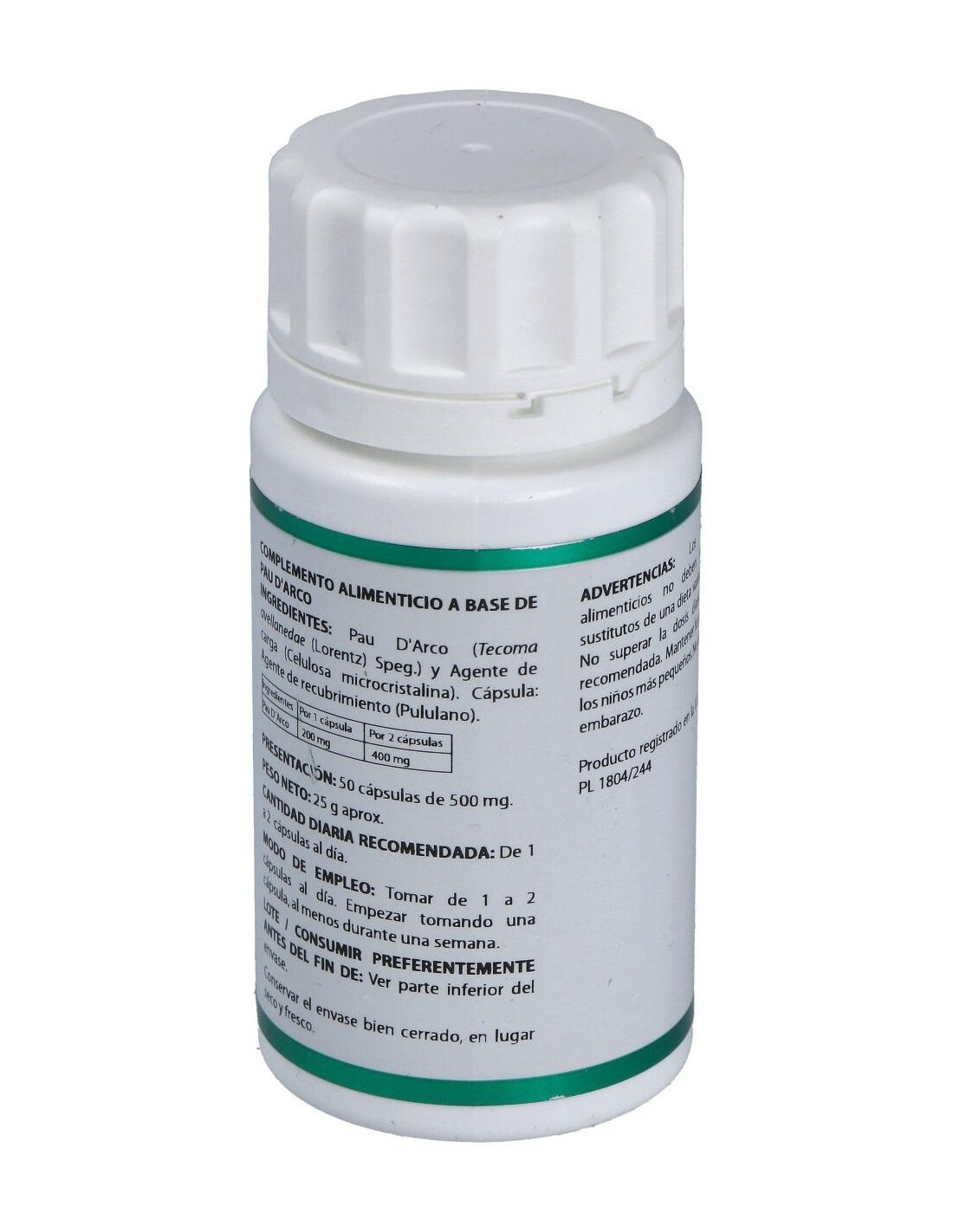 El lapacho cuenta con propiedades astringentes (antidiarreico, cicatrizante), antibacterianas (especialmente Gram+), antifúngicas (mayoritariamente frente a Candida spp) y antiinflamatorias. Los estudios farmacológicos sobre el lapacho se han centralizado básicamente en dos aspectos: antineoplásico y antimicrobiano. A nivel oncológico la reputación como agente antitumoral del lapacho se remonta hace ya varias décadas. Por ahora sólo hay evidencias de algunos efectos inhibitorios in vitro o en modelos animales. En cuanto a la actividad antimicrobiana in vitro, los compuestos que dieron resultados más alentadores han sido las naftoquinonas lapachol y lapachona. La lapachona ha demostrado actividad inhibitoria sobre estafilococos y estreptococos, así como actividad antimalárica y antitripanosómica significativa. En tanto el lapachol demostró actividad antimicrobiana contra Bacillus subtilis, Staphylococcus aureus penicilino-resistentes, Salmonella typhimurium y Candida albicans. Resultaron interesantes también los hallazgos experimentales positivos frente a Leishmania. En cuanto a actividad antiviral, se hallaron resultados inhibitorios sobre el virus de la influenza, virus de la polio y estomatitis y frente al virus del Herpes simplex (tipo I y II). En cuanto a la ß-lapachona, ha exhibido actividad inhibitoria in vitro sobre la enzima transcriptasa inversa y frente a algunos retrovirus relacionados con patologías tales como mieloblastosis aviaria, leucemia murina y el Sida. La actividad antiinflamatoria in vitro del extracto acuoso total de lapacho tuvo una potencia similar a la fenilbutazona. Experimentalmente, dicho extracto exhibe una actividad antiulcerogénica, lo cual sería tributo de las naftoquinonas. Se han ensayado geles antiinflamatorios para uso tópico conteniendo lapachol al 0,5% en un pH 8, determinando respuestas antiinflamatorias del orden del 80,84% a los 100 minutos de su administración en roedores. El lapachol ha demostrado poseer efectos anticoagulantes in vitro, en tanto la tecomina tendría actividad hipoglucemiante e hipotensora. Por su parte, el carnosol y los derivados indólicos presentan actividad antioxidante in vitro. Un trabajo experimental indicó que los componentes de la corteza interna del lapacho podrían derivar en promisorios agentes antipsoriásicos. En efecto, el compuesto beta-lapachona demostró una eficacia comparable al agente antipsoriásico antralina. Por último, el lapachol y otras naftoquinonas relacionadas con esta especie han demostrado poseer efectos anticoagulantes en ratas y en humanos, de manera similar a la 4-hidroxi-cumarina. Composición por cápsula:200 mg de extracto 4:1 de corteza de lapacho (Tabebuia avellanedae). Modo de empleo:Tomar de 1 a 2 cápsulas al día. Presentación:Bote de 50 cápsulas.