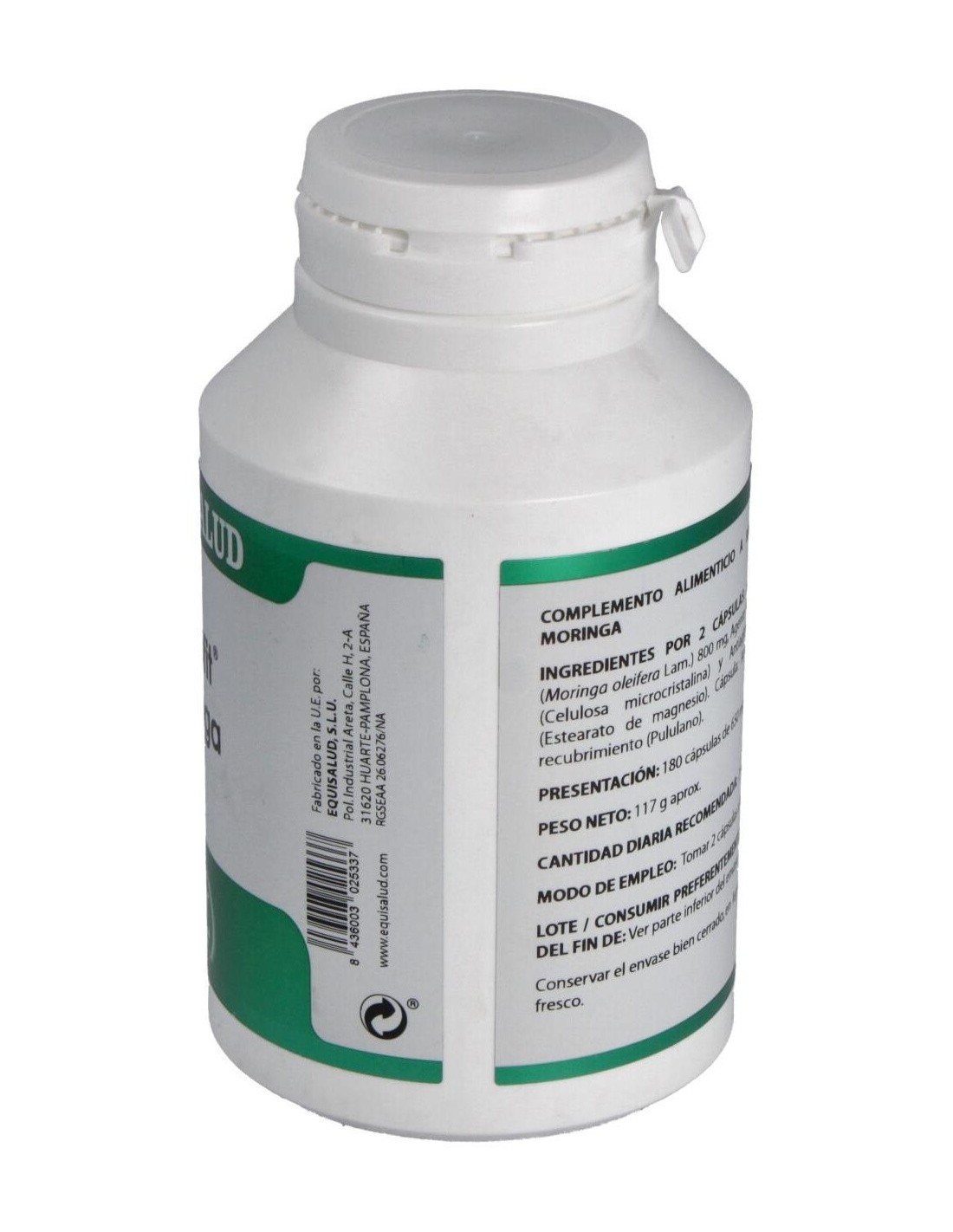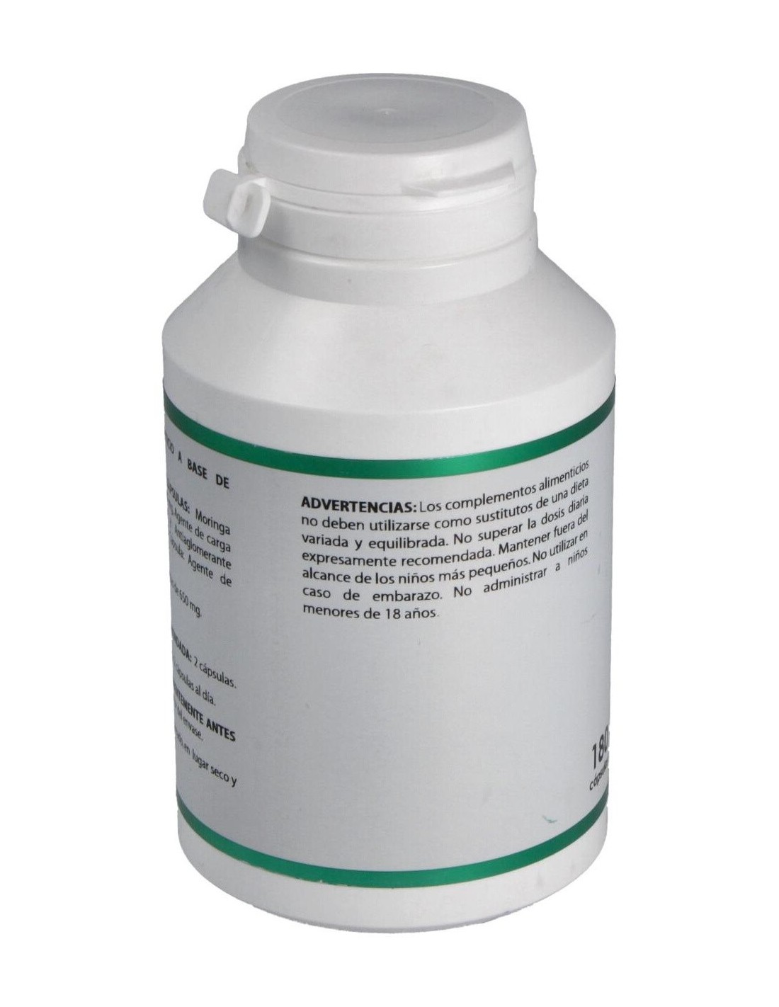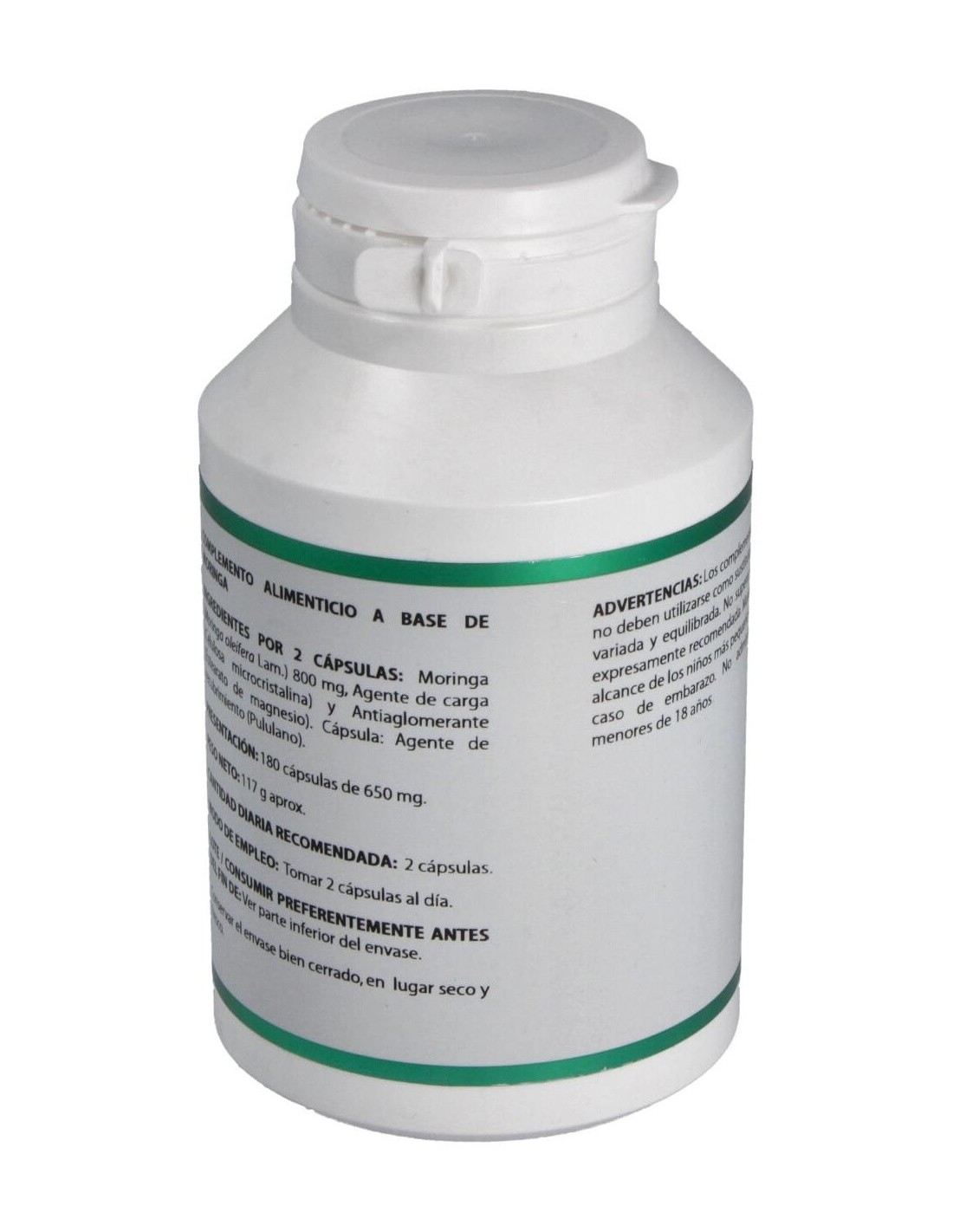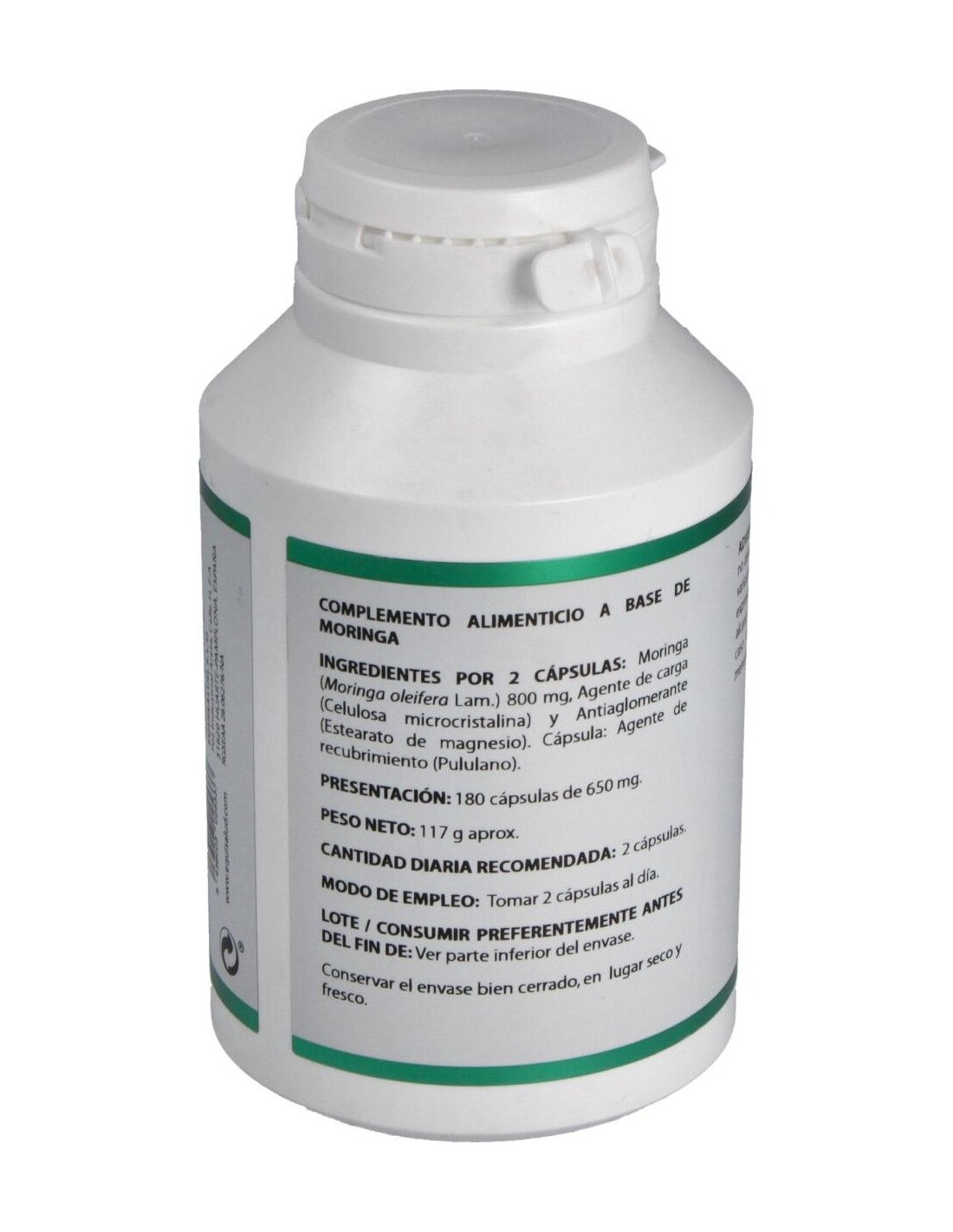 Moringa extracto seco (Moringa oleifera Lam., hoja, ratio 4:1), 400 mg. Excipientes tecnológicos: celulosa microcristalina (agente de carga), c.s. y estearato de magnesio (antiaglomerante), c.s. Envoltura: polisacárido de origen vegetal (pululano)