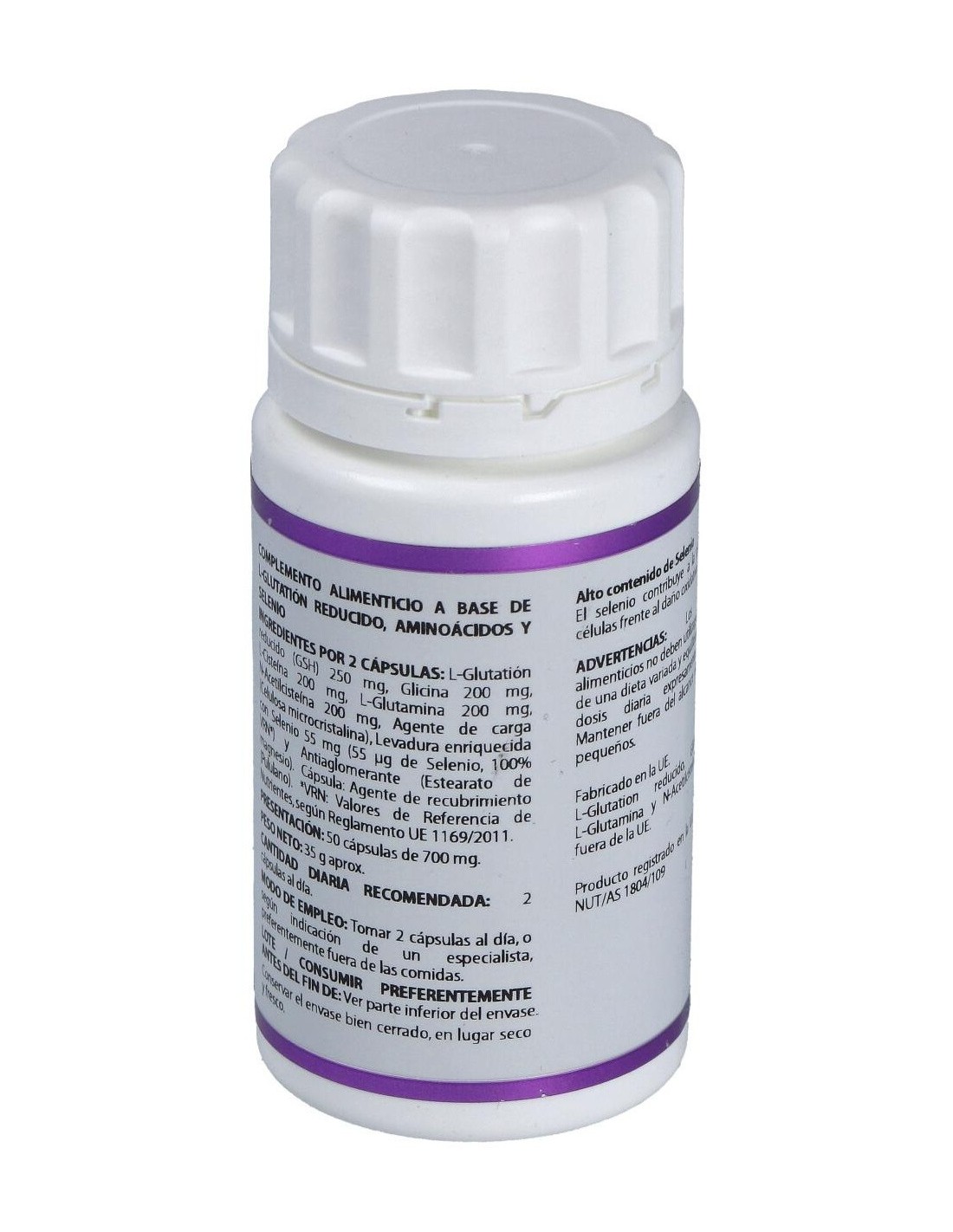 Juega un importante papel en el organismo como defensa antioxidante. Por medio del sistema glutatión peroxidasa-glutatión reductasa, reduce los dañinos peróxidos y lipoperóxidos. Protege el hígado (alcohólicos, resaca), desintoxica el organismo (útil en muchos casos como en quimioterapia), destruye metales pesados (plomo, mercurio, arsénico), protege el corazón porque previene la oxidación del colesterol LDL, previene daños oculares como la catarata y es inmunoestimulante (enfermedades respiratorias y otras).Se aporta L-glutatión pero a su vez se añade todo aquel elemento que forma parte del glutatión o ayuda a su síntesis orgánica, con lo cual se asegura que haya un nivel adecuado de L-glutatión en el organismo y cumpla su función antioxidante, tan importante. El selenio se aporta en forma de lavadura orgánica para facilitar más su biodisponibilidad. La glicina, L-cisteína, L-glutamina y NAC van a facilitar la producción de L-glutatión, así como el selenio. Composición por cápsula: