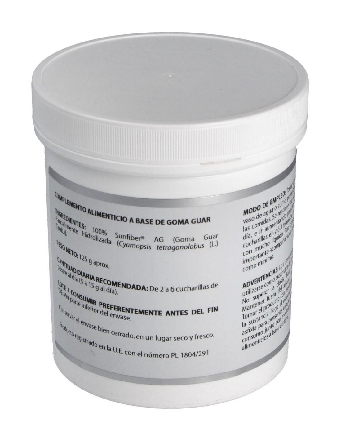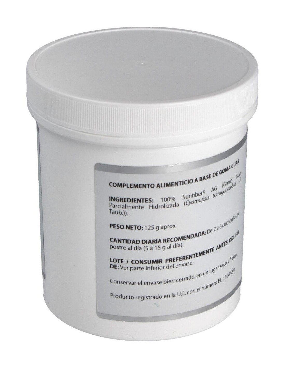 Este complemento alimenticio resulta muy útil para tratar los efectos secundarios de los antibióticos, como es la destrucción de la flora bacteriana intestinal. Se ha visto en varios estudios que el ácido butírico actúa como freno en los procesos tumorales del colon y recto. Tiene efecto saciante que ayuda en las dietas de adelgazamiento. No produce efectos laxantes indeseables ni flatulencia.Ingredientes:125 gramos de Sunfiber® AG (Goma Guar Parcialmente Hidrolizada, Cyamopsis tetragonolobus, endospermo de la semilla, > 75% de fibra dietética).Modo de empleo:Tomar dos cucharillas disueltas en un vaso de agua o zumo, preferiblemente media hora antes de las comidas. Se recomienda empezar con dos cucharillas al día, e ir aumentando paulatinamente hasta cuatro o seis cucharillas, en 2 ó 3 tomas. Se recomienda tomar el producto con mucho líquido. Para conseguir un efecto saciante, es importante acompañar cada toma con medio litro de líquido como mínimo.Presentación:Envase de 125 gramos.