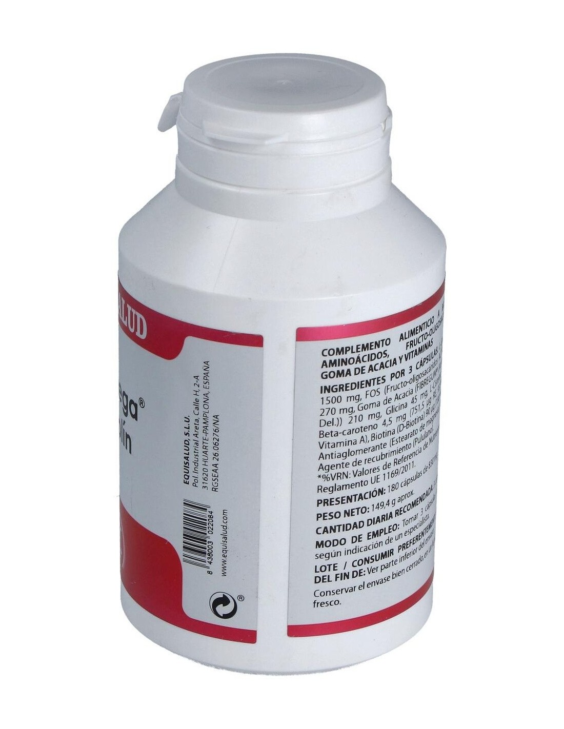 EQUISALUDComplemento alimenticio a base de aminoácidos, fructo-oligosacáridos, goma de acacia y vitaminas. Alto contenido de vitamina A y biotina: la vitamina A y la biotina contribuyen al mantenimiento de las mucosas en condiciones normales, y al funcionamiento normal del sistema inmunitario y del sistema nervioso, respectivamente.