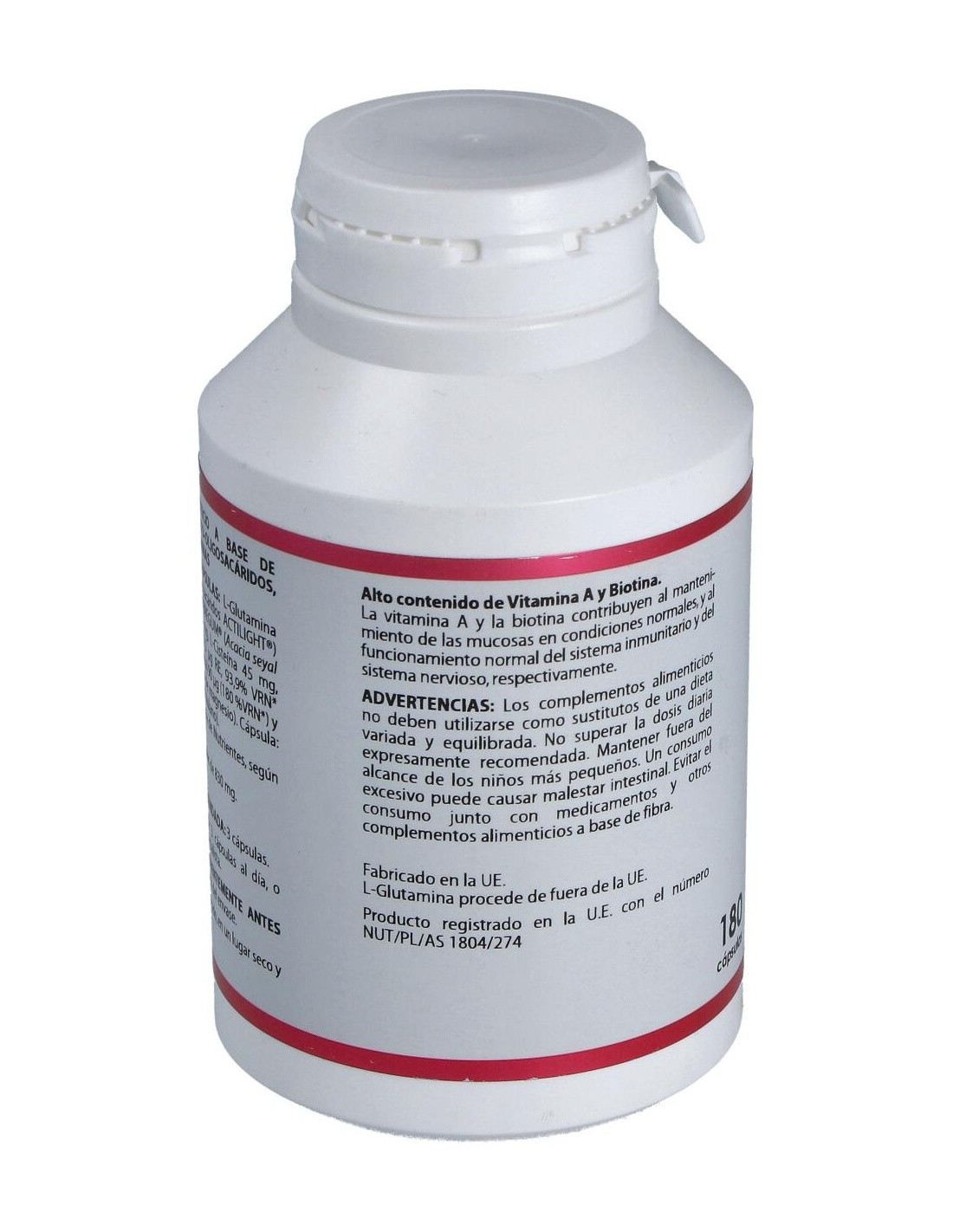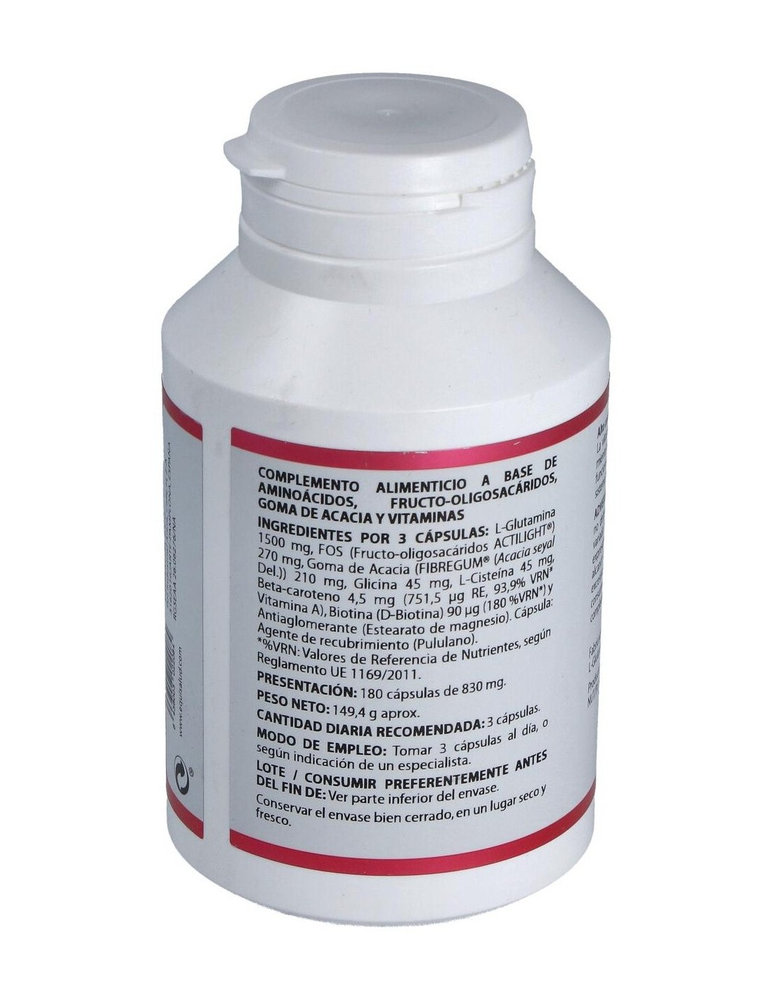 L-Glutamina, Fructo-oligosacáridos (ACTILIGHT ® 950P), Acacia (FIBREGUM® B), Betacaroteno, Glicina, L-Cisteína, D-Biotina, Estearato de magnesio. Envoltura de polisacárido de origen vegetal (pululano).