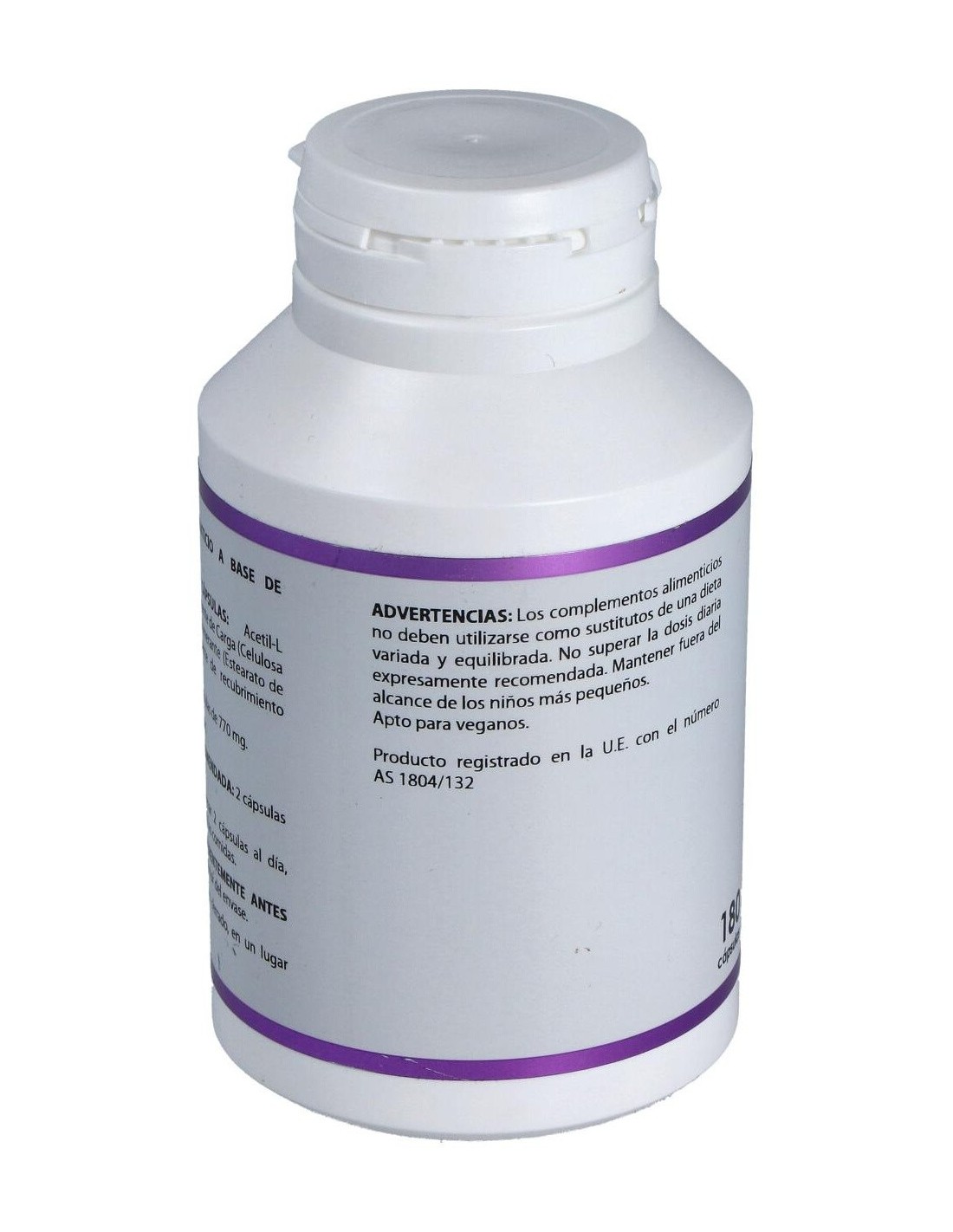 Composición por cápsula:500 mg de Acetil L-Carnitina (HCl). Modo de empleo:Tomar 2 cápsulas al día fuera de las comidas. Presentación:Bote de 180 cápsulas.