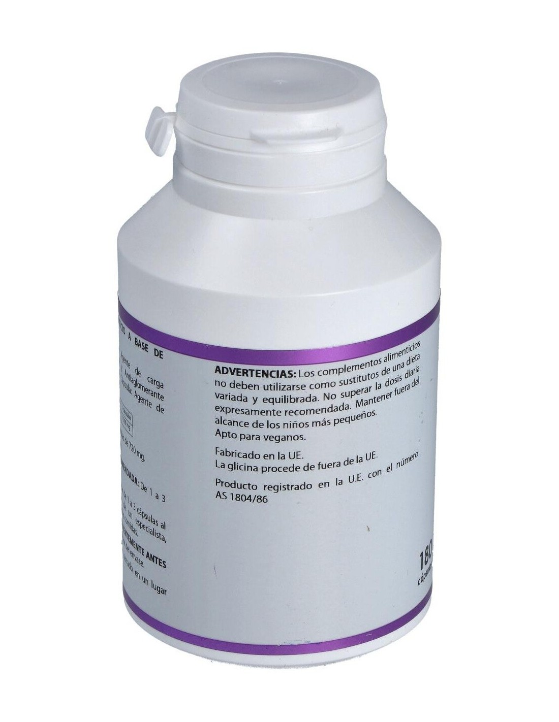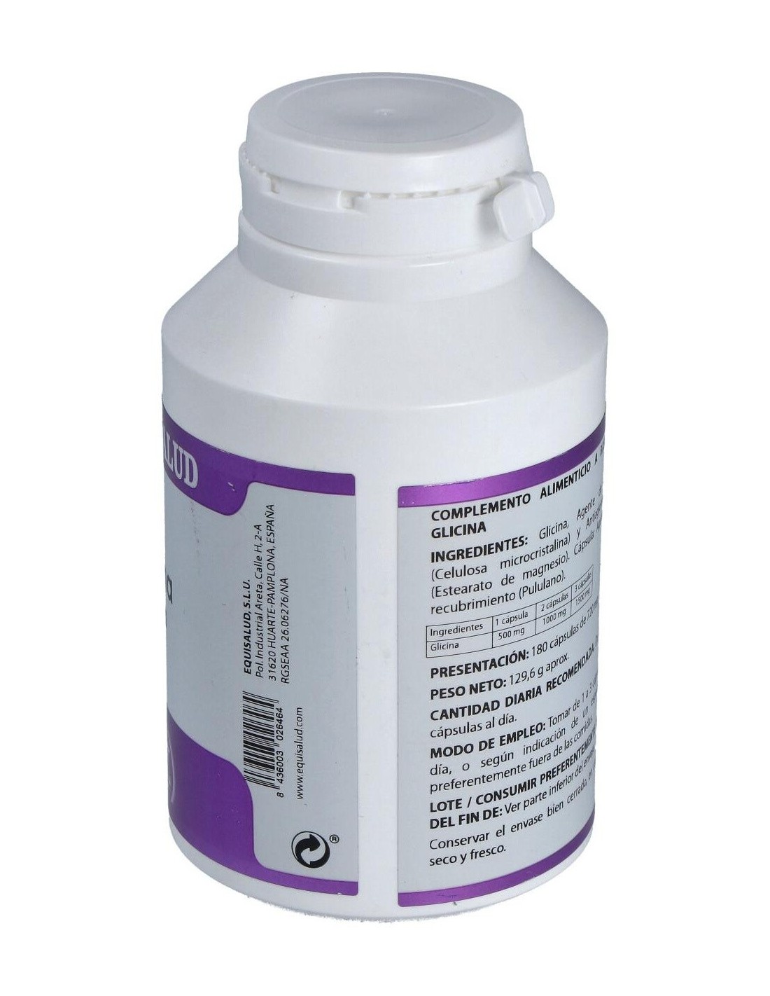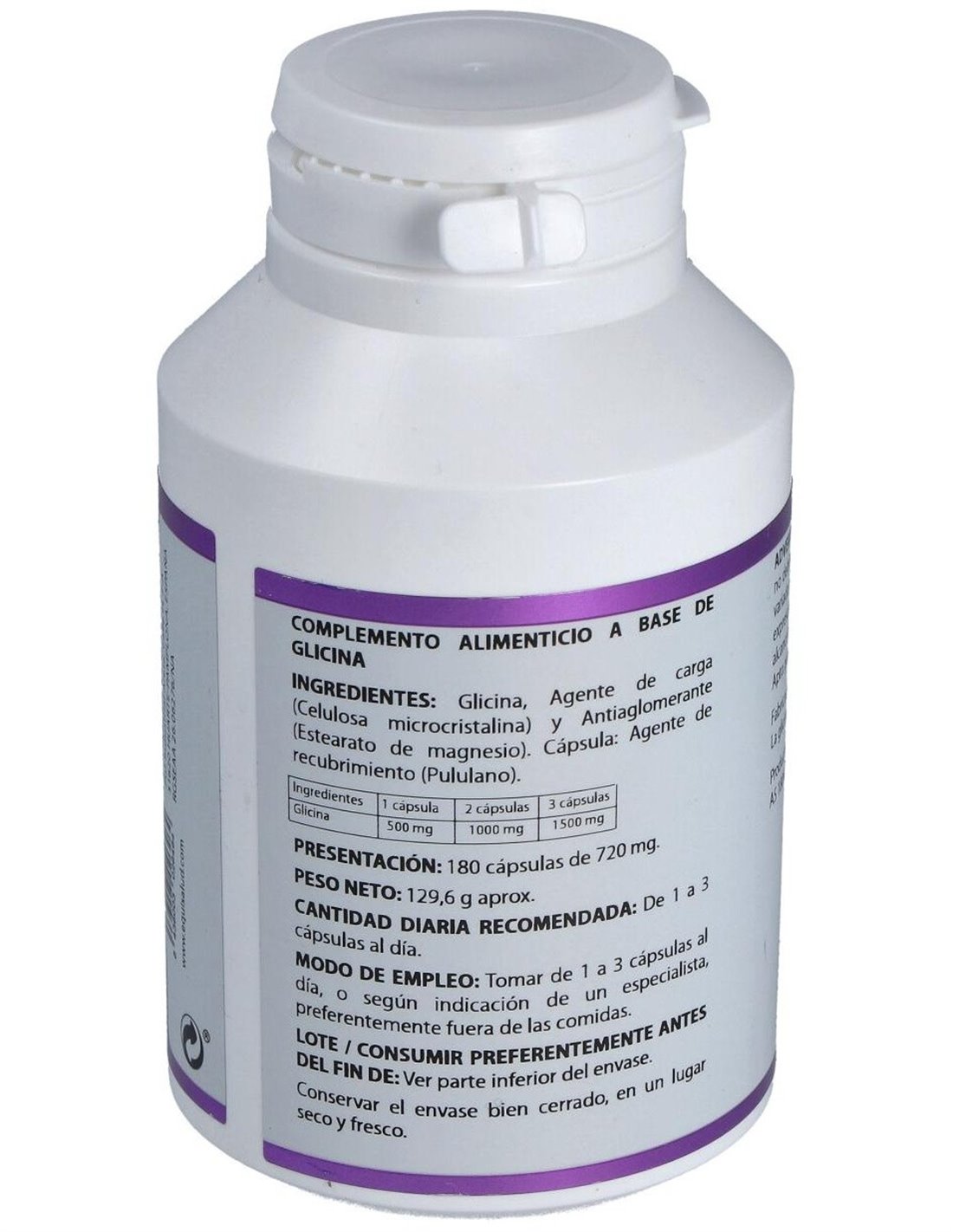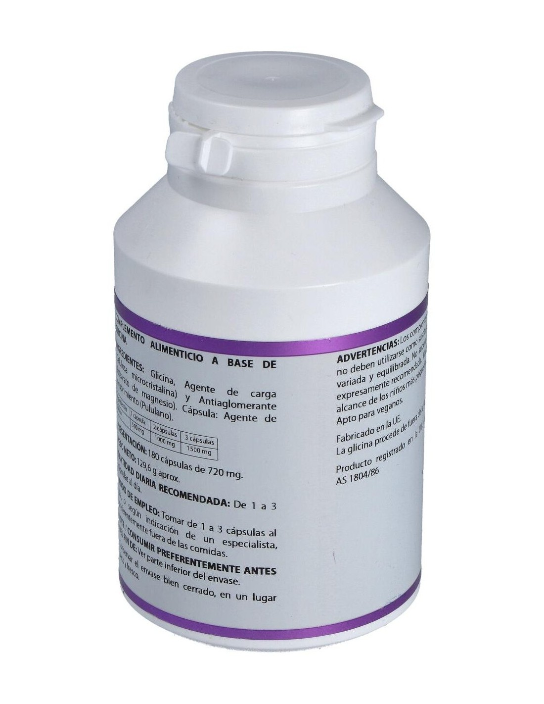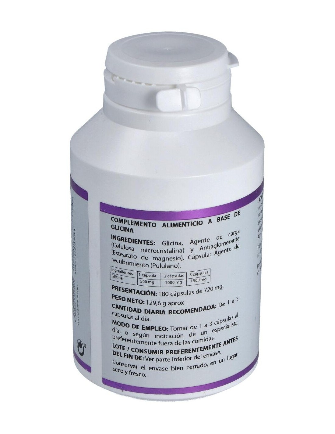 Composición por cápsula:500 mg de glicina. Modo de empleo:Tomar 2 a 3 cápsulas al día preferentemente fuera de las comidas.Presentación:Bote de 180 cápsulas.