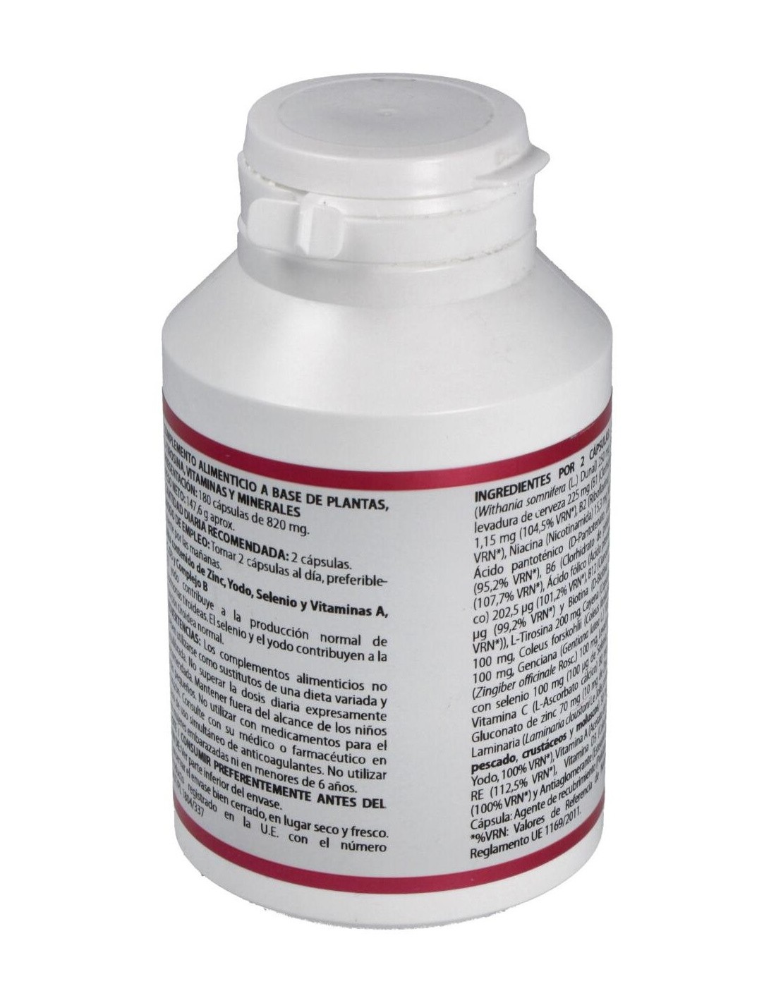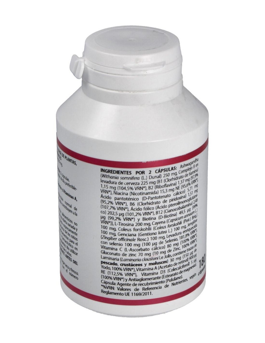 ASHWAGANDHA EXTRACTO SECO (WITHANIA SOMNÍFERA (L.) DUNAL, RAÍZ, =1,5% WHITANÓLIDOS), 125 MG; LYNSIDE® FORTE B100 (VITAMINAS DEL COMPLEJO B (VITAMINA B1 (TIAMINA CLORHIDRATO) 5.100 PPM, VITAMINA B2 (RIBOFLAVINA) 6.100 PPM, NIACINA 68.000 PPM, ÁCIDO PANTOTÉNICO (D-PANTOTENATO CÁLCICO) 25.400 PPM, VITAMINA B6 (PIRIDOXINA CLORHIDRATO) 6.700 PPM, D-BIOTINA 220 PPM, ÁCIDO FÓLICO 900 PPM, VITAMINA B12 (CIANOCOBALAMINA) 11 PPM) EN LEVADURA DE CERVEZA), 112,5 MG; L-TIROSINA, 100 MG; CAYENA POLVO (CAPSICUM ANNUUM L., FRUTO, 0,4% CAPSAICINOIDES TOTALES EXPRESADOS COMO CAPSAICINA), 50 MG; COLEUS FORSKOHLII EXTRACTO SECO (COLEUS FORSKOHLII (POIR.) BRIQ., PARTES AÉREAS, >10% FORSKOLINA), 50 MG; GENCIANA EXTRACTO SECO (GENTIANA LUTEA L., RAÍZ, RATIO 4:1), 50 MG; JENGIBRE EXTRACTO SECO (ZINGIBER OFFICINALE ROSCOE, RAÍZ, 5% GINGEROLES), 50 MG; LEVADURA ENRIQUECIDA CON SELENIO (1.000 PPM SELENIO), 50 MG; ASCORBATO DE CALCIO (VITAMINA C, 82,64 % ÁCIDO L-ASCÓRBICO), 48,4 MG; GLUCONATO DE ZINC (14,35% ZINC), 35 MG; KELP EXTRACTO SECO (LAMINARIA DIGITATA (HUDS.) J.V.LAMOUR., TALO, 1% YODO), 7,5 MG; ACETATO DE RETINOL (VITAMINA A, 150 µG RE/MG), 3 MG; COLECALCIFEROL (2,5 µG VITAMINA D3/MG), 1 MG. EXCIPIENTE TECNOLÓGICO: ESTEARATO DE MAGNESIO (ANTIAGLOMERANTE), C.S. ENVOLTURA: POLISACÁRIDO DE ORIGEN VEGETAL (PULULANO).