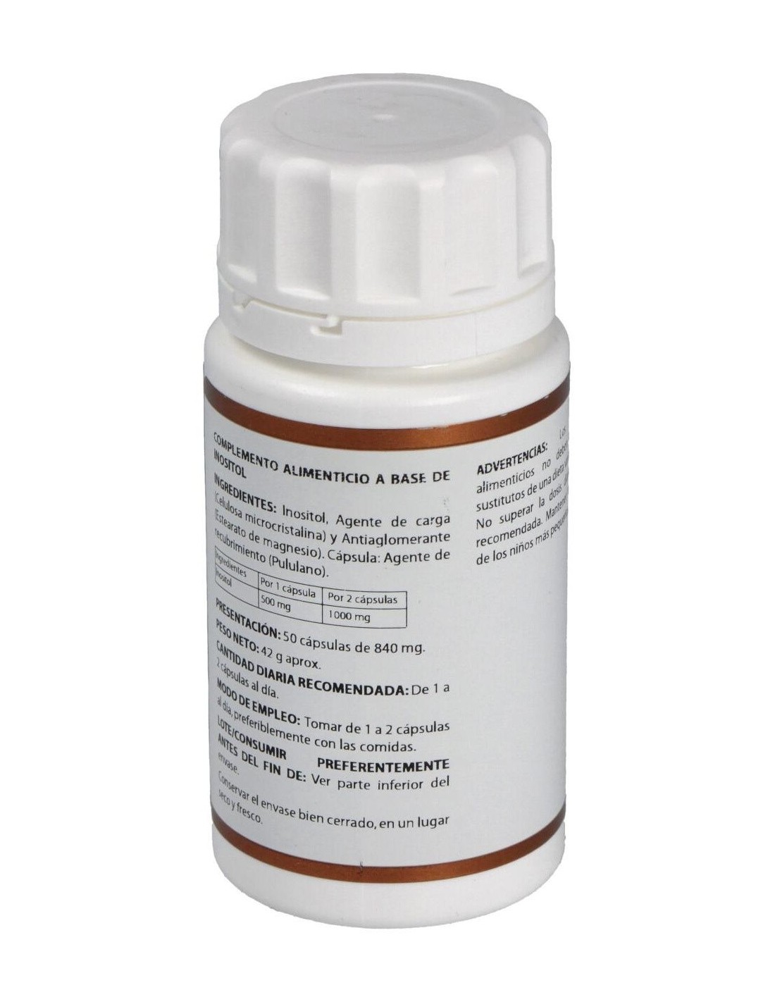 El inositol es abundante en el cerebro y puede estar relacionado con la transmisión sináptica. También podría estar implicado en la depresión. Las personas con depresión tienen niveles bajos de inositol en su fluido espinal y además el inositol participa en la acción de la serotonina, neurotransmisor directamente relacionado con la depresión.Ingredientes activos por cápsula:500 mg de inositol.Modo de empleo:Tomar de 1 a 2 cápsulas al día, preferiblemente con las comidas.Presentación:Bote de 50 cápsulas.