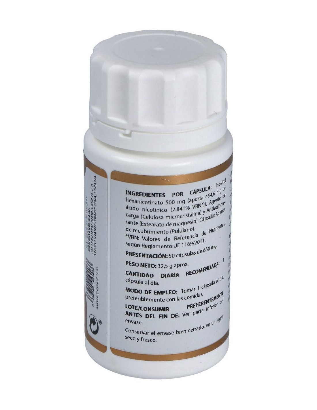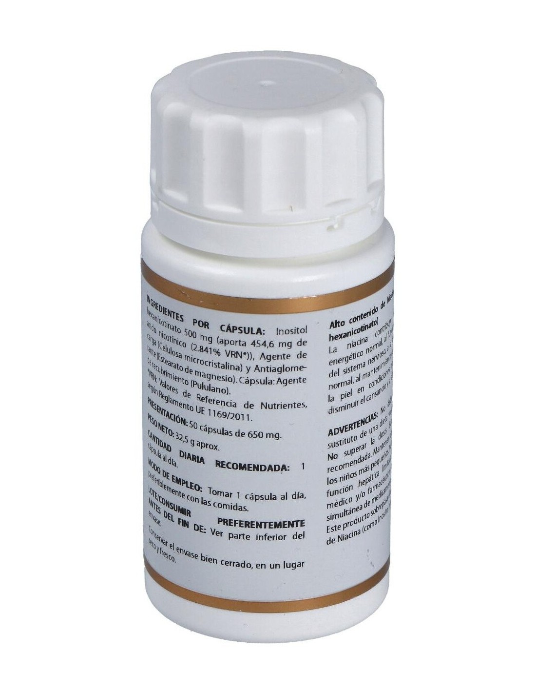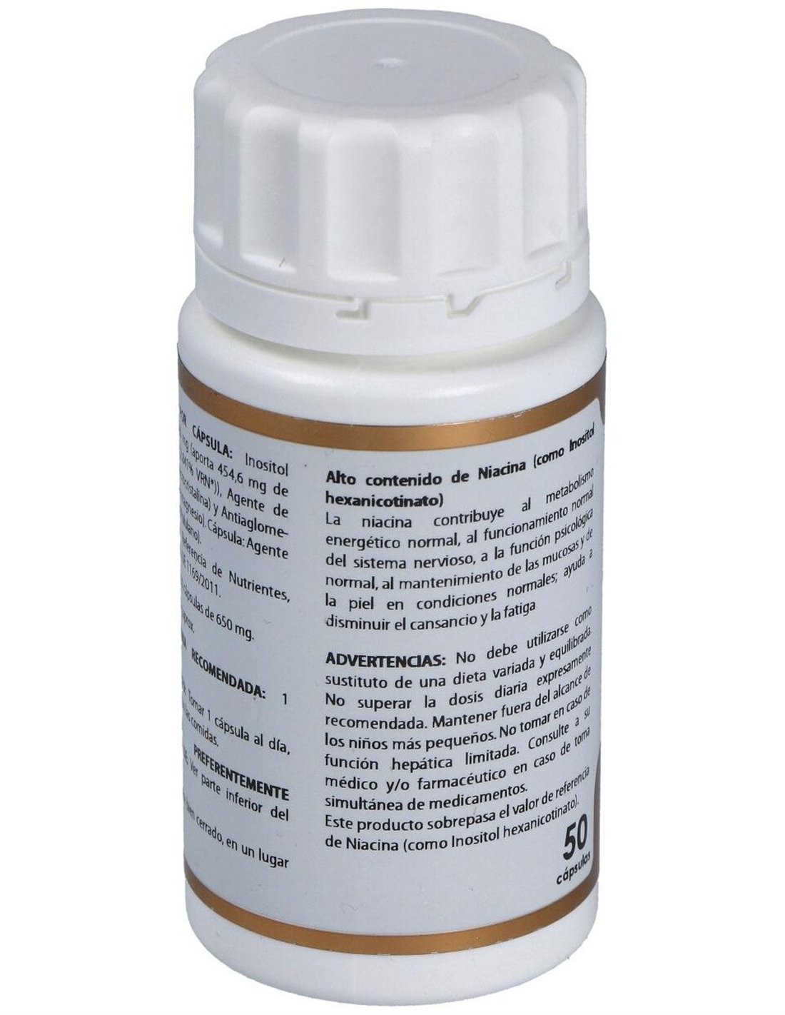 La niacina contribuye al metabolismo energético normal, al funcionamiento normal del sistema nervioso, a la función psicológica normal, al mantenimiento de las mucosas y de la piel en condiciones normales; ayuda a disminuir el cansancio y la fatiga.Ingredientes activos por cápsulas:500 mg de inositol hexanicotinato (aporta 452 mg de niacina y 48 mg de inositol).Modo de empleo:Tomar 1 cápsula al día, preferiblemente con las comida.Presentación:Bote de 50 cápsulas.