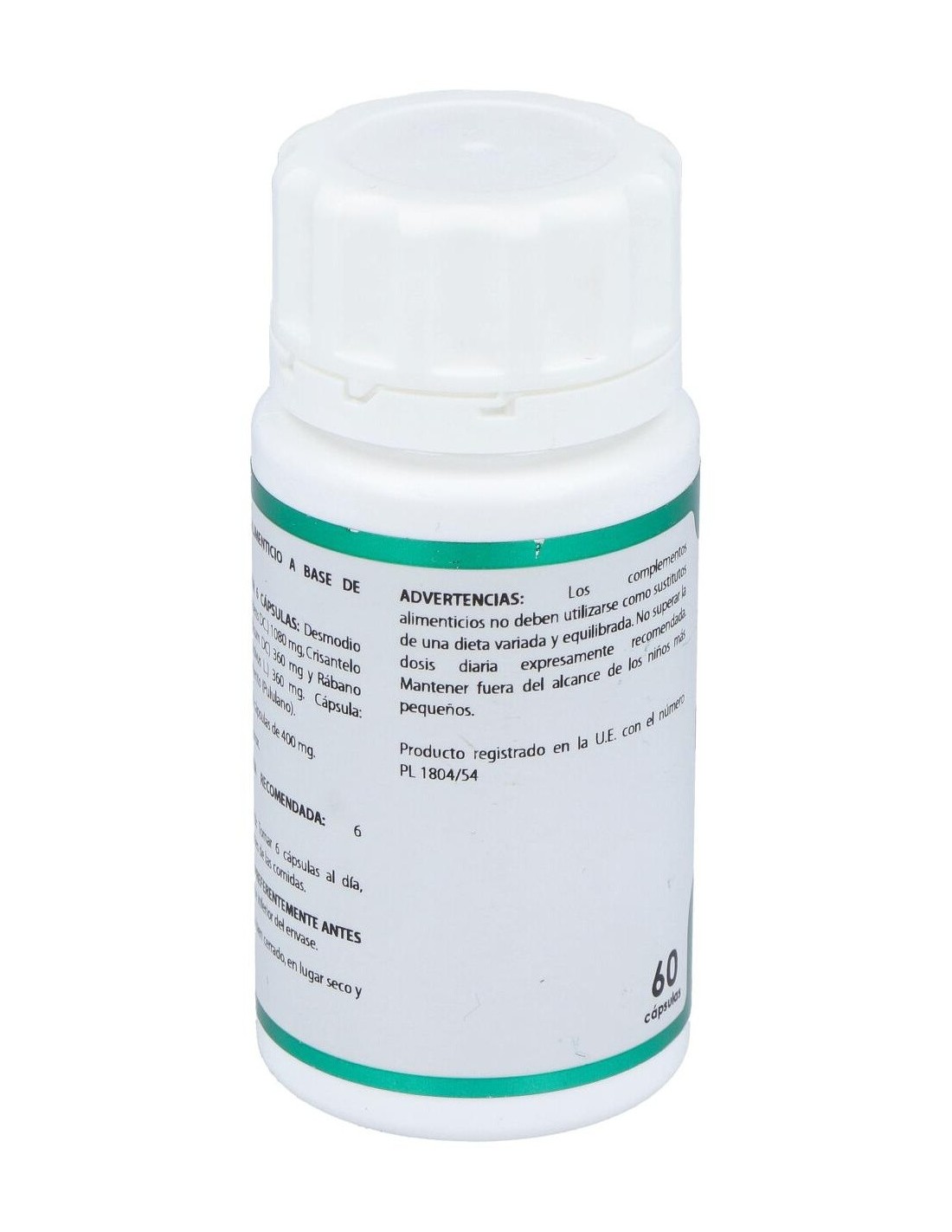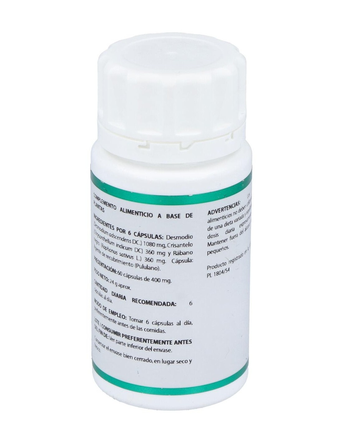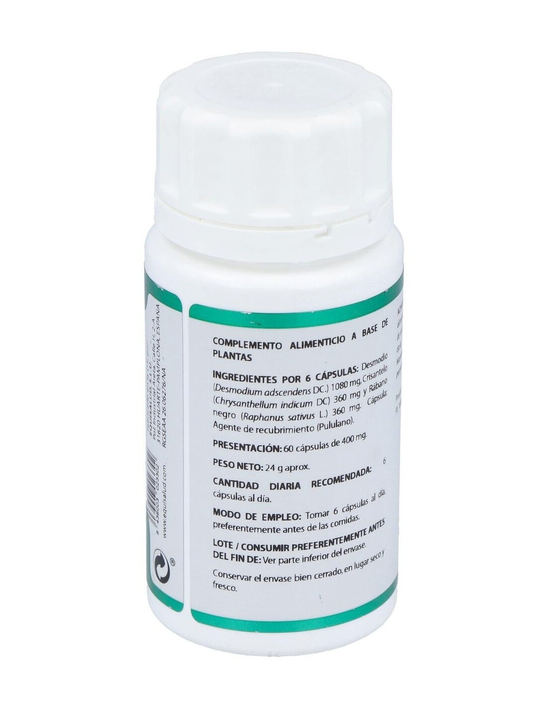 Composición:Crisantemo extracto nebulizado (Chrysantemum indicum, parte aérea, >3% flavonoides), 60 mg; desmodio polvo (Desmodium ascendens, hoja), 180 mg; rábano negro polvo (Raphanus sativus, raíz, > 0,0025 % glucosinolatos), 60 mg. Modo de empleo:Tomar 6 cápsulas al día, preferentemente antes de las comidas. Presentación:Envase de 60 cápsulas.
