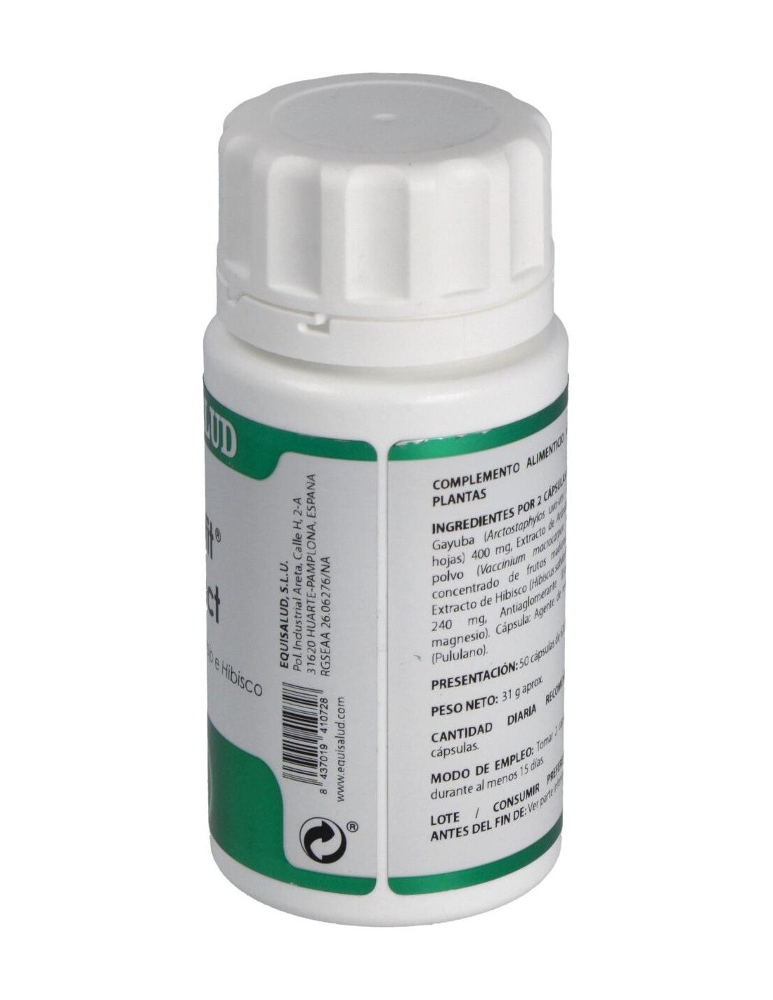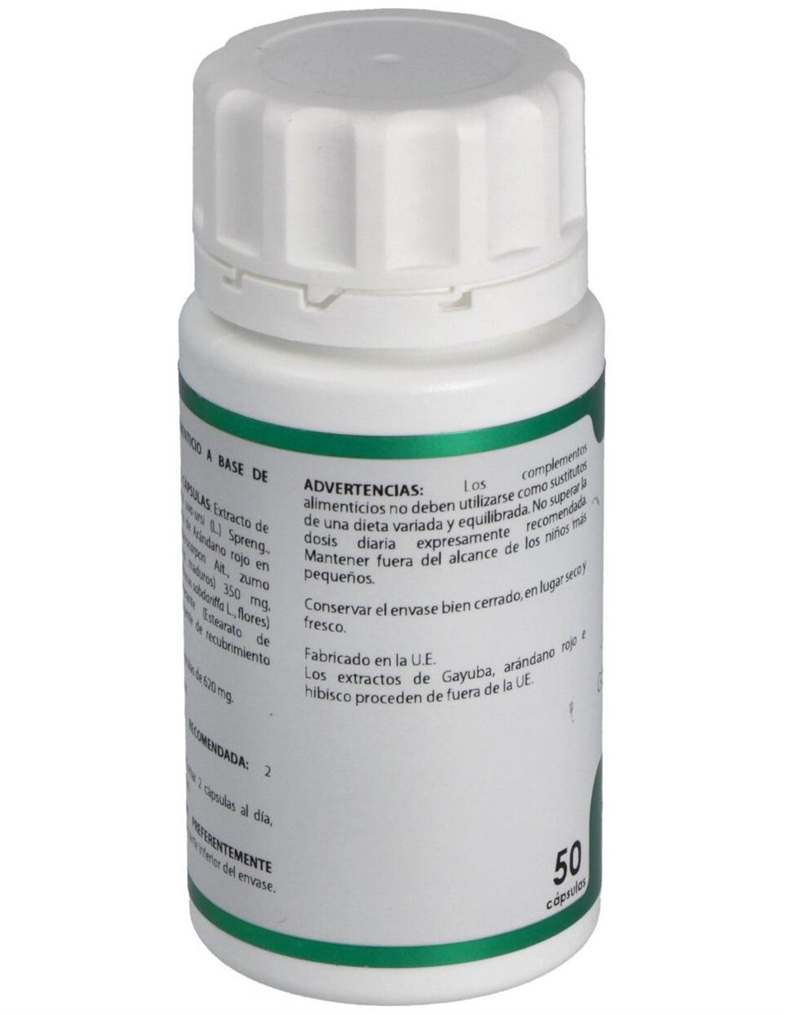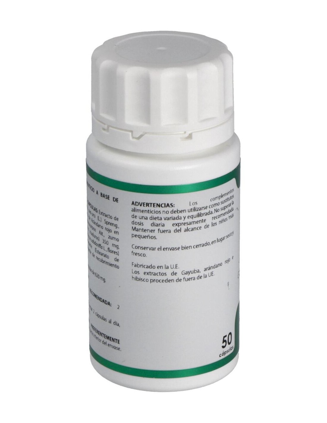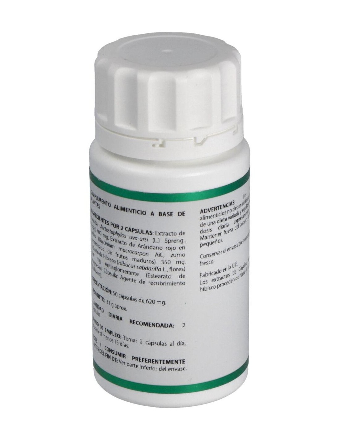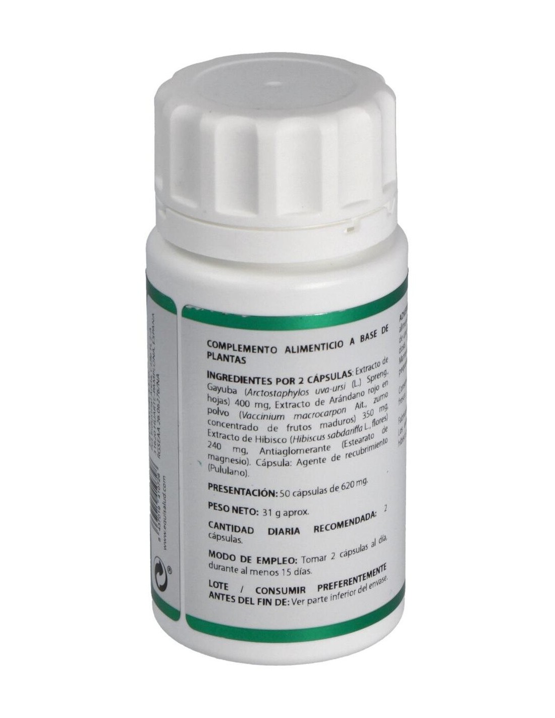 Gayuba extracto seco (Arctostaphylos uva-ursi (L.) Spreng.), 200 mg: arándano rojo extracto en polvo (Vaccinium macrocarpon Ait.), 175 mg: hibisco extracto seco (Hibiscus sabdariffa L.), 120 mg. Envoltura: polisacárido de origen vegetal (pululano).