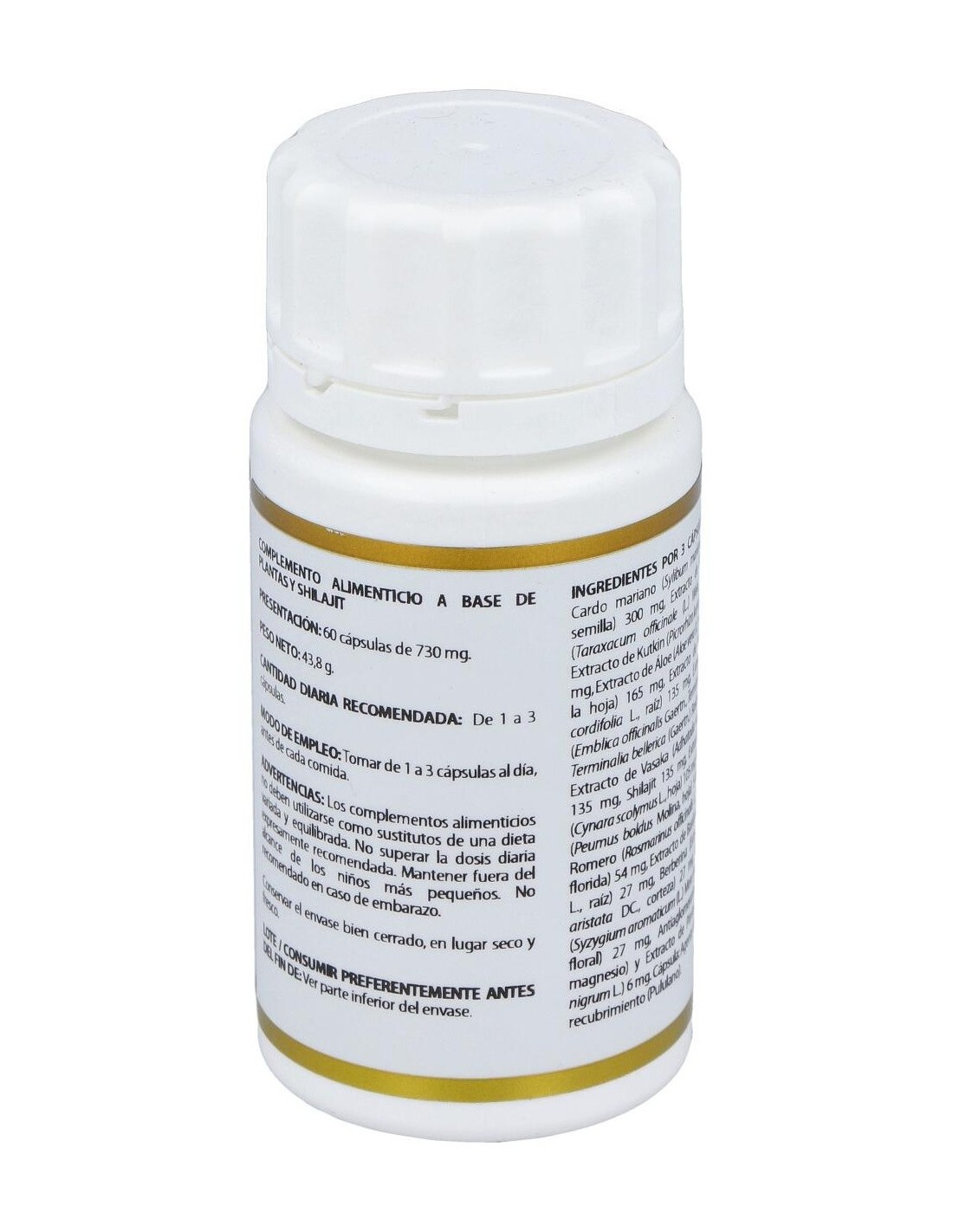 Cardo mariano extracto seco (Silybum marianum (L.) Gaertn., semilla, 80% silimarina, 30% silibina + isosibilina), 100 mg: diente de león extracto seco (Taraxacum officinale (L.) Web., raíz, 2% inulina), 100 mg: kutkin extracto seco (Picrorhiza kurroa Royle, raíz, 5% kutkina), 70 mg: aloe extracto seco (Aloe vera (L.) Burm. f., pulpa de la hoja, ratio 200:1), 55 mg: manjistha extracto seco (Rubia cordifolia L., raíz, ratio 10:1), 45 mg: triphala extracto seco (Emblica officinalis Gaertn., Terminalia chebula Retz., Terminalia bellerica (Gaertn.) Roxb., frutos, 30% taninos, ratio 20:1), 45 mg: vasaka extracto seco (Adhatoda vasica Nees, hojas, ratio 4:1), 45 mg: PrimaVie® (shilajit purificado, >50% ácidos fúlvicos, > 10,3% Dibenzo-a-pironas más Dibenzo-a-pironas cromoproteínas), 45 mg: alcachofa extracto seco (Cynara scolymus L., hojas, 5% cinarinas), 35 mg: boldo extracto seco (Peumus boldus Molina, hojas, 0,05% boldina), 18 mg: romero extracto seco (Rosmarinus officinalis L., hoja y sumidad florida, 2% ácido rosmarínico), 18 mg: bardana extracto seco (Arctium lappa L., raíz, 0,3% ácido clorogénico), 9 mg: berberina (extracto seco de Berberis aristata DC., corteza de las ramas, 97% berberina, ratio 100:1), 9 mg: clavo polvo (Syzygium aromaticum (L.) Merr. et L.M. Perry, botón floral, 150 ml/Kg de aceite esencial), 9 mg: pimienta negra extracto seco (Piper nigrum L., fruto, 95% piperina, ratio 25:1), 2 mg. Excipiente tecnológico: estearato de magnesio (antiaglomerante), c.s. Envoltura: polisacárido de origen vegetal (pululano).