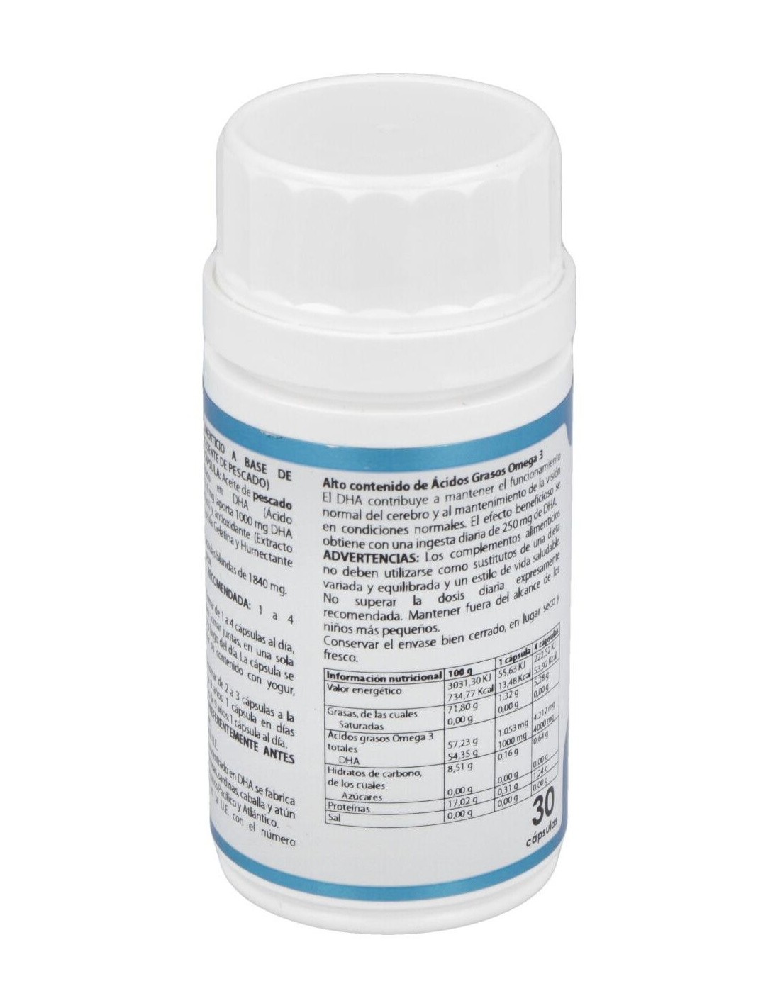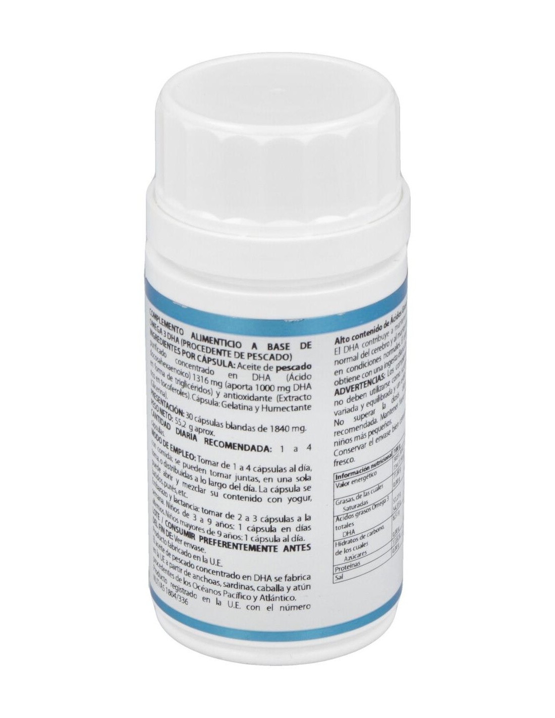 ACEITE DE PESCADO PURIFICADO CONCENTRADO EN DHA (ÁCIDO DOCOSAHEXAENOICO), 1.316 MG (APORTA 1.000 MG DHA EN FORMA DE TRIGLICÉRIDOS) Y ANTIOXIDANTE (EXTRACTO RICO EN TOCOFEROLES). ENVOLTURA: CÁPSULA DE GELATINA BLANDA. CONTIENE: GELATINA (AGENTE DE RECUBRIMIENTO), GLICERINA (HUMECTANTE) Y AGUA.