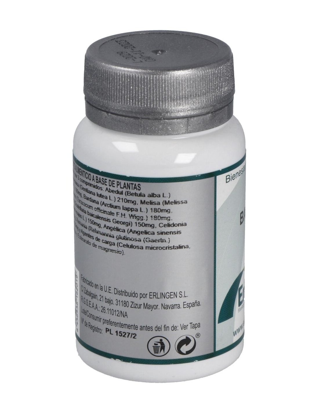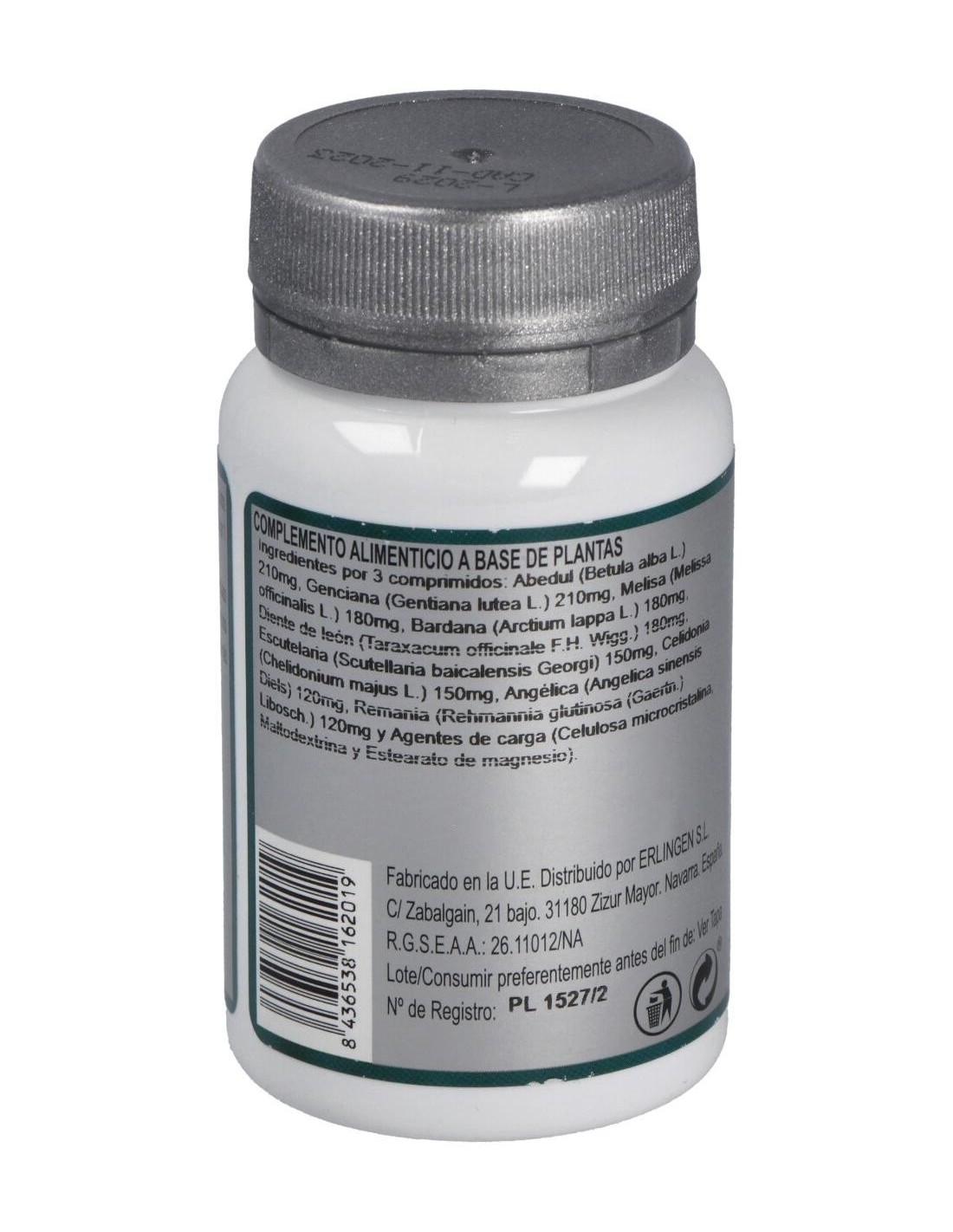 Abedul (Betula alba L.) 210 mg, Genciana (Gentiana lutea L.) 210 mg, Melisa (Melissa officinalis L.) 180 mg, Bardana (Arctium lappa L.) 180 mg, Diente de león (Taraxacum officinale F.H. Wigg.) 180 mg, Escutelaria (Scutellaria baicalensis Georgi) 150 mg, Celidonia (Chelidonium majus L.) 150 mg, Angélica (Angelica sinensis Diels) 120 mg, Remania (Rehmannia glutinosa (Gaertn.) Libosch.) 120 mg y Agentes de carga (Celulosa microcristalina, Maltodextrina y Estearato de magnesio).