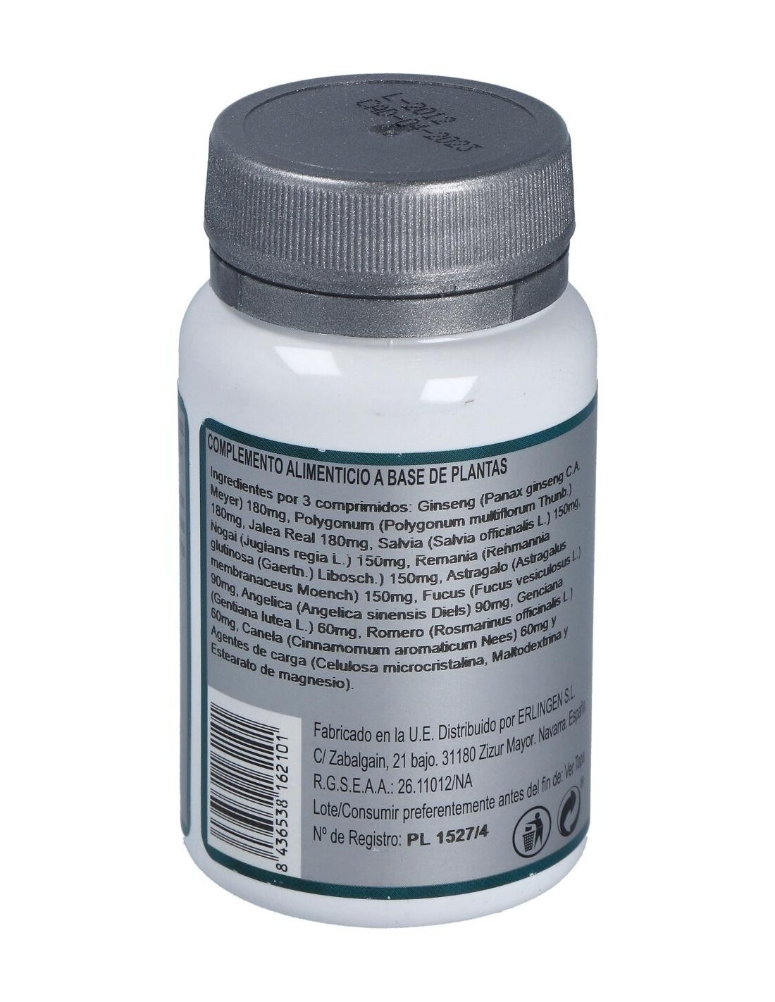Ginseng (Panax ginseng C.A. Meyer) 180 mg, Polygonum (Polygonum multiflorum Thunb.) 180 mg, Jalea Real 180 mg, Salvia (Salvia officinalis L.) 150 mg, Nogal (Juglans regia L.) 150 mg, Remania (Rehmannia glutinosa (Gaertn.) Libosch.) 150 mg, Astrágalo (Astragalus membranaceus Moench) 150 mg, Fucus (Fucus vesiculosus L.) 90 mg, Angélica (Angelica sinensis Diels) 90 mg, Genciana (Gentiana lutea L.) 60 mg, Romero (Rosmarinus officinalis L.) 60 mg, Canela (Cinnamomum aromaticum Nees) 60 mg y Agentes de carga (Celulosa microcristalina, Maltodextrina y Estearato de magnesio).
