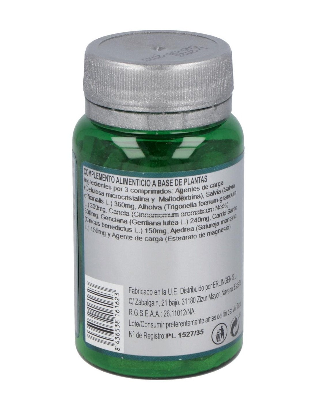 Ingredientes por 3 comprimidos: Agentes de carga (Celulosa microcristalina y Maltodextrina), Salvia (Salvia officinalis L.) 360mg, Alholva (Trigonella foenum-graecum L.) 300mg, Canela (Cinnamomum aromaticum Nees) 300mg, Genciana (Gentiana lutea L.) 240mg, Cardo Santo (Cnicus benedictus L.) 150mg, Ajedrea (Satureja montana L.) 150mg y Agente de carga (Estearato de magnesio).