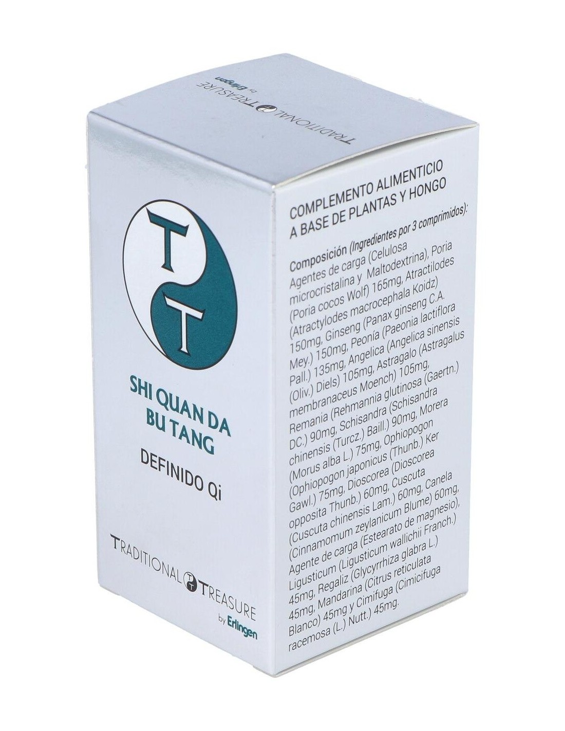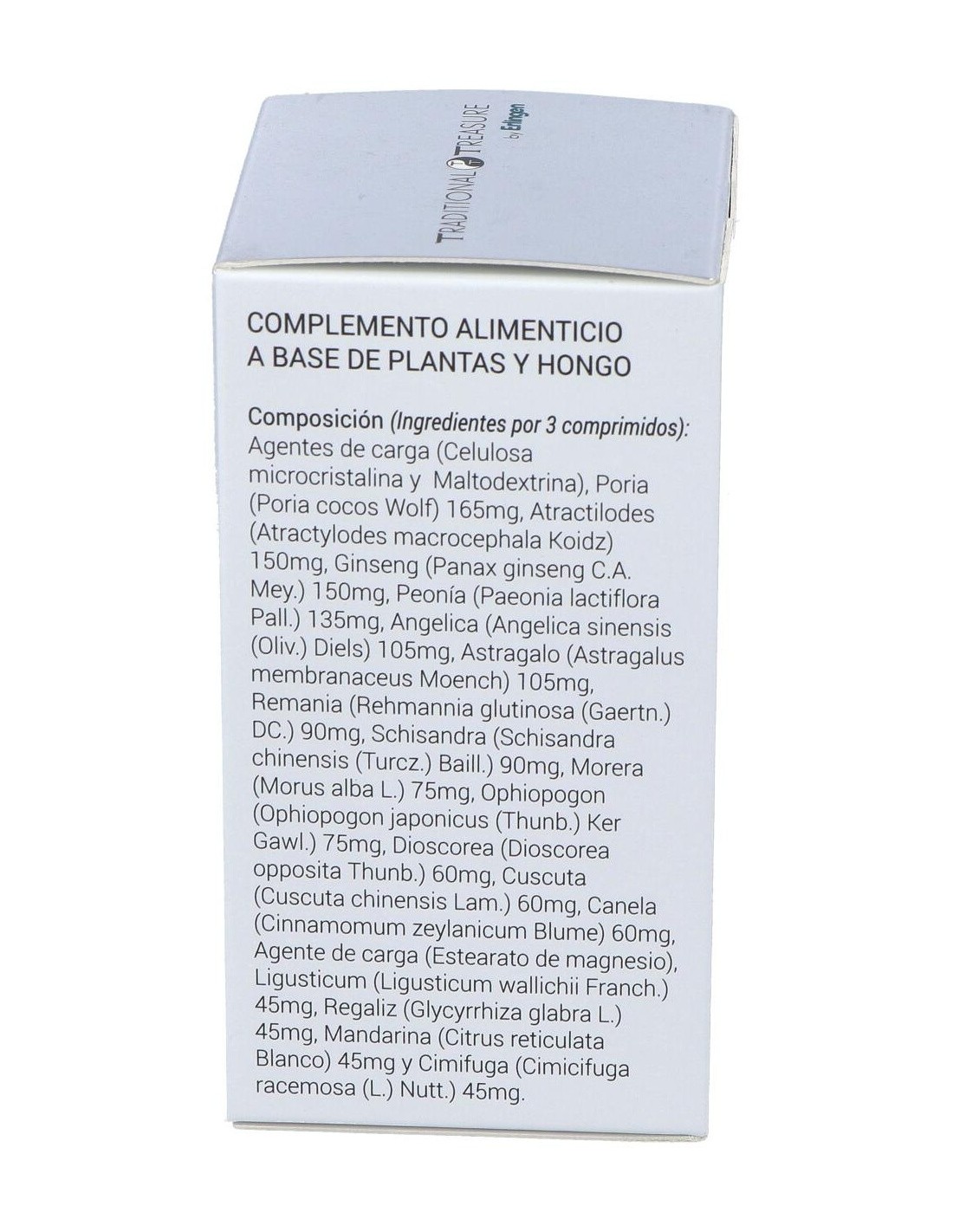 Ginseng (Panax Ginseng C.A. Meyer), Poria (Poria Cocos Wolf), Atractilodes (Atractylodes Macrocephala Koidz.), Astrágalo (Astragalus Membranaceus Moench), Angélica (Angelica Sinensis Diels), Mandarina (Citrus Reticulata Blanco), Schisandra (Schisandra Chinensis (Turcz.) Baill.), Dioscorea (Dioscorea Opposita Thunb.), Renania (Rehmannia Glutinosa (Gaertn.) Libosch.), Canela (Cinnamomum Zeylanicum Blume), Clavo (Syzygium Aromaticum L.) Merr. Et L.M. Perry), Tomillo (Thymus Vulgaris L.), Nogal (Juglans Regia L.), Genciana (Gentiana Lutea L.), Morera (Morus Alba L.), Helenio (Inula Helenium L.), Romero (Rosmarinus Officinalis L.) Y Agentes de Carga (Celulosa Microcristalina, Maltodextrina Y Estearato de Magnesio).