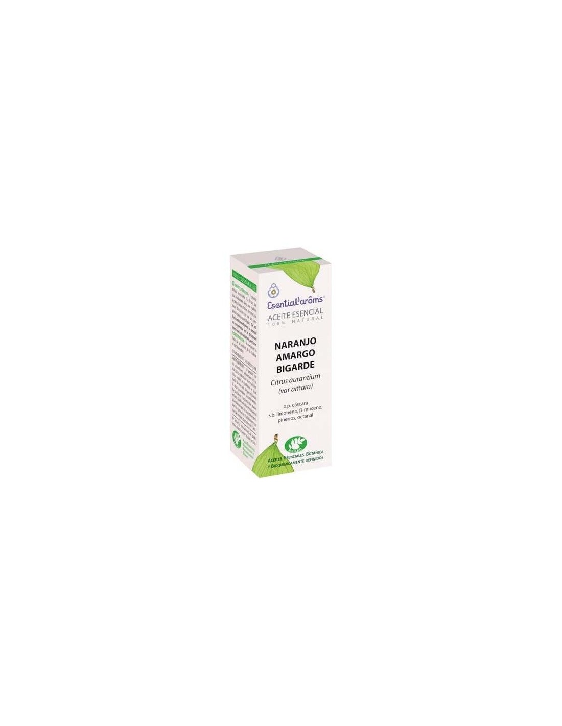 Esential Aroms Esencia Naranjo Amargo Hoja 10ml es un aceite 100% natural con la denominación de Aceite Esencial Botánica y Bioquímicamente Definido (A.E.B.B.D.) garantizando la seguridad, trazabilidad, eficacia y estabilidad bioquímica de ECOCERT, y que está indicado para ejercer una serie de propiedades beneficiosas en el organismo. El aceite esencial de hojas de naranjo amargo contribuye a rebajar procesos de estrés y tranquiliza las emociones, mejora la microcirculación cutánea, regula la transpiración, y gracias a su aroma cítrico, es ideal para hacer masajes antiestrés, mejorando las contracturas musculares debidas a la tensión emocional.