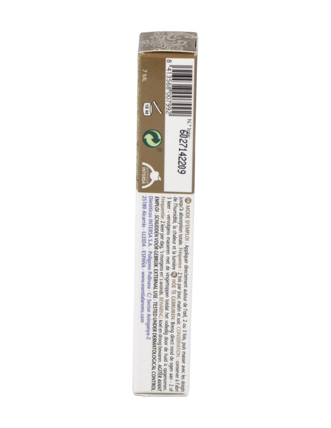 Ingredientes (INCI):Argania Spinosa Kernel Oil, Triticum Vulgare (Wheat) Germ Oil, Helianthus Annuus (Sunflower) Seed Oil, Daucus Carota (Carrot) Root Extract, Simmondsia Chinensis (Jojoba) Seed Oil, Cymbopogon Martini Oil, Santalum Album Wood Oil, Santalum Australocaledonicum Wood Oil, Cananga Odorata Flower Oil, Daucus Carota (Carrot) Seed Oil, / Geraniol* / Linaloo|* / Benzyl Benzoate*/Pharnesol*/Benzyl Salicylate*/Citral*/Limonene*/ Citronellol*/Methyleugenol*. (*) Ingredientes no añadidos, contenidos en el aceite esencial.Modo de empleo:Aplicar directamente sobre contorno de ojos, 2 ó 3 veces mañana y noche, luego masajear con los dedos hasta su total absorción.Presentación:Envase de 7 ml.Recomendaciones y advertencias:No contiene colorantes, aromas artificiales ni productos químicos.