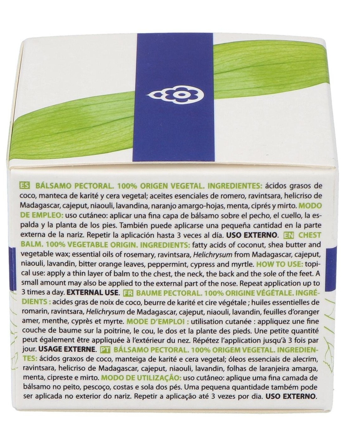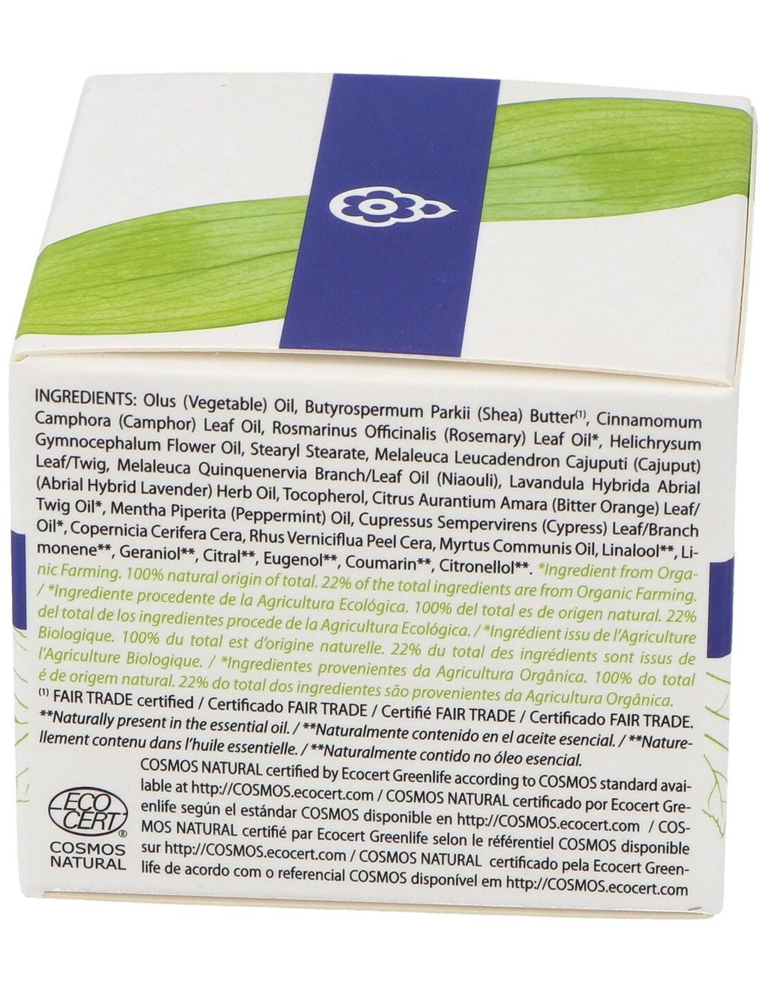 INCI: Olus (Vegetable) Oil, Butyrospermum Parkii (Shea) Butter(1), Cinnamomum Camphora (Camphor) Leaf Oil, Rosmarinus Officinalis (Rosemary) Leaf Oil*, Helichrysum Gymnocephalum Flower Oil, Stearyl Stearate, Melaleuca Leucadendron Cajuputi (Cajuput) Leaf/Twig, Melaleuca Quinquenervia Branch/Leaf Oil (Niaouli), Lavandula Hybrida Abrial (Abrial Hybrid Lavender) Herb Oil, Tocopherol, Citrus Aurantium Amara (Bitter Orange) Leaf/Twig Oil*, Mentha Piperita (Peppermint) Oil, Cupressus Sempervirens (Cypress) Leaf/Branch Oil*, Copernicia Cerifera Cera, Rhus Verniciflua Peel Cera, Myrtus Communis Oil, Linalool**, Limonene**, Geraniol**, Citral** (Geranial + Neral)**, Eugenol**, Coumarin**, Citronellol**.