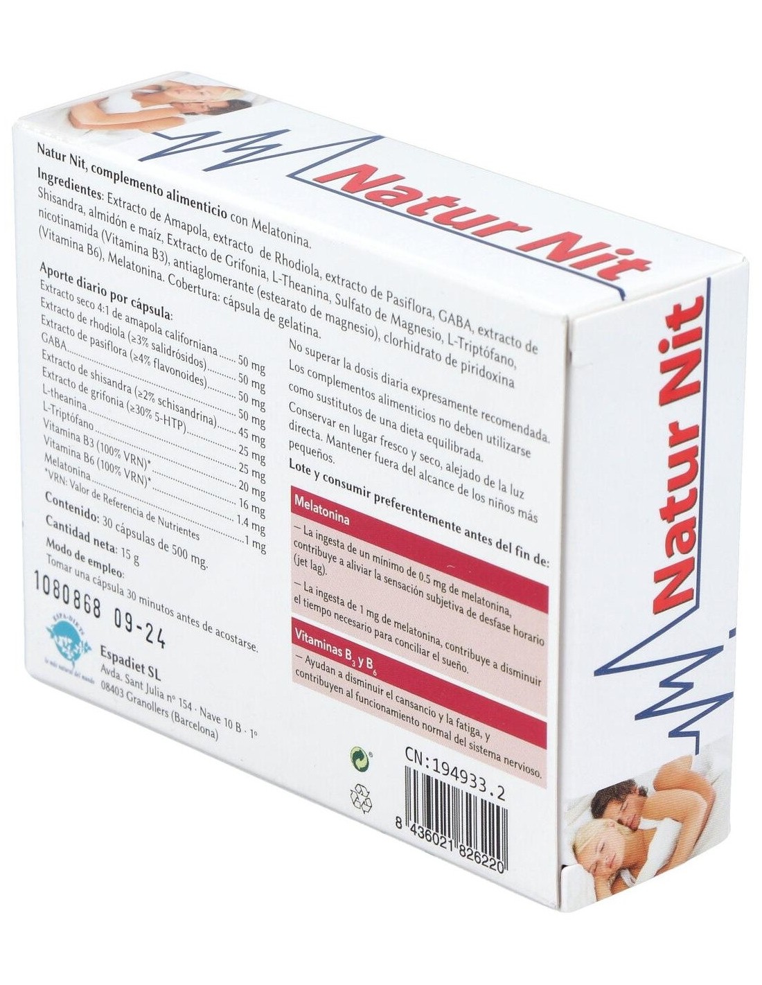 Natur Nit 30Cap. de Espadiet es un complemento diseñado para personas que buscan apoyar su bienestar diario mediante ingredientes seleccionados cuidadosamente. Es adecuado para quienes desean incorporar un producto con formulación natural dentro de su rutina habitual.