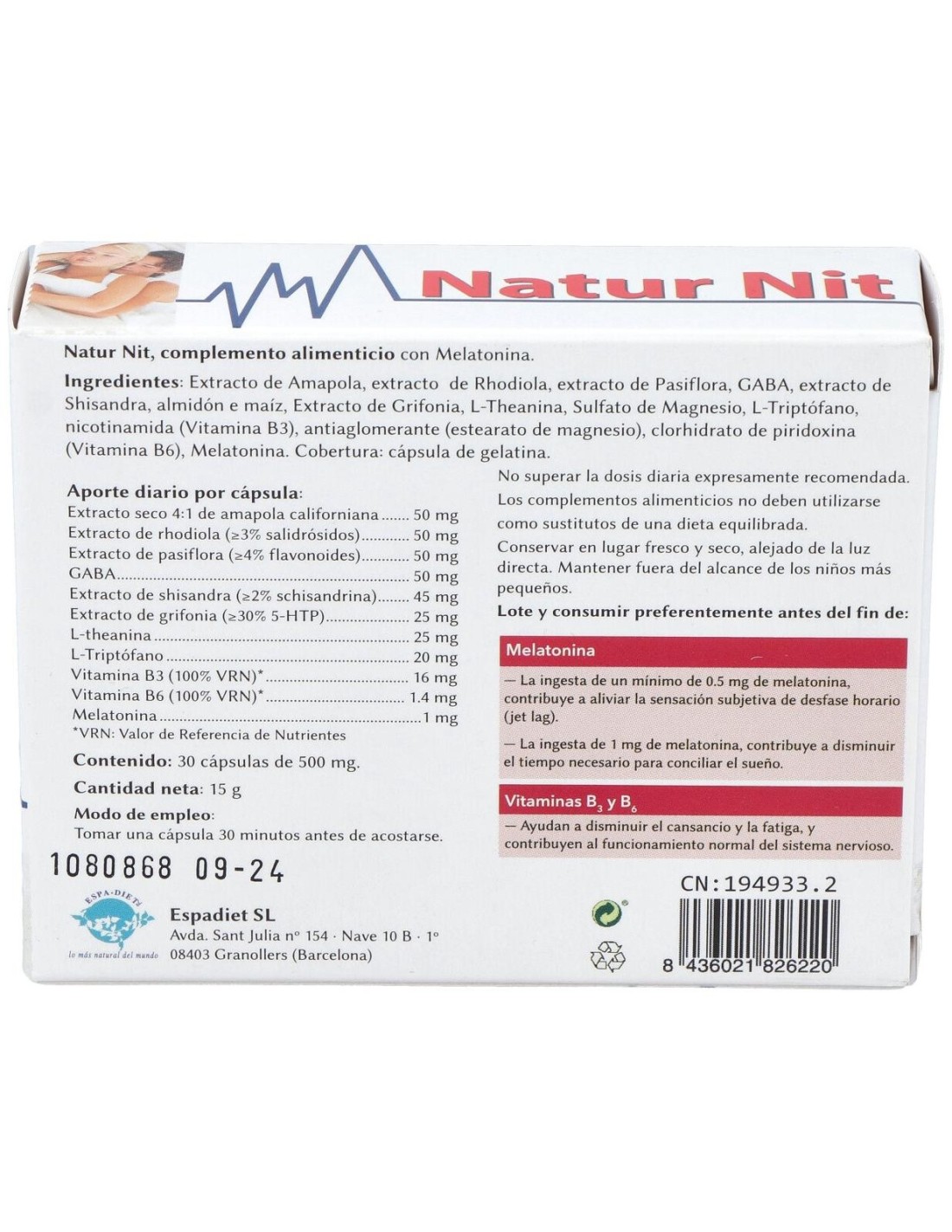 Natur Nit 30Cap. de Espadiet ofrece una opción práctica y natural para quienes desean apoyar su bienestar con un producto formulado con ingredientes seleccionados y presentados en una forma cómoda de consumir.