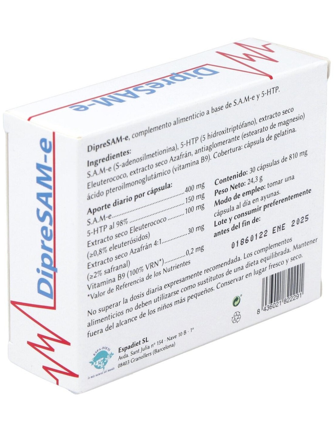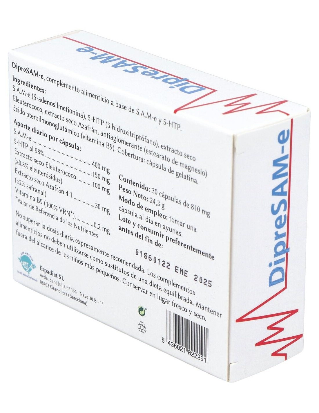 ESPADIETDipresam-E 30Cap. de Espadiet es un complemento alimenticio para personas que buscan apoyar su bienestar emocional. Con ingredientes seleccionados, contribuye a mantener el equilibrio natural del estado de ánimo.