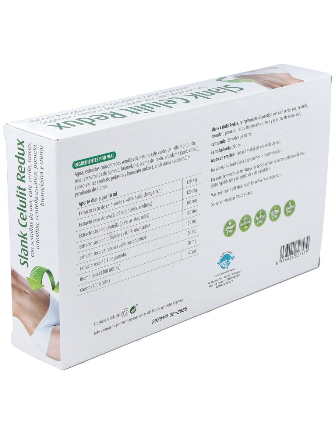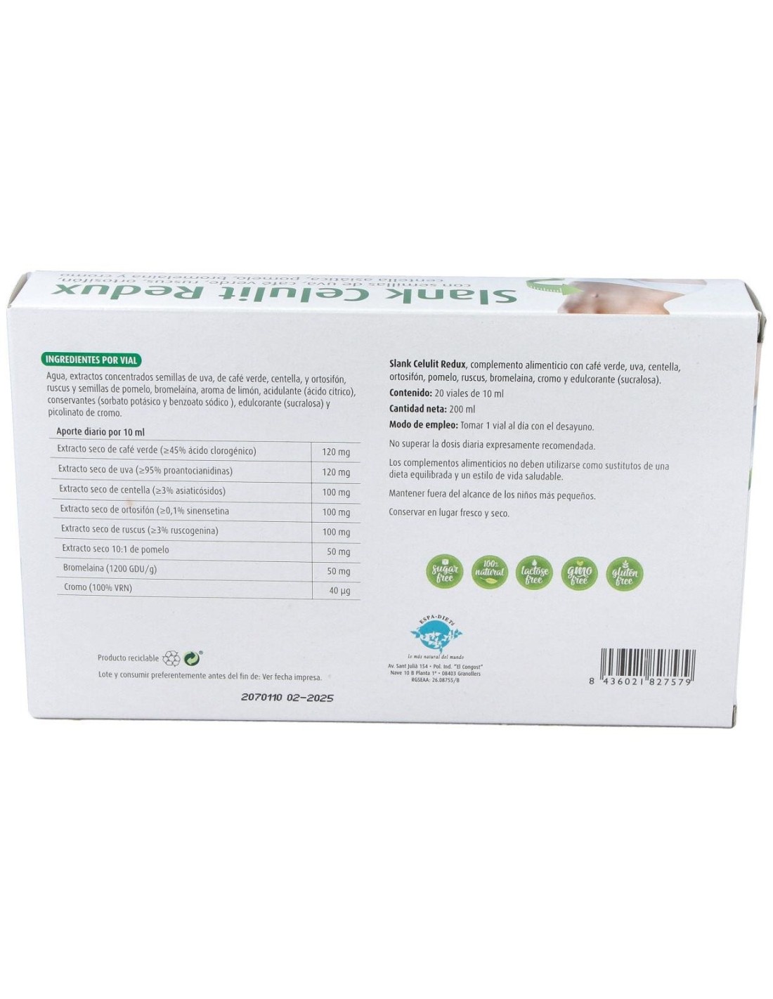 Slank Celulit Redux 20Viales de Espadiet es un complemento diseñado para personas que buscan apoyar el cuidado corporal con una fórmula específica en formato vial. Este producto está pensado para quienes desean integrar un tratamiento práctico y dosificado dentro de su rutina diaria.