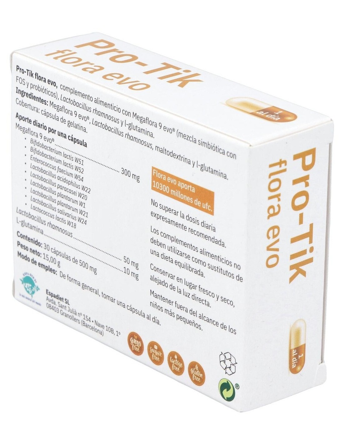 ESPADIETEl Pro-Tik Flora Evo 30Cap. de Espadiet es un suplemento nutricional para personas que buscan apoyar su bienestar digestivo, formulado con ingredientes que contribuyen al equilibrio de la flora intestinal.
