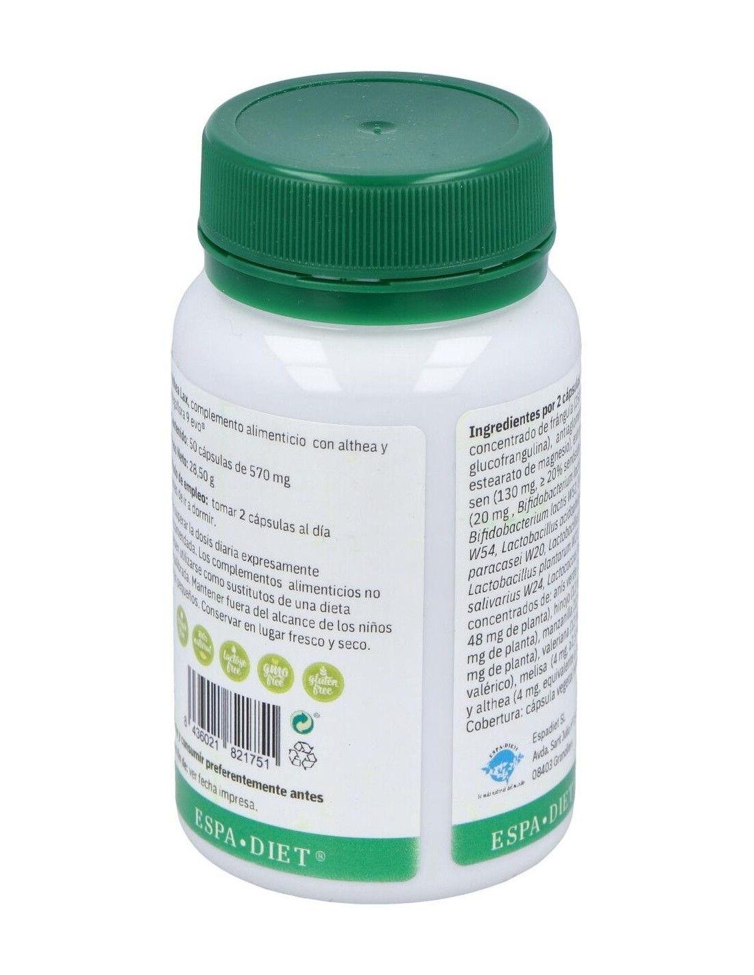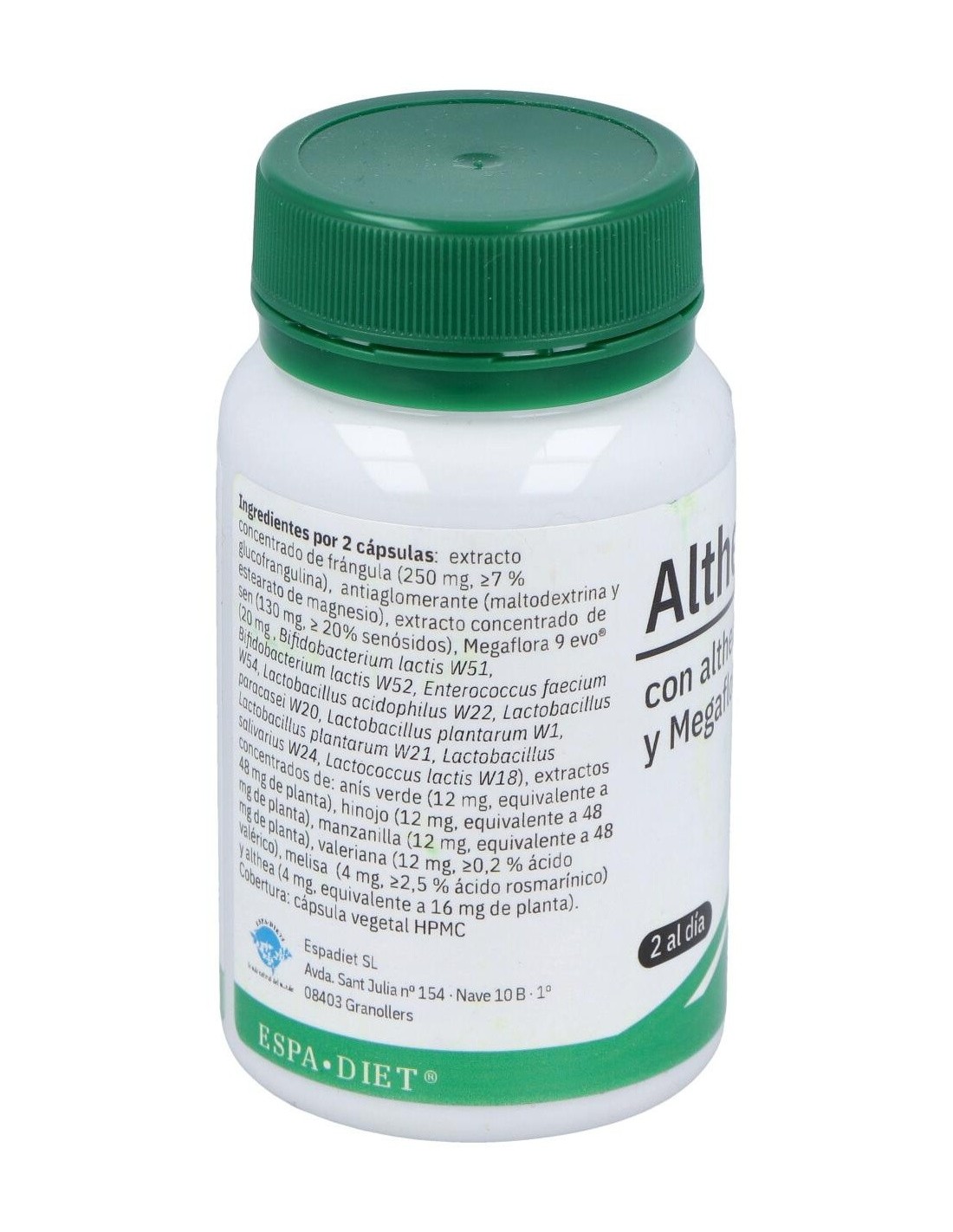 Extracto concentrado de frángula, extracto concentrado de sen, Megaflora 9 EVO®, extracto concentrado de anís verde,extracto concentrado de manzanilla, extracto concentrado de valeriana, extracto concentrado de melisa, extracto concentrado de althea. Cobertura: cápsula celulosa vegetal HPMC.