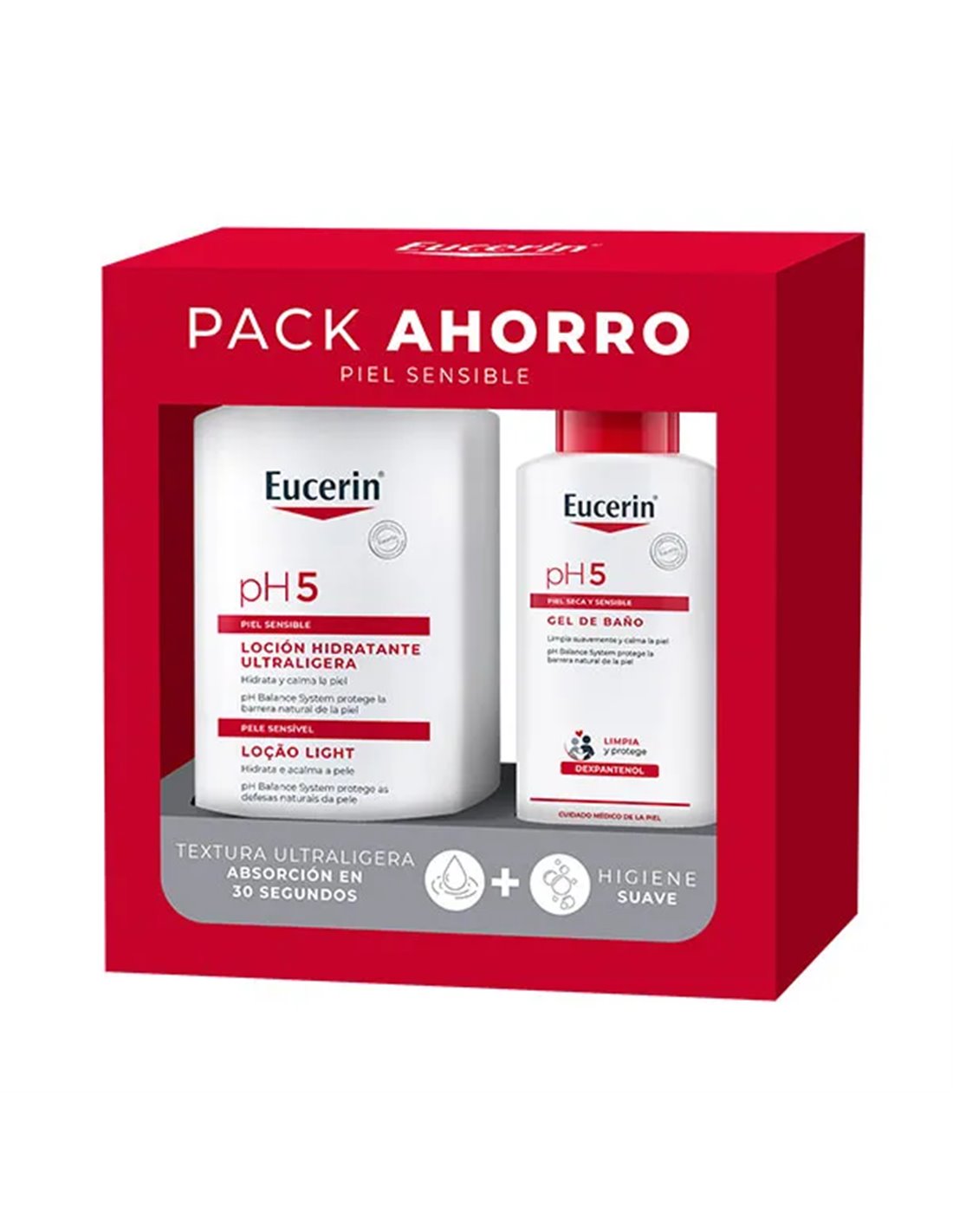 EUCERINEUCERIN Pack Rutina Ultraligera de Loción 1L + Gel 200 ml\ Loción corporal de textura ultraligera para el cuidado diario de la piel sensible. Hidrata, regenera y protege frente a los agentes externos que dañan e irritan la piel de toda la familia para hacerla más resistente y menos sensible. Absorción rápida en 30 segundos. El gel de baño para la higiene corporal y facial de la piel sensible, indicado para el uso diario. Su fórmula con Dexpantenol y pH Balance system, limpia suavemente, calma la piel, preserva la barrera natural de la piel y la protege de la deshidratación.