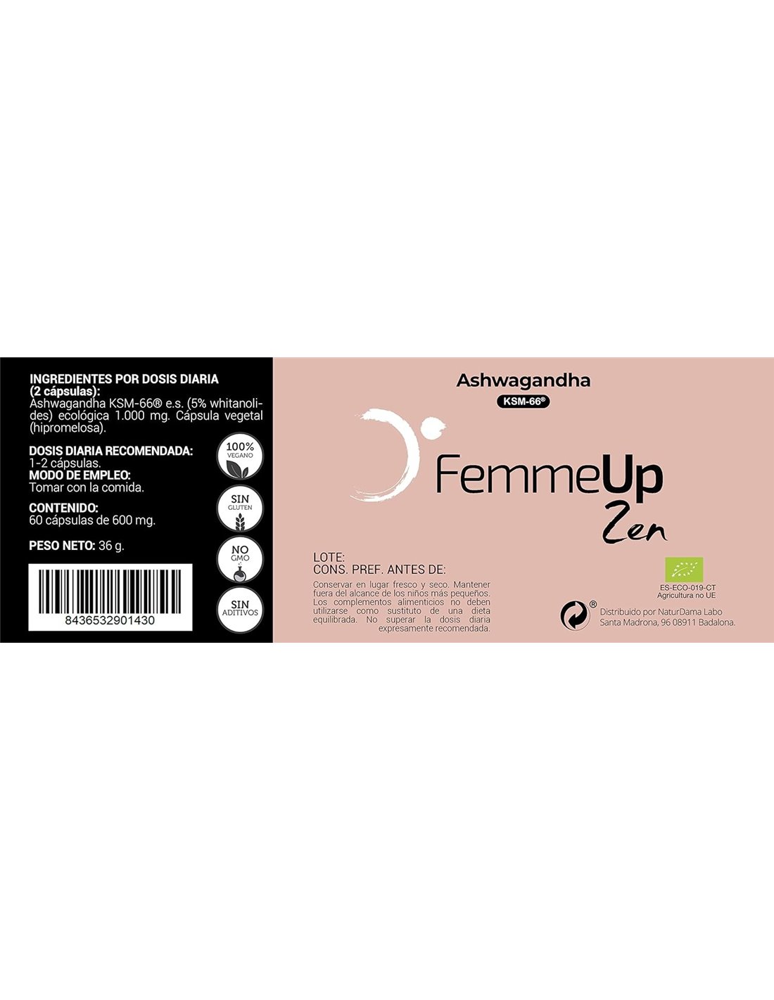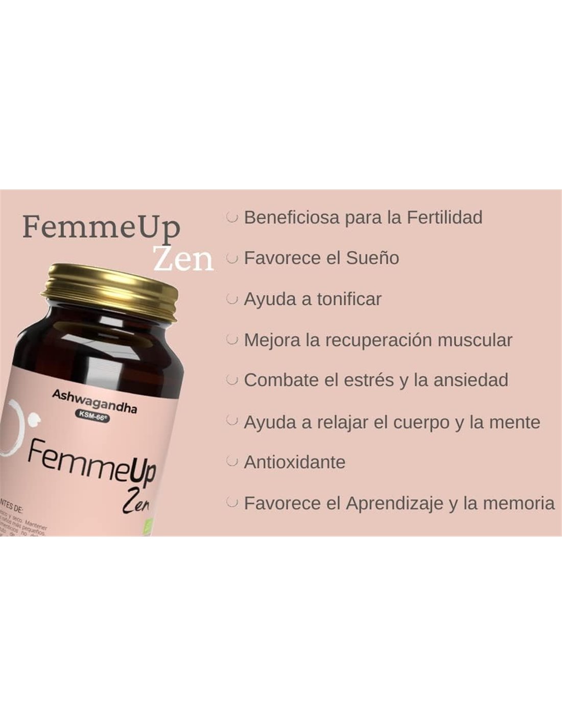FEMMEUPEste complemento alimenticio sin aditivos contiene Ashwagandha KSM-66, una planta utilizada en la medicina tradicional, que viene de un pequeño arbusto originario de la India y el norte de África. La mayoría de los beneficios de esta planta adaptógena se atribuyen a su alta concentración de withanólidos, que ayudan a mantener la concentración y las funciones cognitivas. Producto 100% vegano.