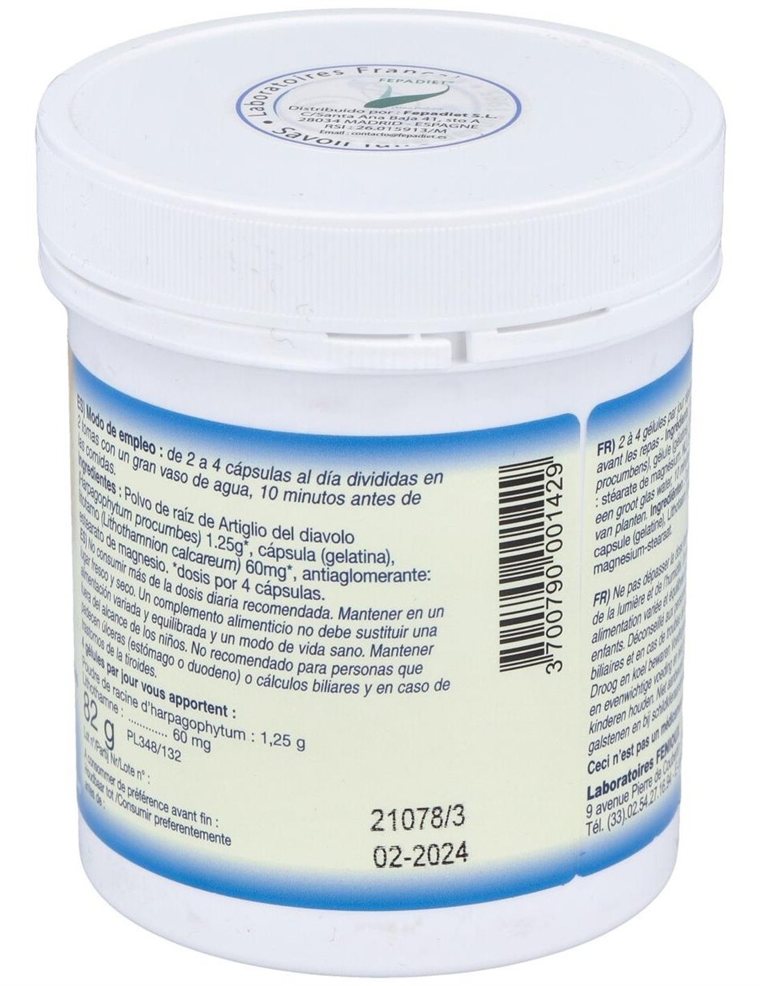 312 mg de polvo criotriturado de raíz de harpagofito (5% harpagósidos).