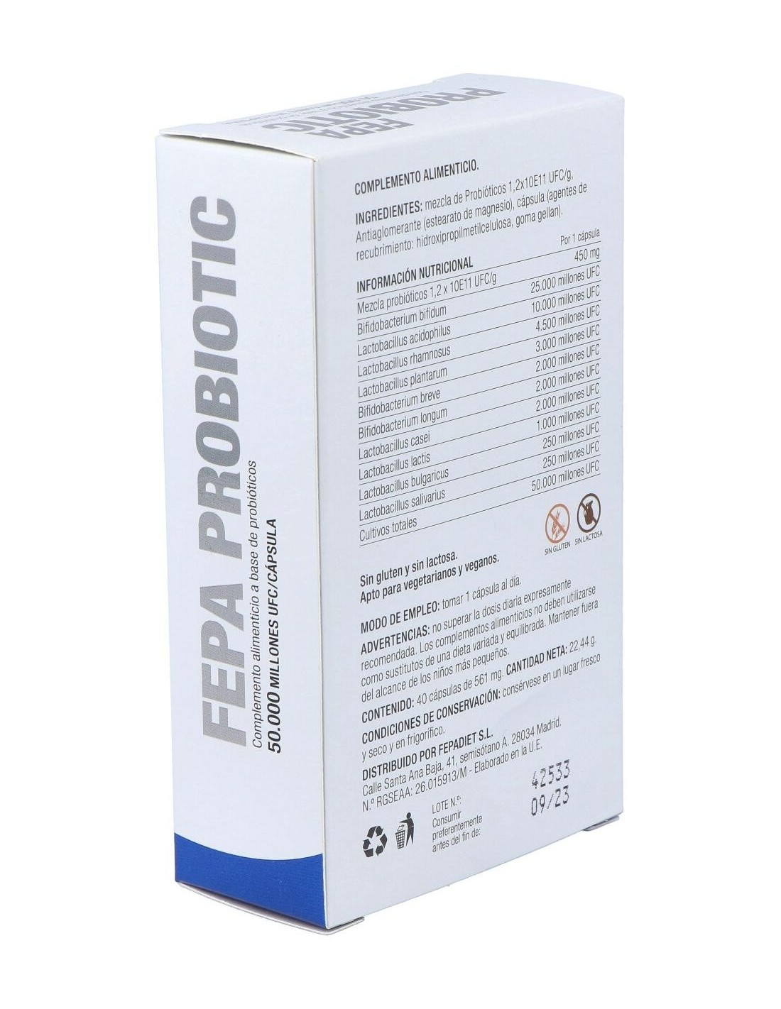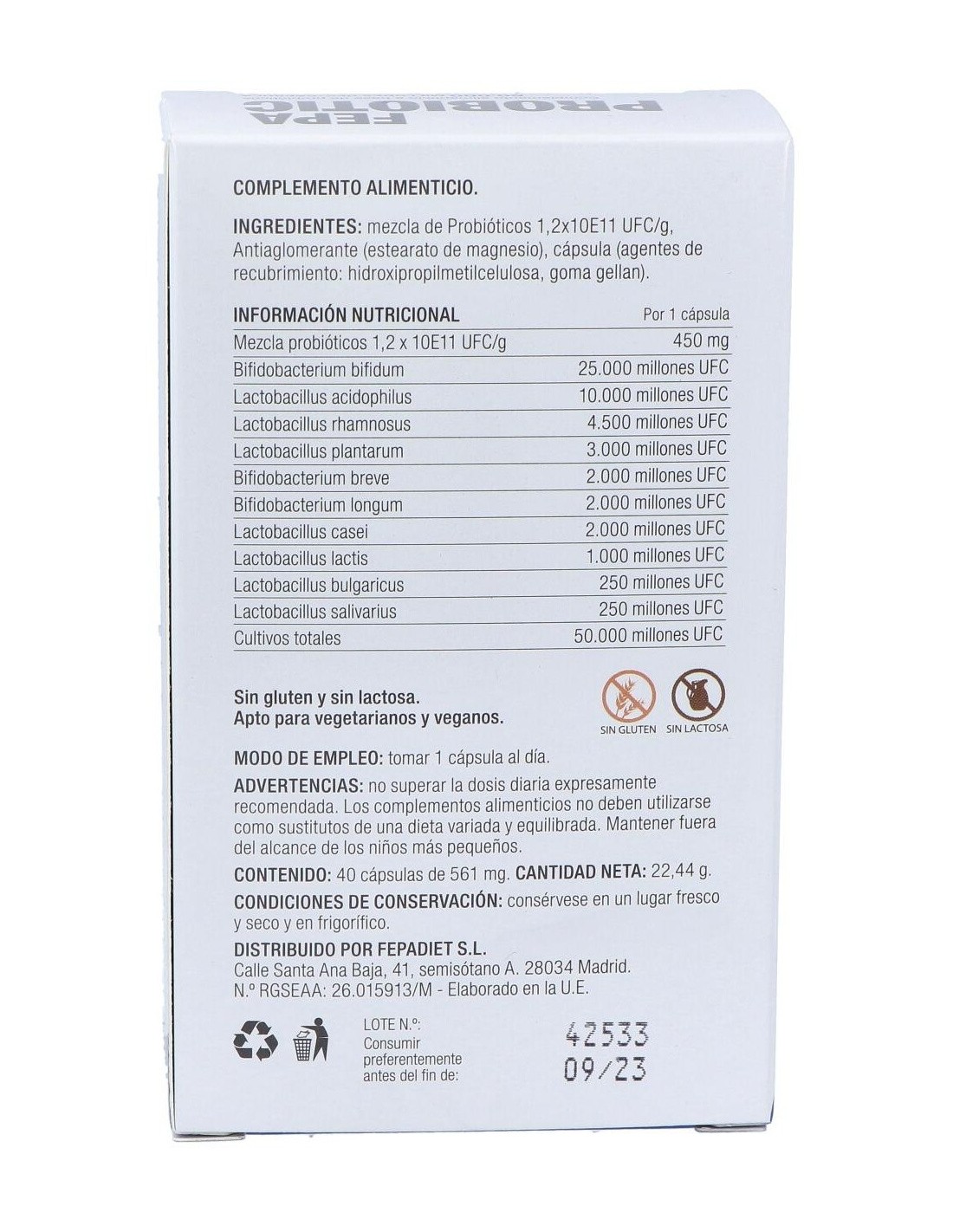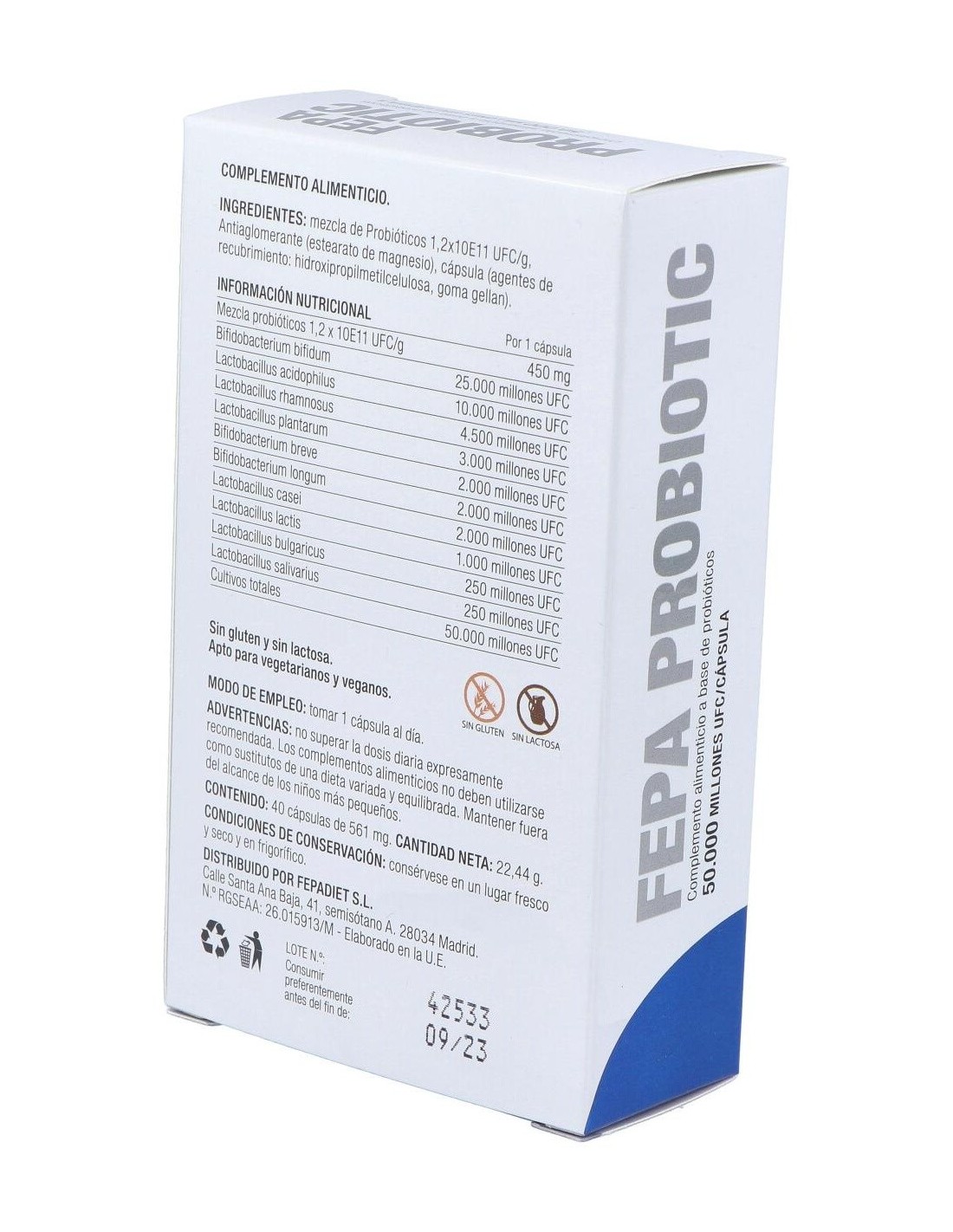 Las cápsulas de Fepa-Probiotic están elaboradas con ingredientes seleccionados para asegurar una adecuada conservación de los microorganismos beneficiosos. Su formato en envase compacto permite un almacenamiento sencillo y cómodo, ideal para quienes buscan una opción práctica para el cuidado digestivo.